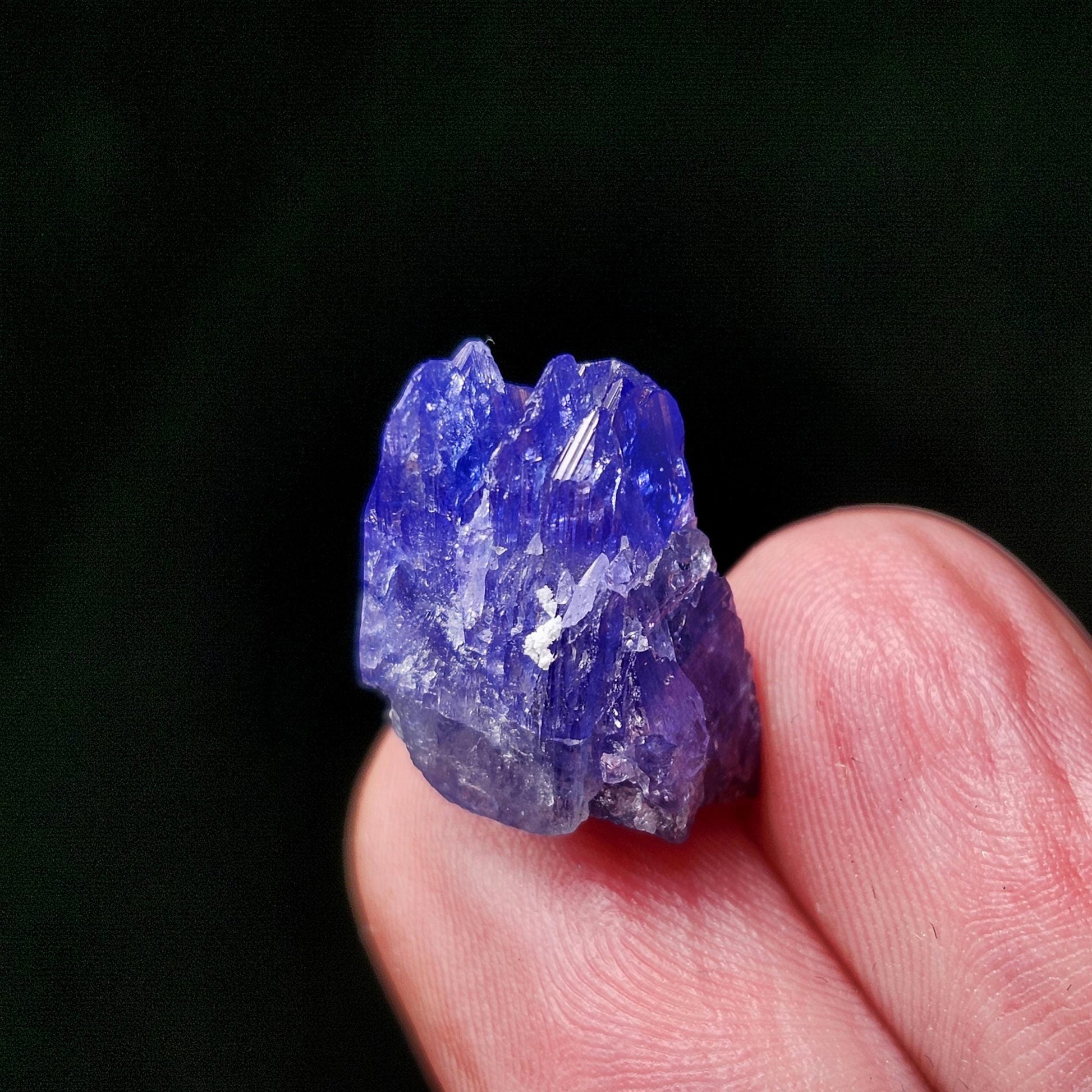 This terminated Tanzanite gemstone exhibits a deep indigo-blue coloring with distinct striations and a gemmy translucence. This specimen measures approximately 16mm by 12mm and weighs 3 grams.
