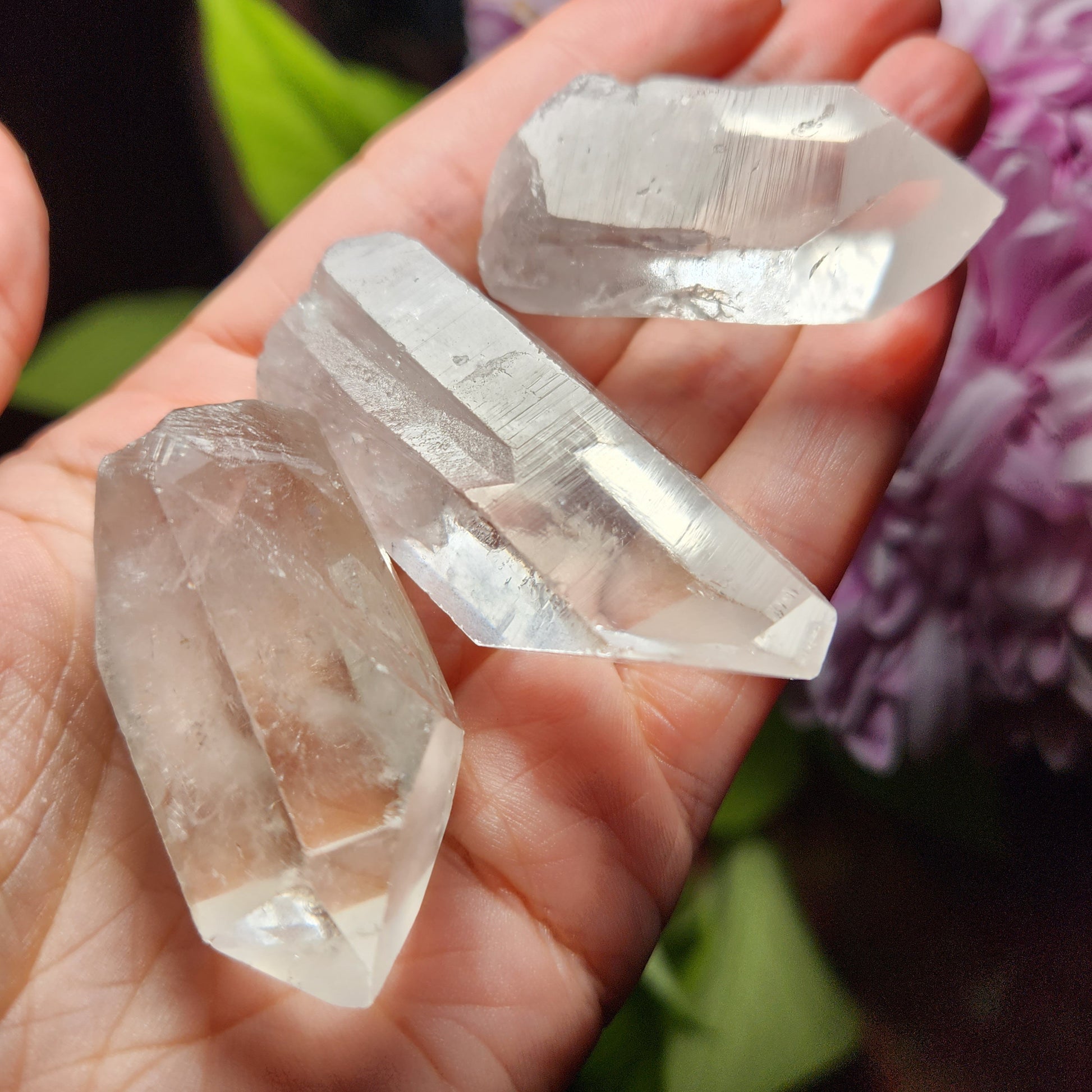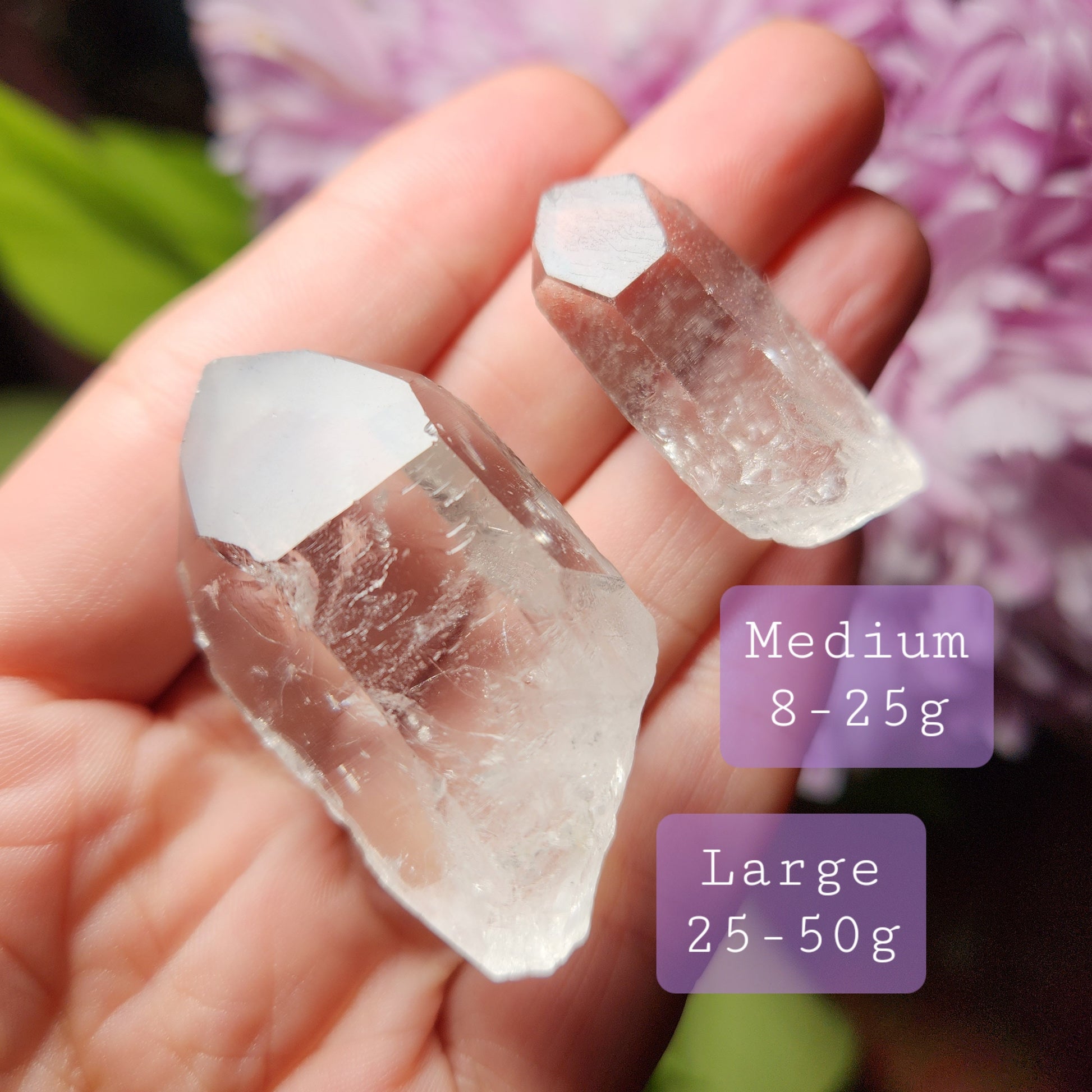 These clear Quartz crystals from Brazil have a crisp clarity and obvious terminated points. These naturally terminated stones can be expected to have indents from crystal growth interference and small abarasions from the mining process.