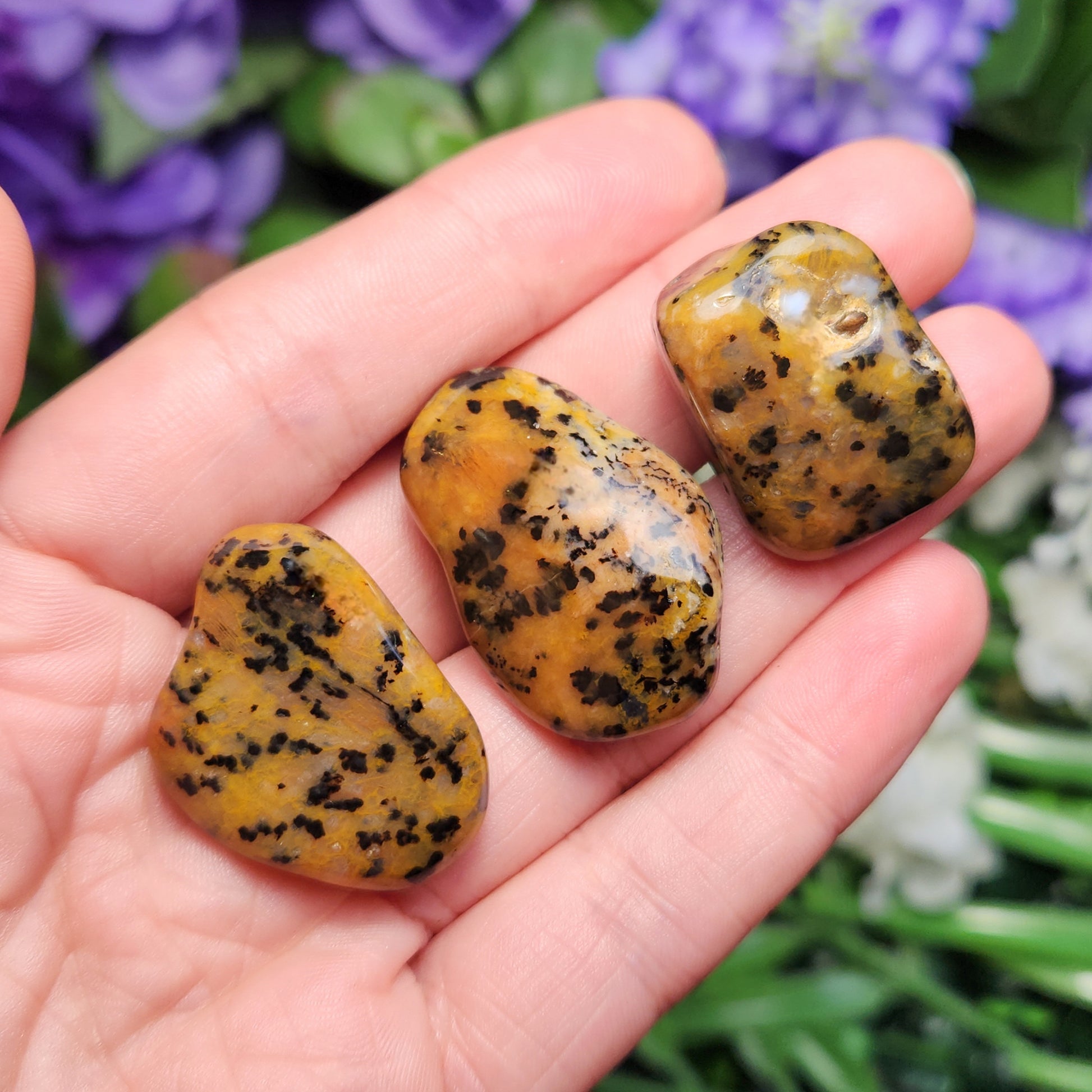 These Cheetah Agate stones from Brazil have freeform shapes and have been tumbled to a high polish. They exhibit warm color tones and spotted patterns, a trait classic to this material. Each specimen measures approximately 1 inch.