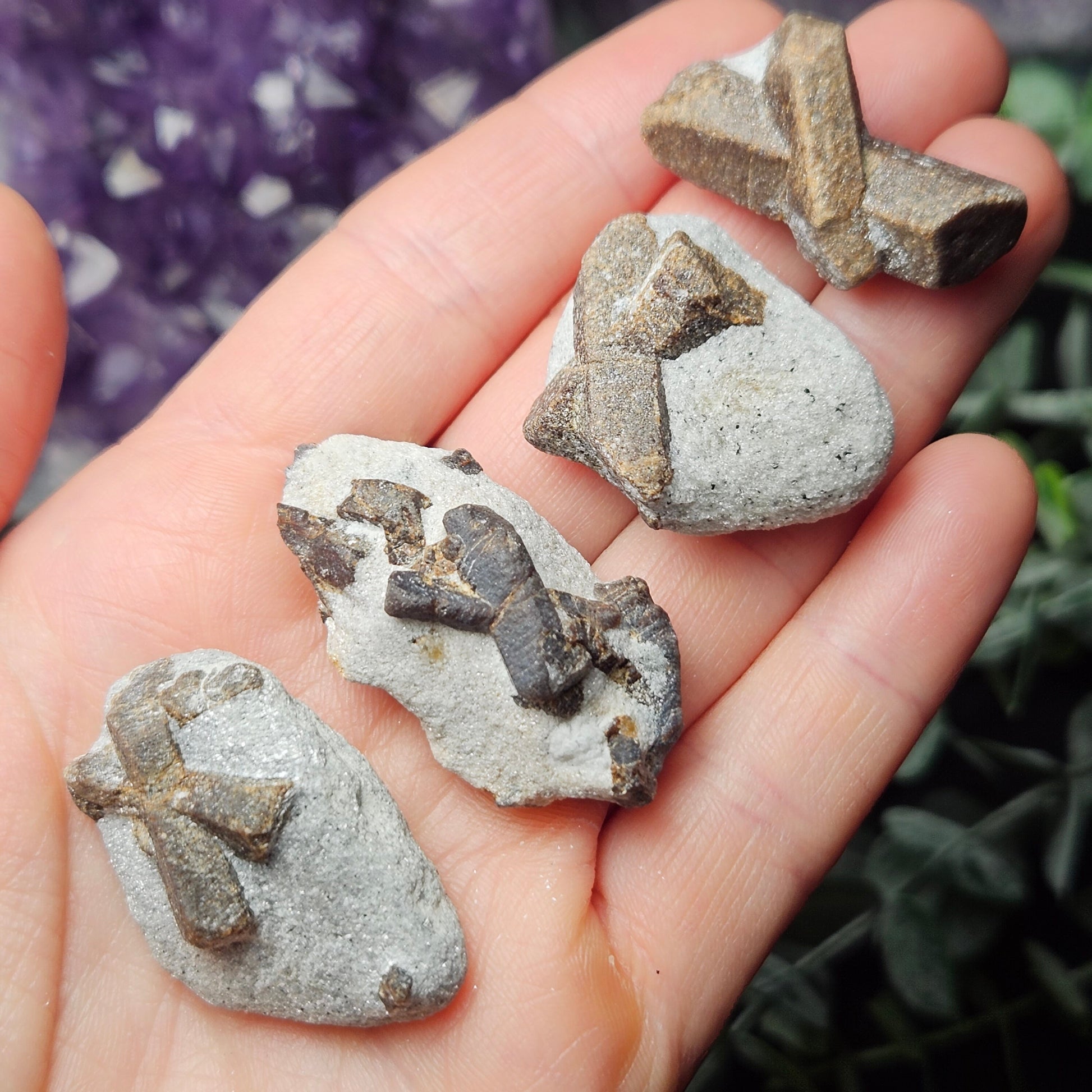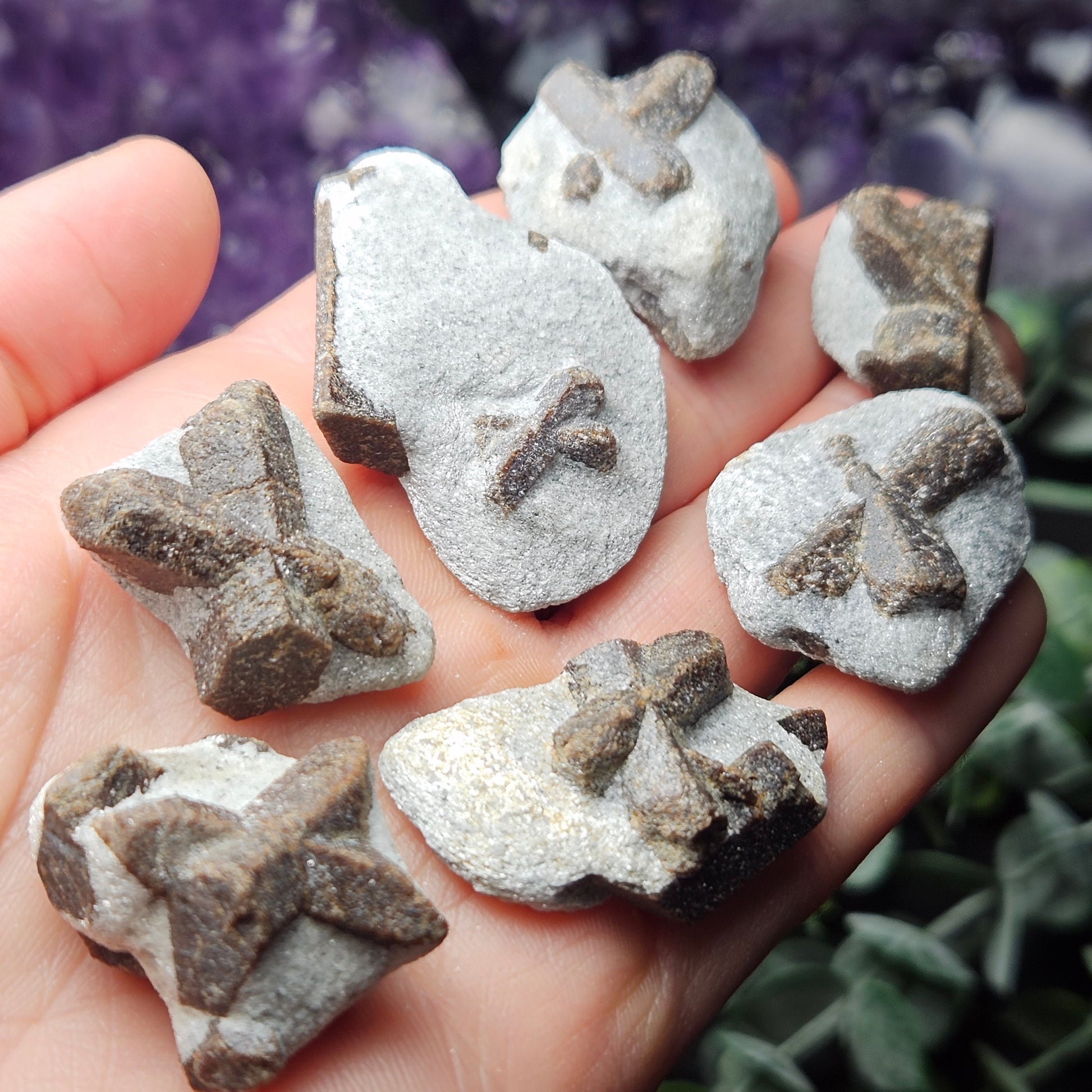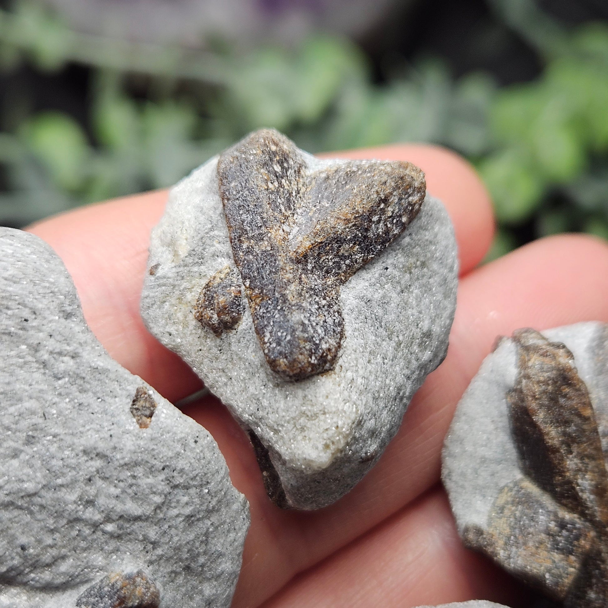 These Chiastolite crystals exhibit natural full and partial cross patterns that this unique mineral is known for. These raw stones are set in their natural matrix and exhibit terminated structure and fascinating formations.