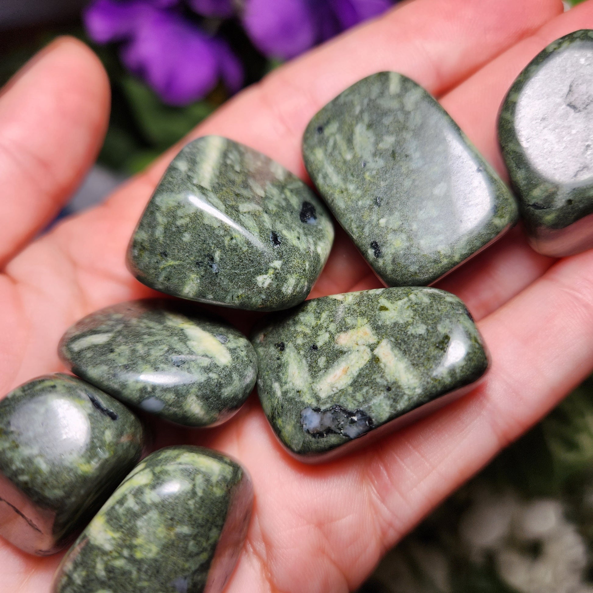Chinese Writing Stone is named after the intricate markings that resemble that of Chinese script. These tumbled Chinese Writing Stone specimens have a smooth polish, deep green coloring, and each exhibit unique markings. Each specimen measures between .75 inches and 1 inch.