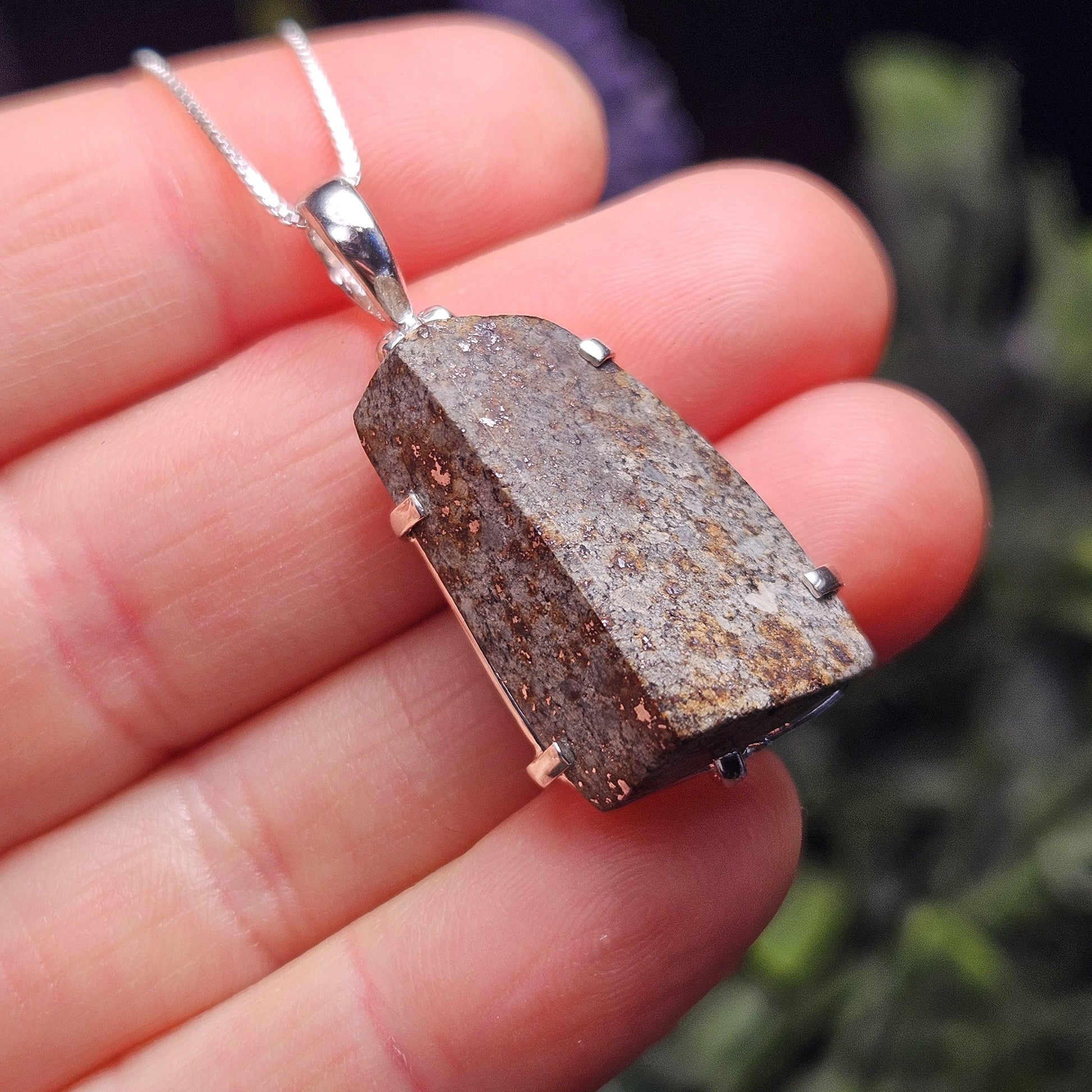 This Meteorite from Kenya has a grey coloring with rich brown speckles and has been polished to showcase its chondrules. This crystal has been custom created into a sturdy piece of jewelry using .925 Sterling Silver. This pendant measures approximately 34mm by 14mm. The silver chain used in the photos is to help envision how this pendant will look while adorned but is not included in the listing.