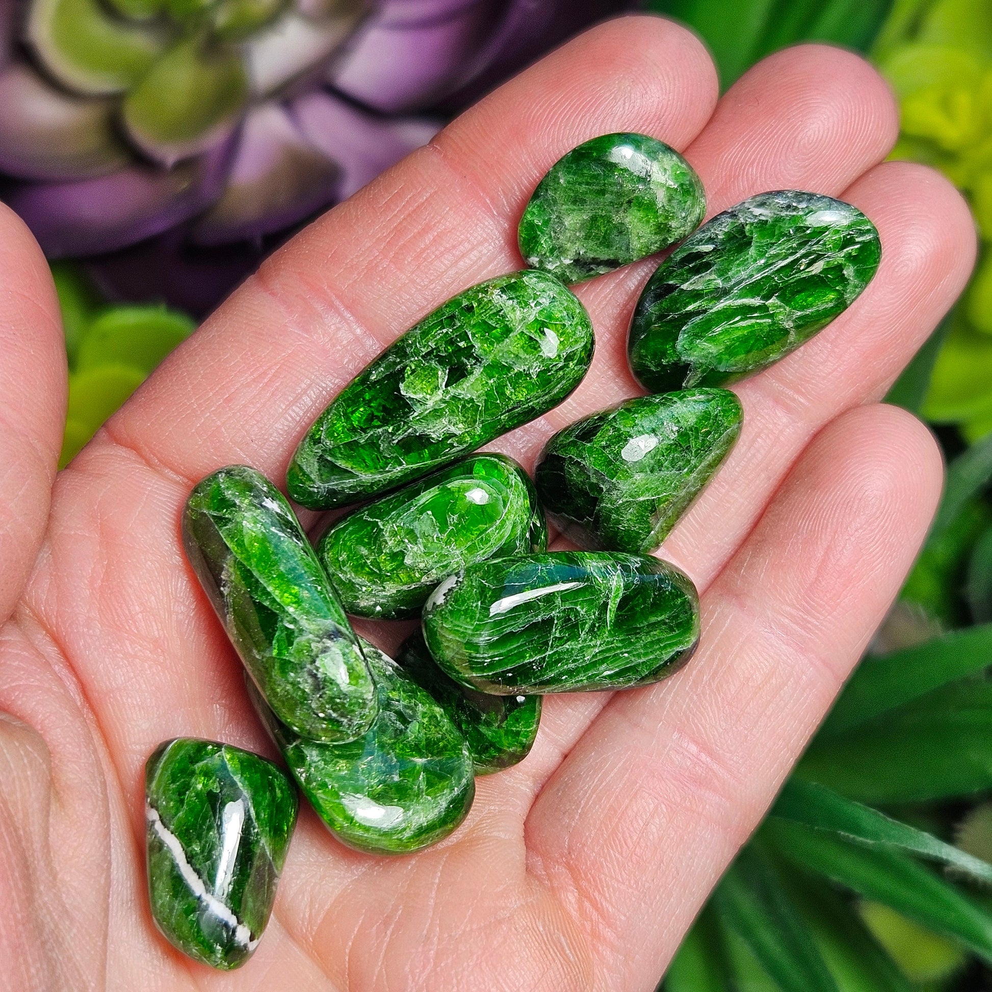 These high-quality Chrome Diopside crystals from eastern Siberia have a smooth polish and rounded freeform shapes. They showcase a naturally lustrous bright green coloring with translucence and gemmy areas.
