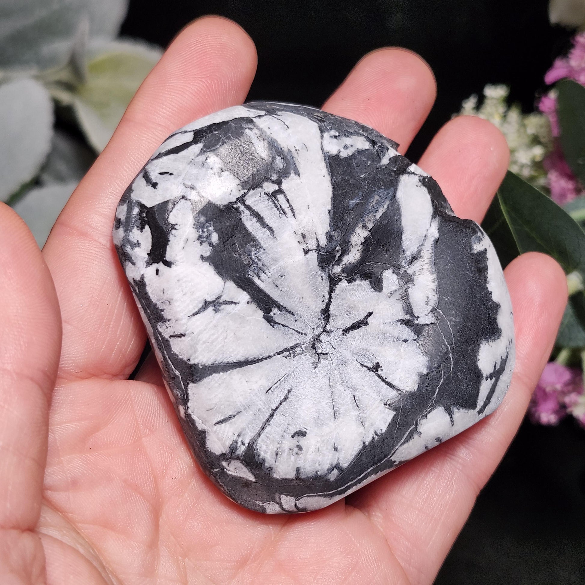 These Chrysanthemum Stones are matte with white starburst patterns against slate grey, resembling the petals of flowering chrysanthemums. These palm stones have been recovered from the reserves of an old collection, and we are excited to make them available for a limited time! Each specimen has a light polish with possible nicks or abrasions and showcases its own unique pattern.