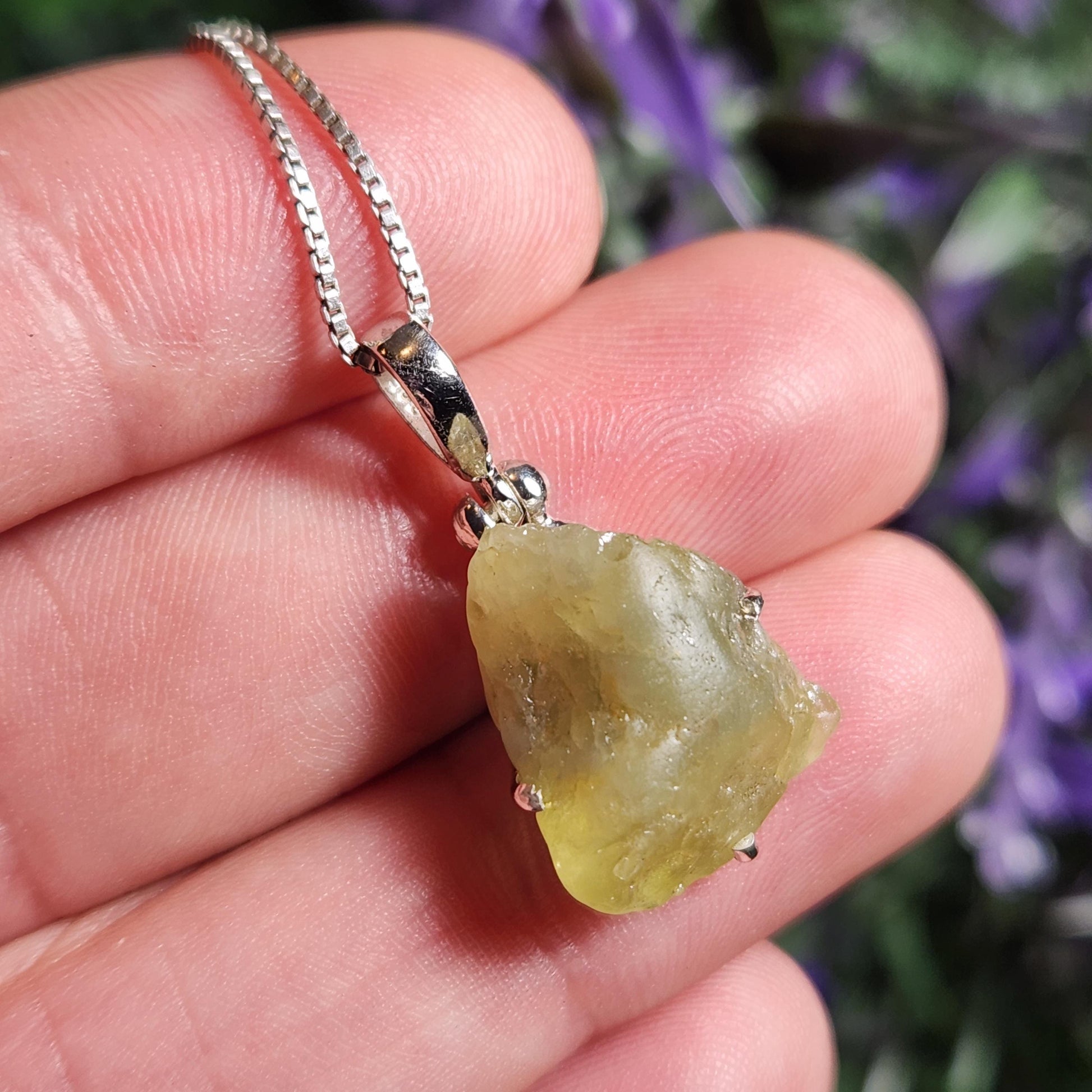 This Chrysoberyl gemstone is in its raw form and exhibits a chartreuse coloring with a slight translucence when backlit. This crystal has been custom created into a sturdy piece of jewelry using .925 Sterling Silver. This pendant measures approximately 25mm by 11mm. The silver chain used in the photos is to help envision how this pendant will look while adorned but is not included in the listing.