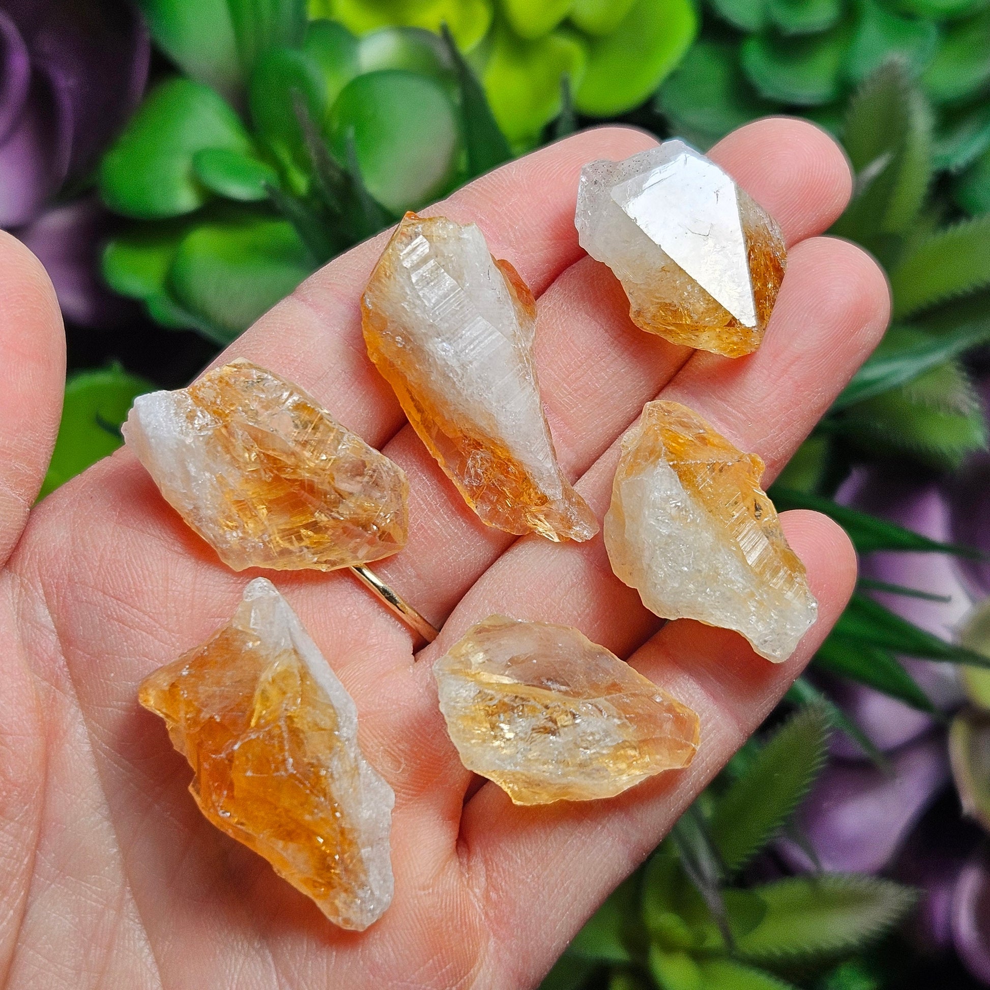 These Brazilian Citrine crystals exhibit golden yellow and cream colored hues with a glowing translucence. Each specimen has visible natural facets, showing off it's "root" crystal formation.