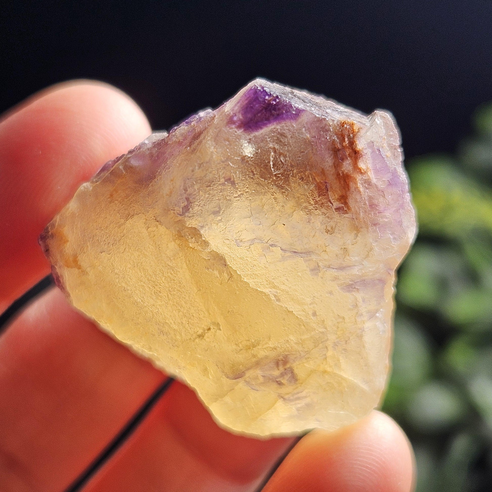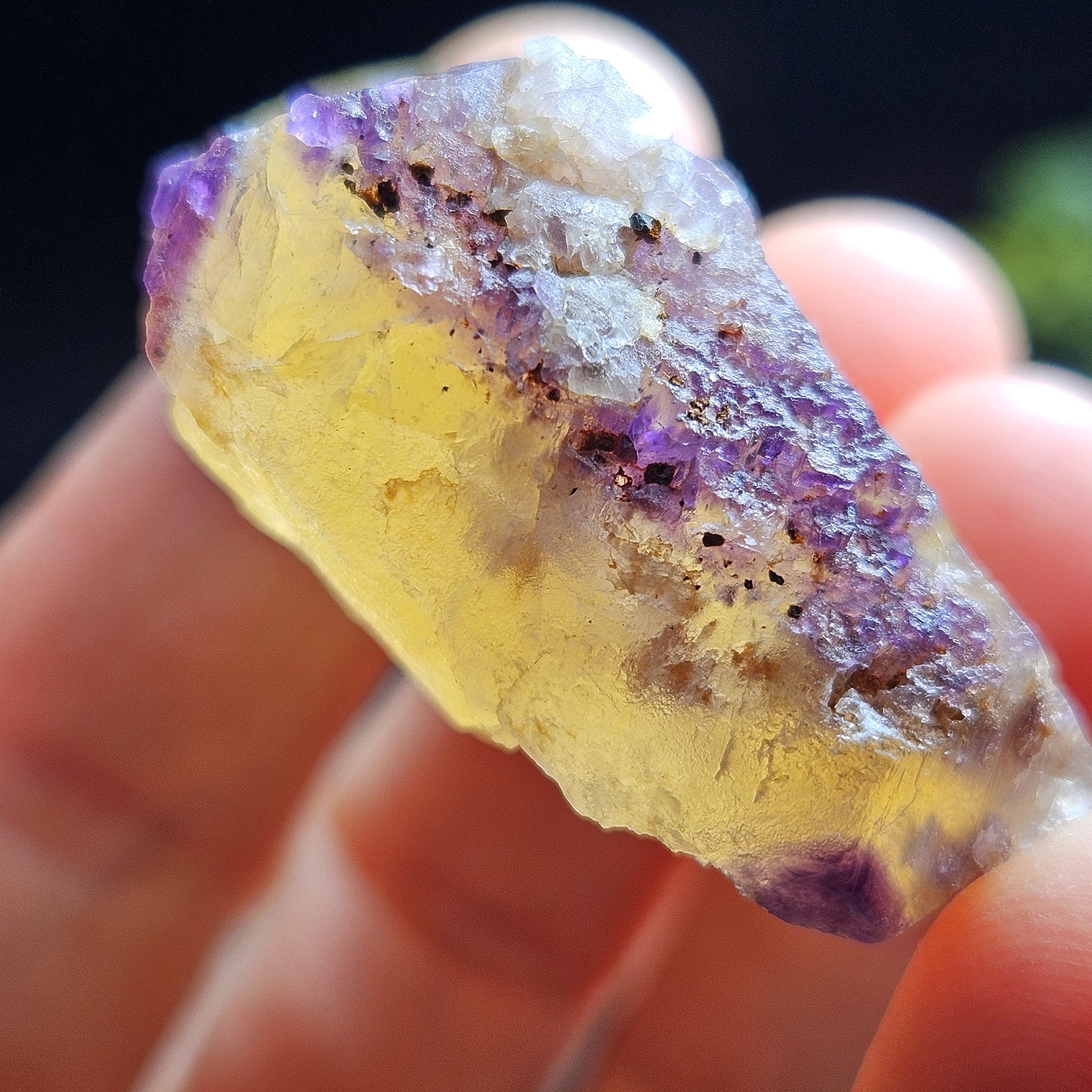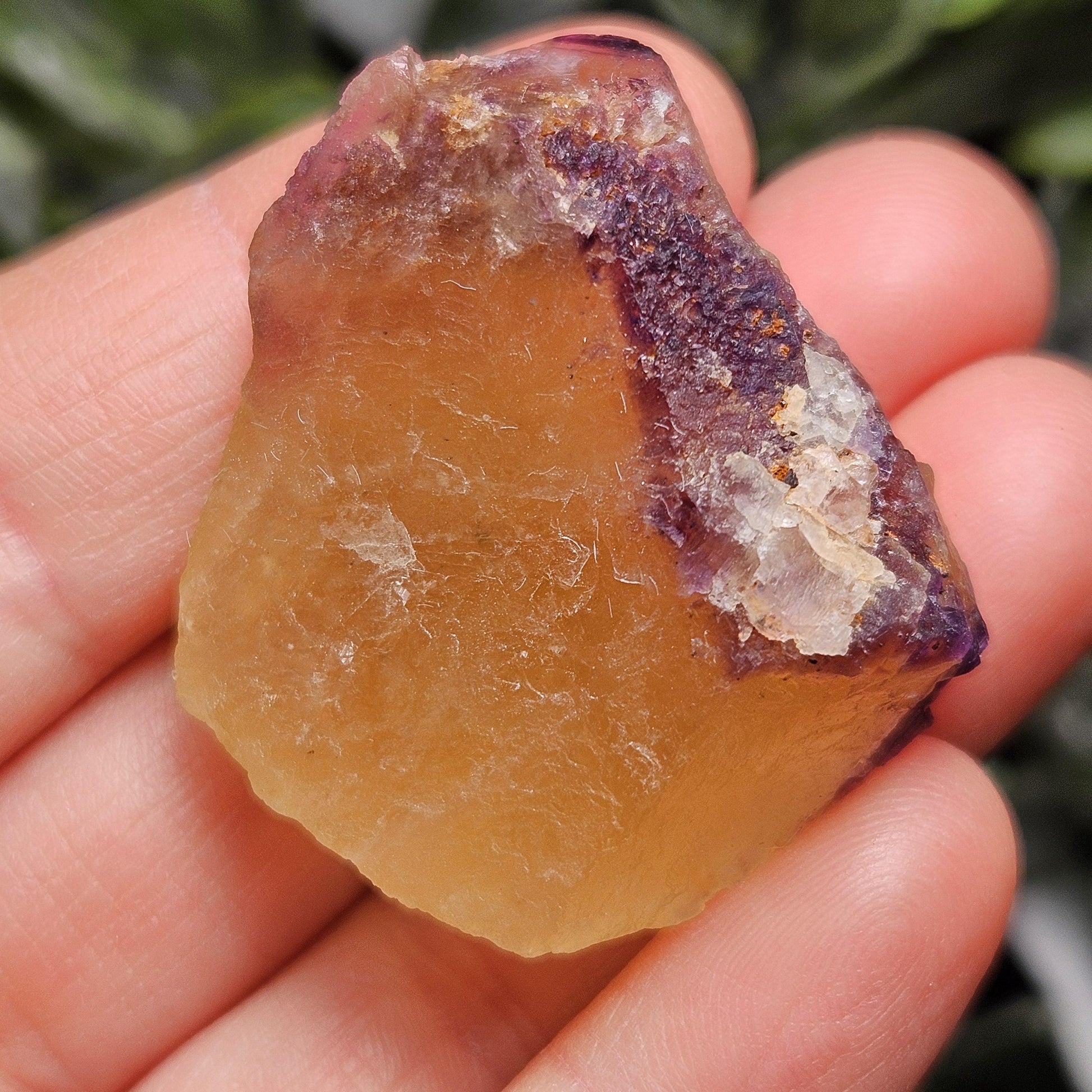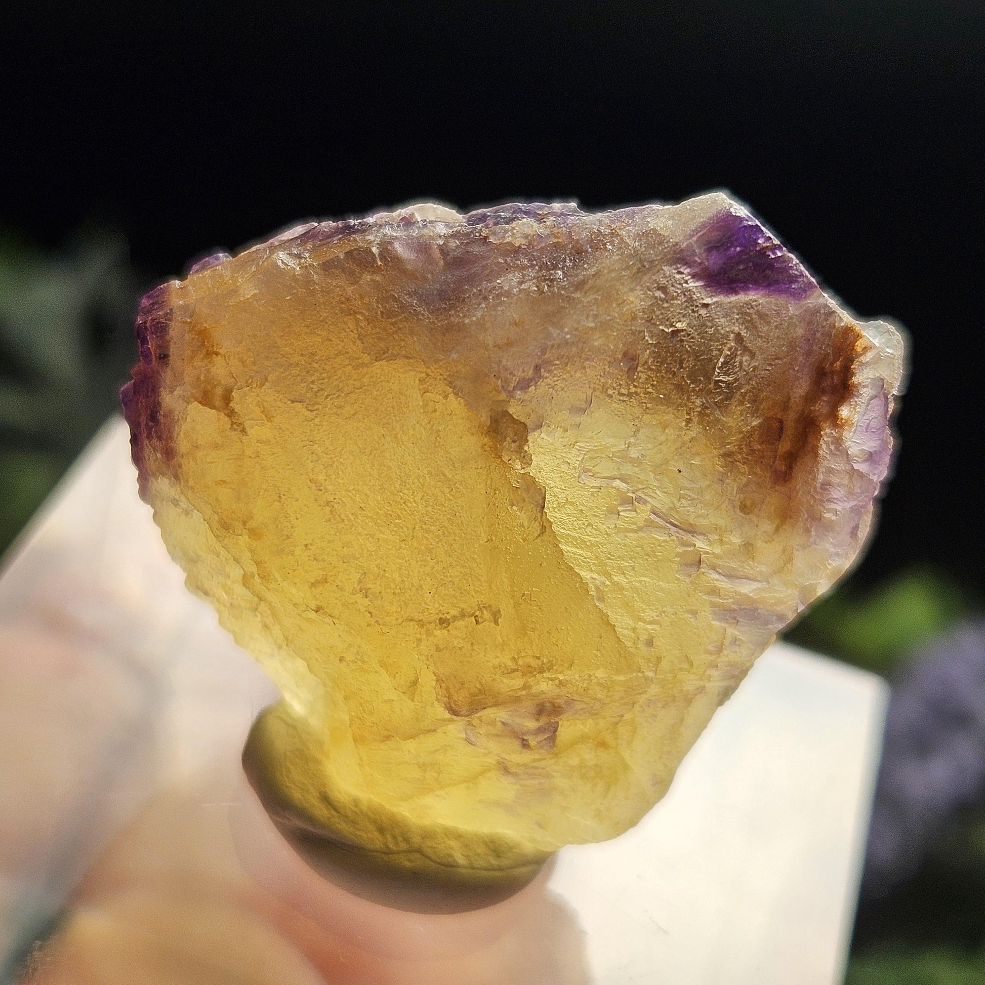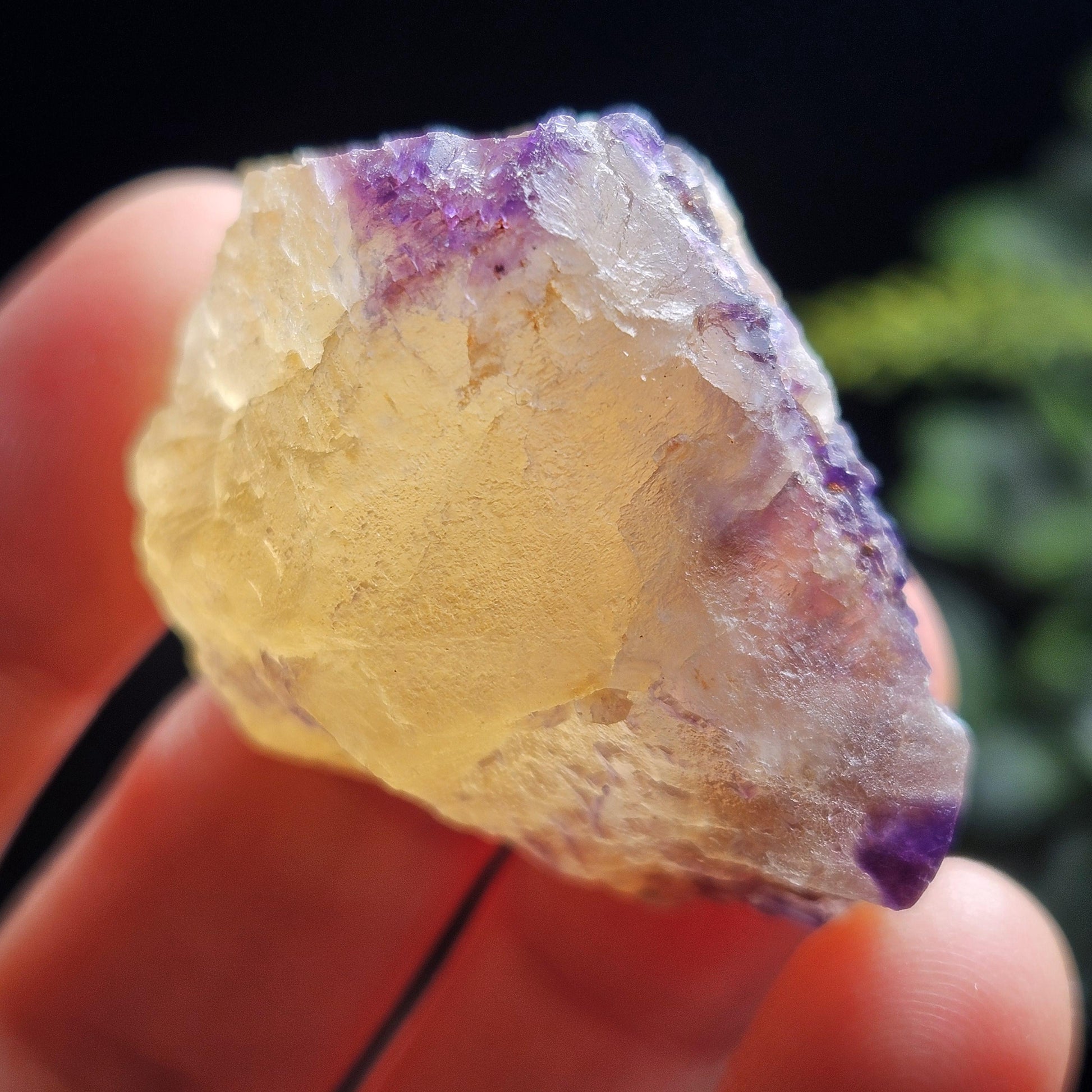This Fluorite stone is from the renowned mines of Cave-In-Rock village, a mining district in Hardin County, Illinois. This piece exhibits a brilliant purple and golden yellow translucence with hints of cubic formations and laced violet edges. It is distinctly UV reactive under longwave ultraviolet lighting. It measures 38 x 35 x 18 millimeters and weighs 31 grams.