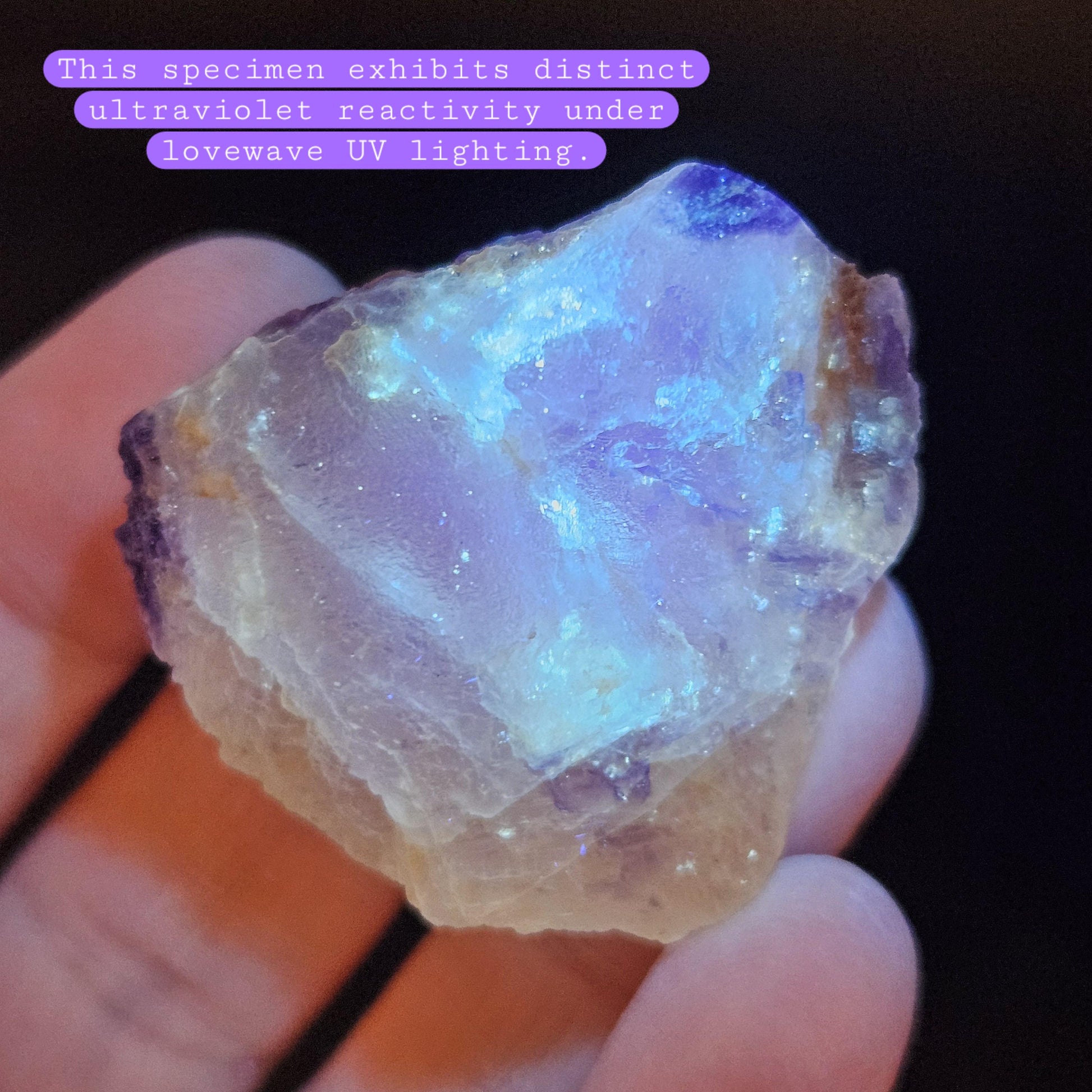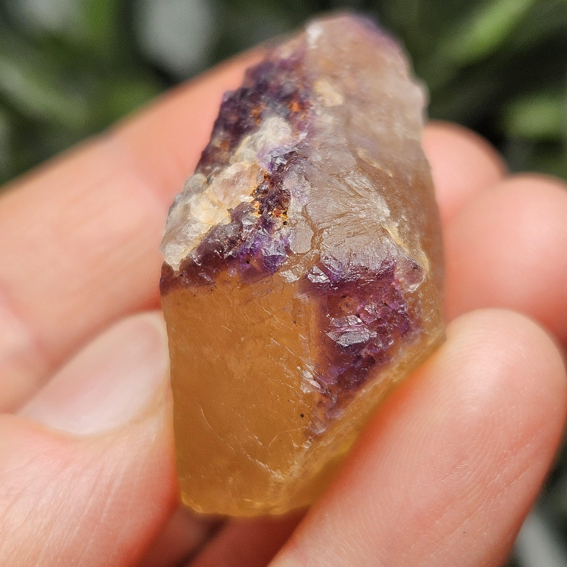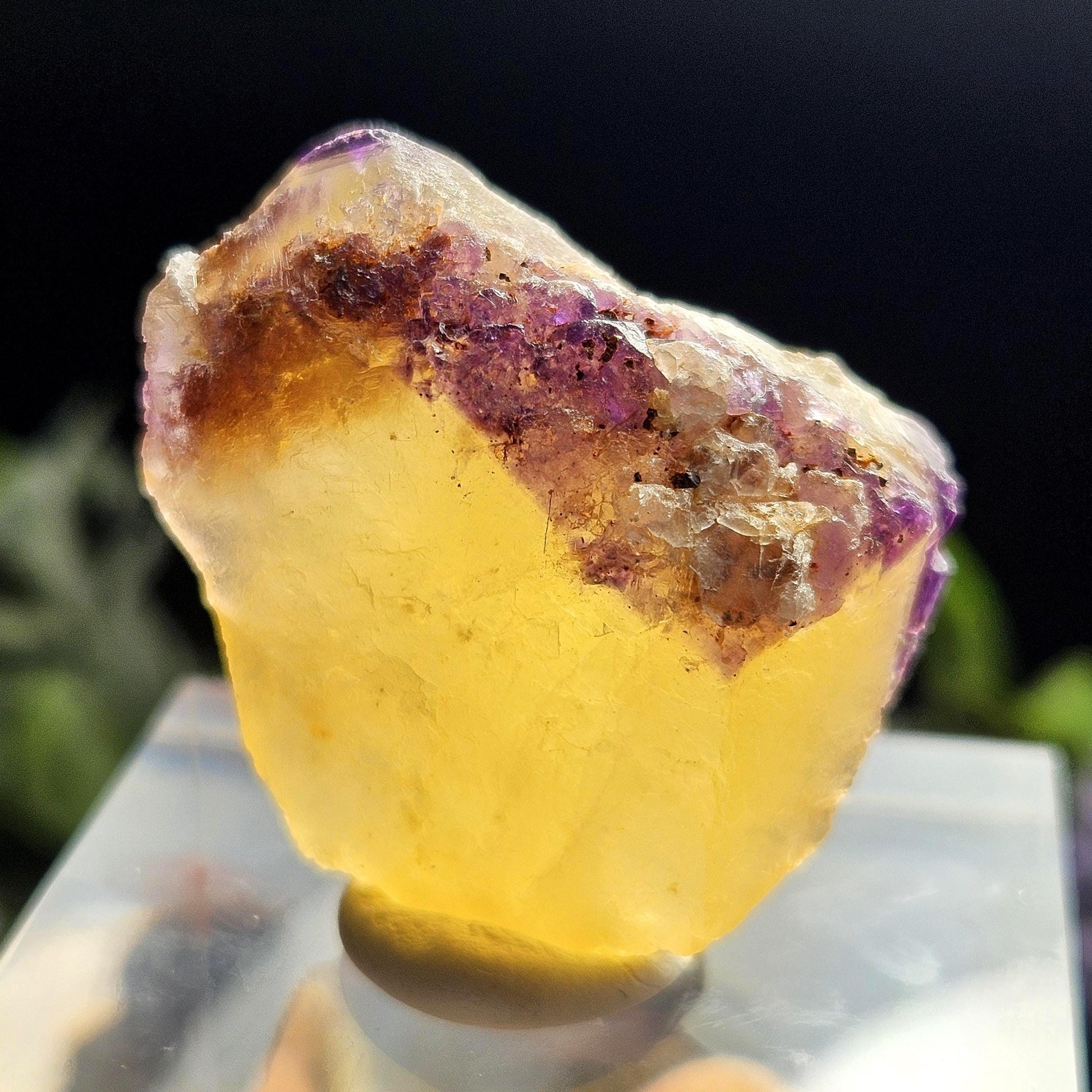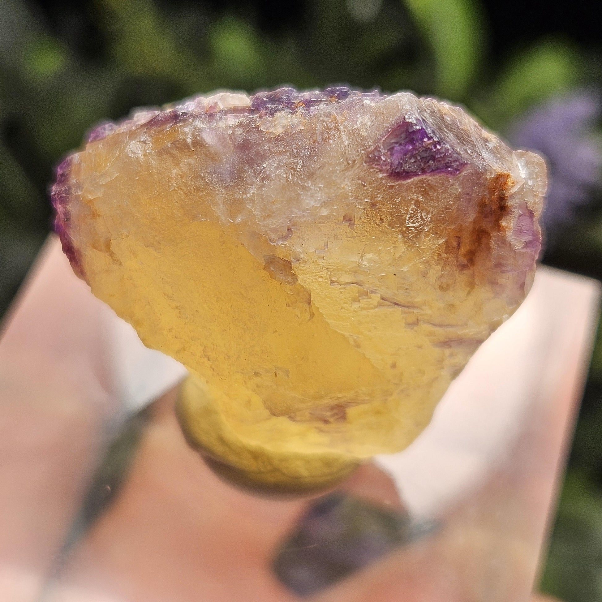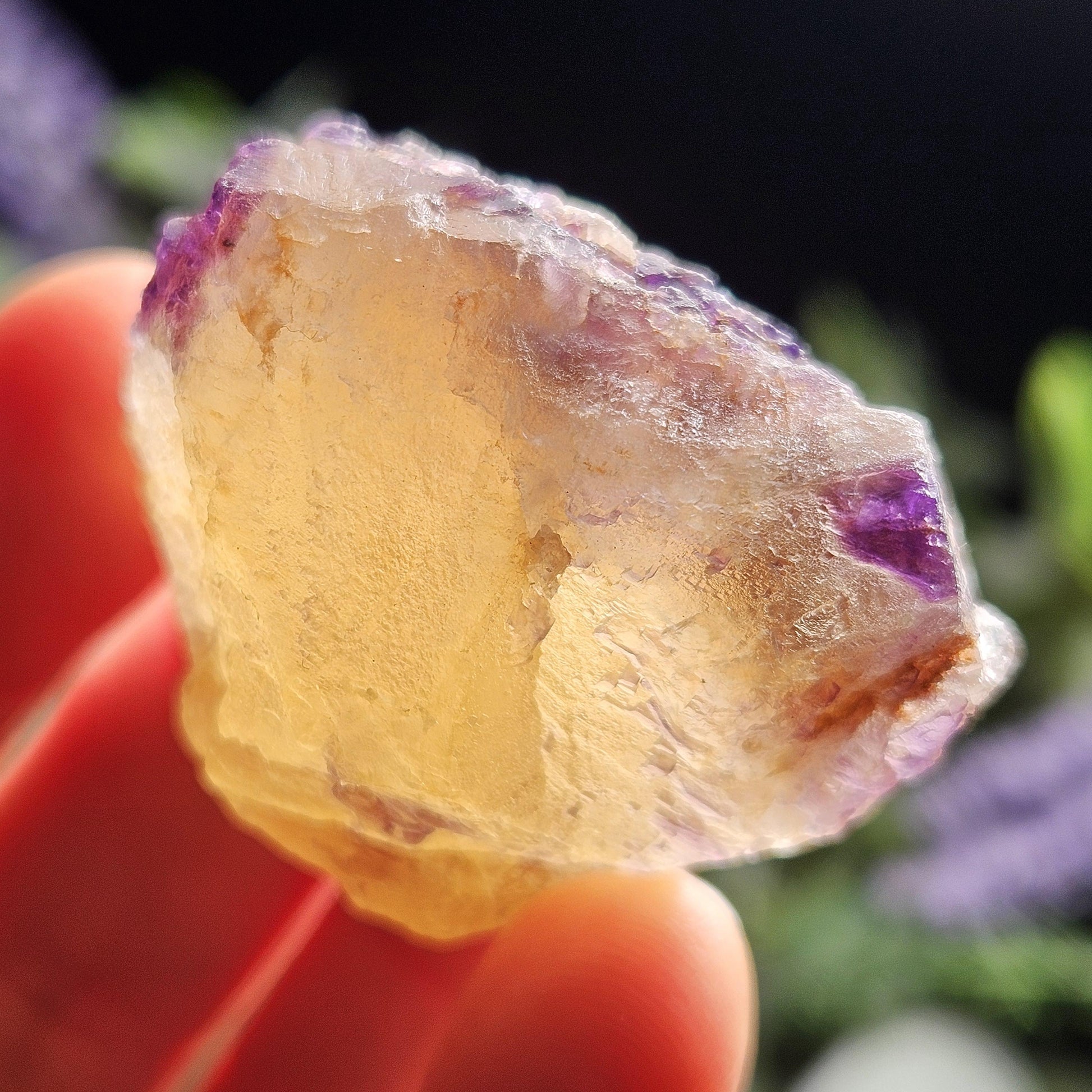This Fluorite stone is from the renowned mines of Cave-In-Rock village, a mining district in Hardin County, Illinois. This piece exhibits a brilliant purple and golden yellow translucence with hints of cubic formations and laced violet edges. It is distinctly UV reactive under longwave ultraviolet lighting. It measures 38 x 35 x 18 millimeters and weighs 31 grams.
