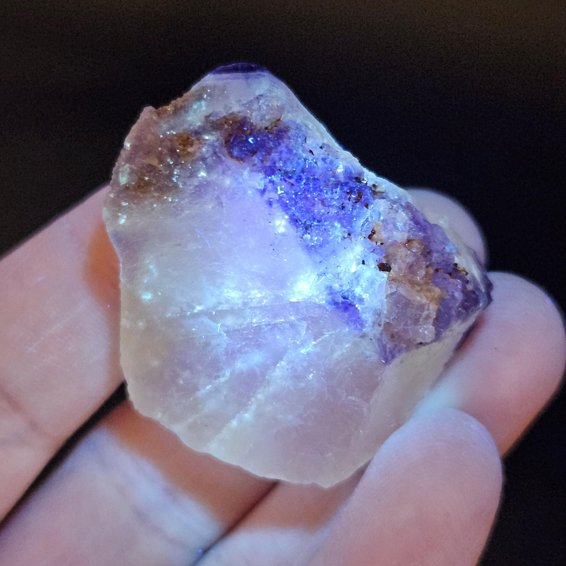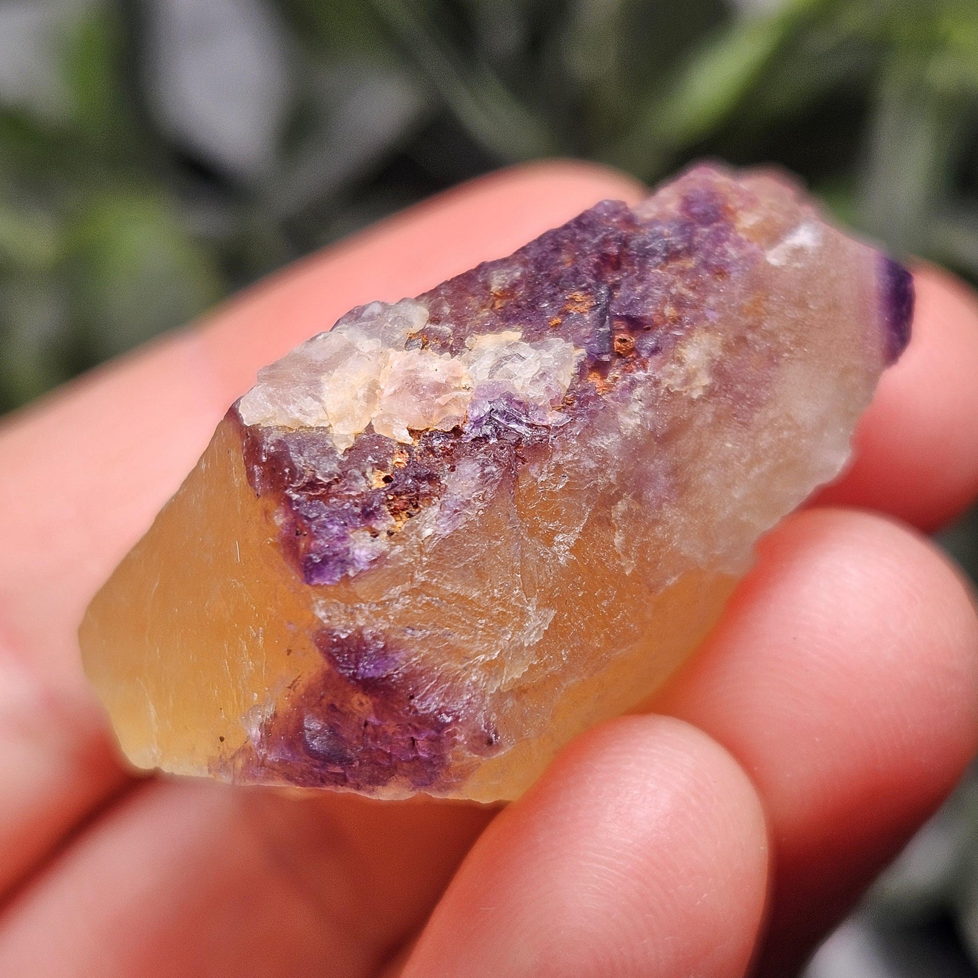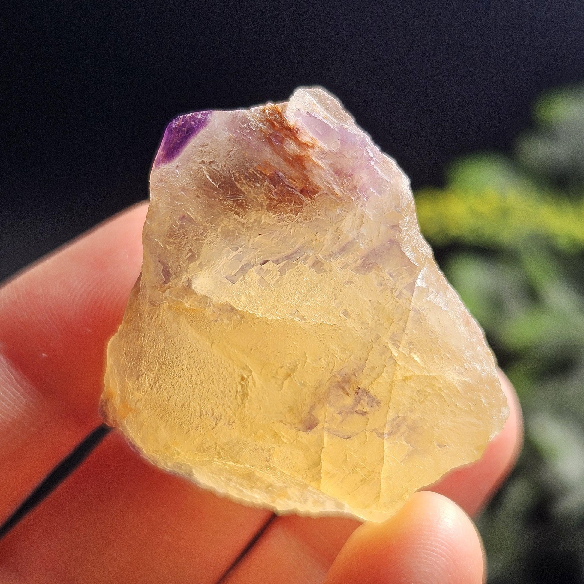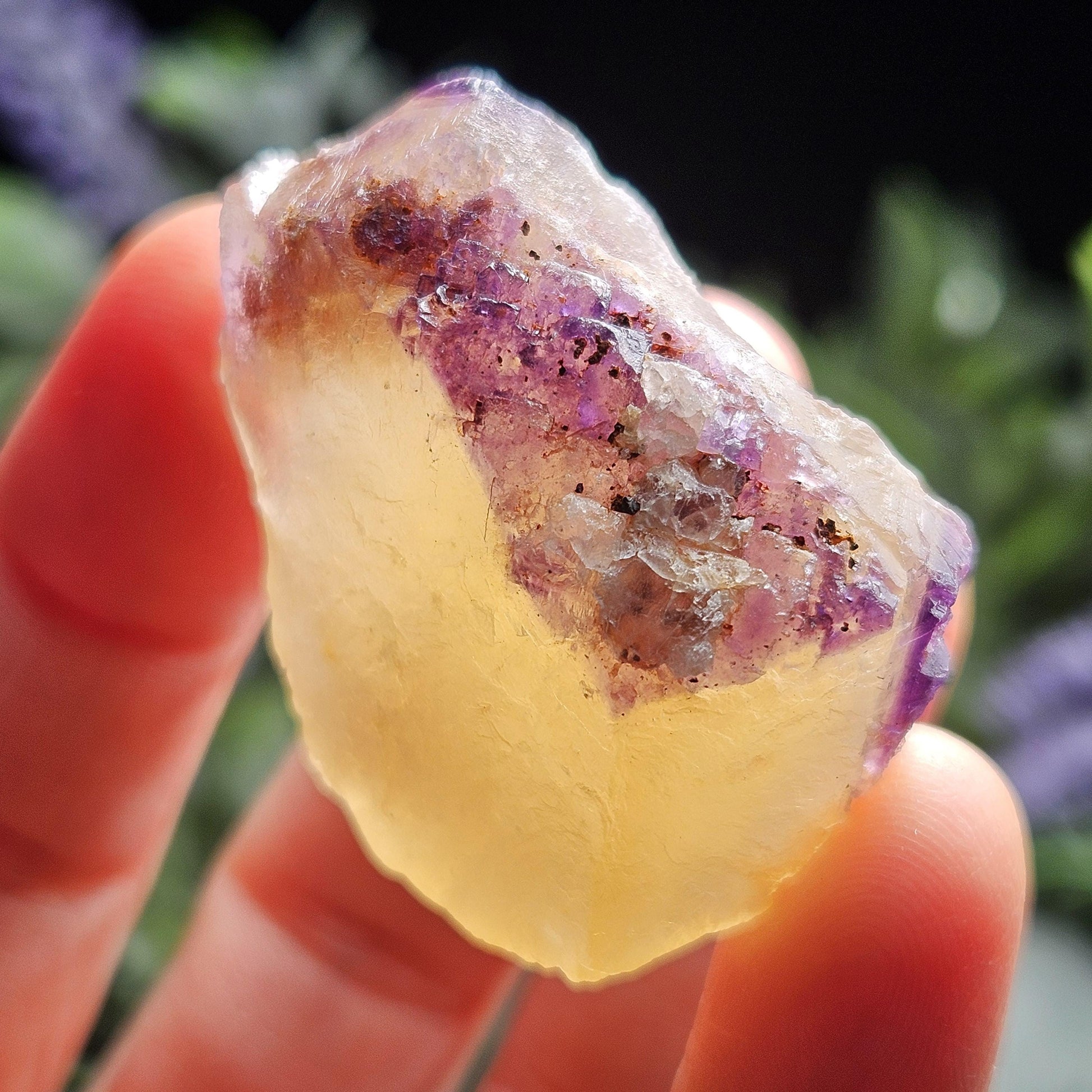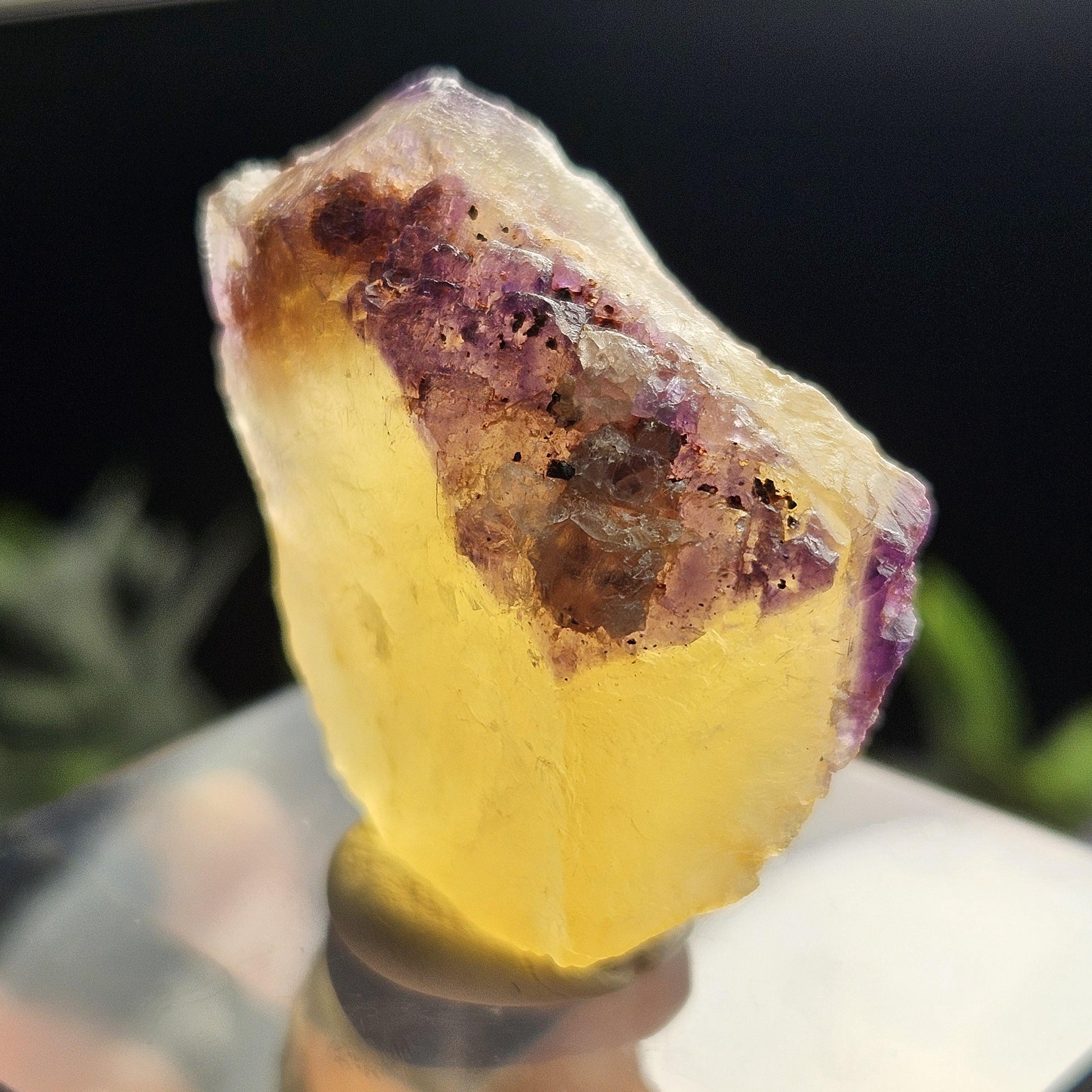This Fluorite stone is from the renowned mines of Cave-In-Rock village, a mining district in Hardin County, Illinois. This piece exhibits a brilliant purple and golden yellow translucence with hints of cubic formations and laced violet edges. It is distinctly UV reactive under longwave ultraviolet lighting. It measures 38 x 35 x 18 millimeters and weighs 31 grams.