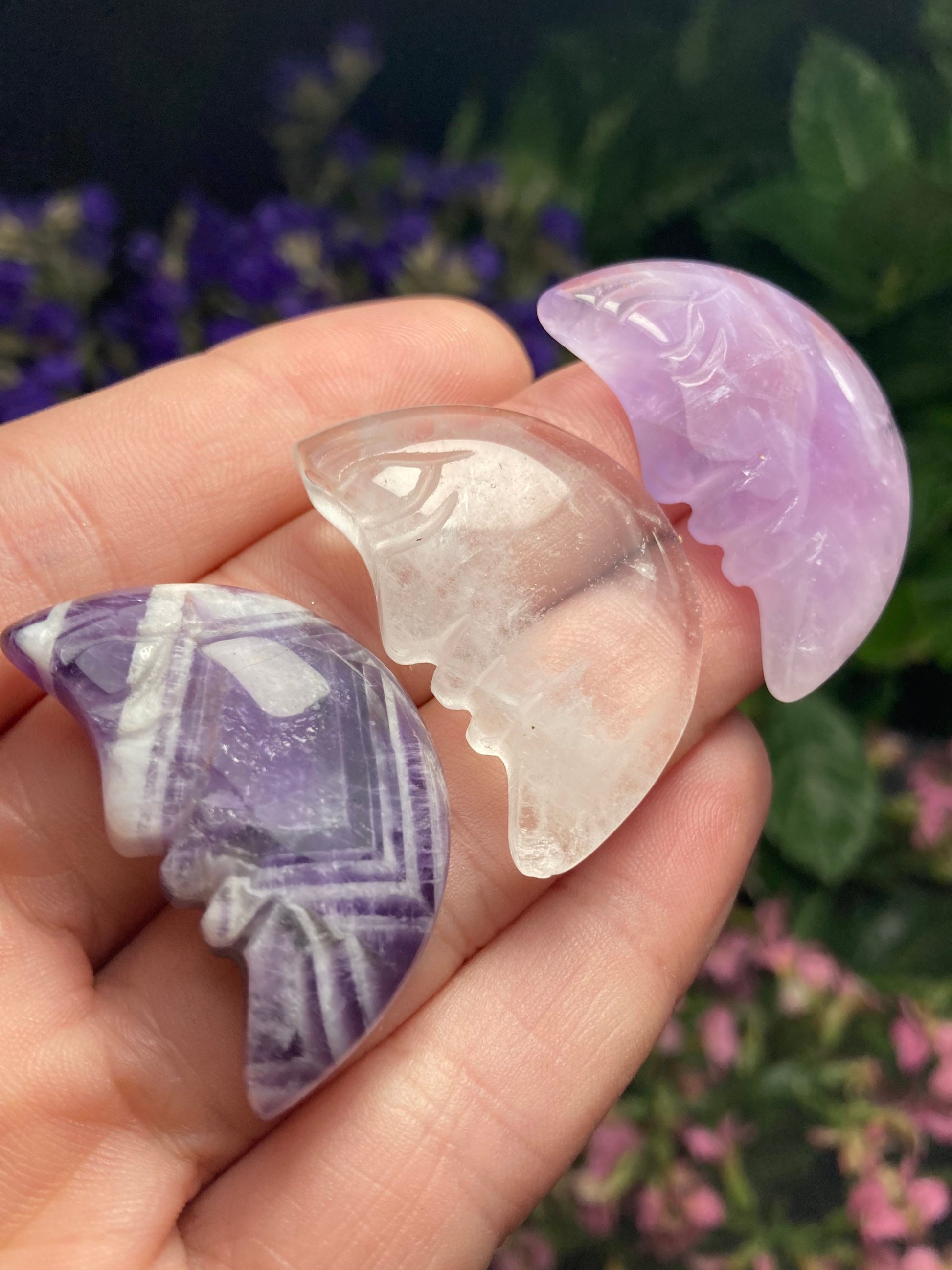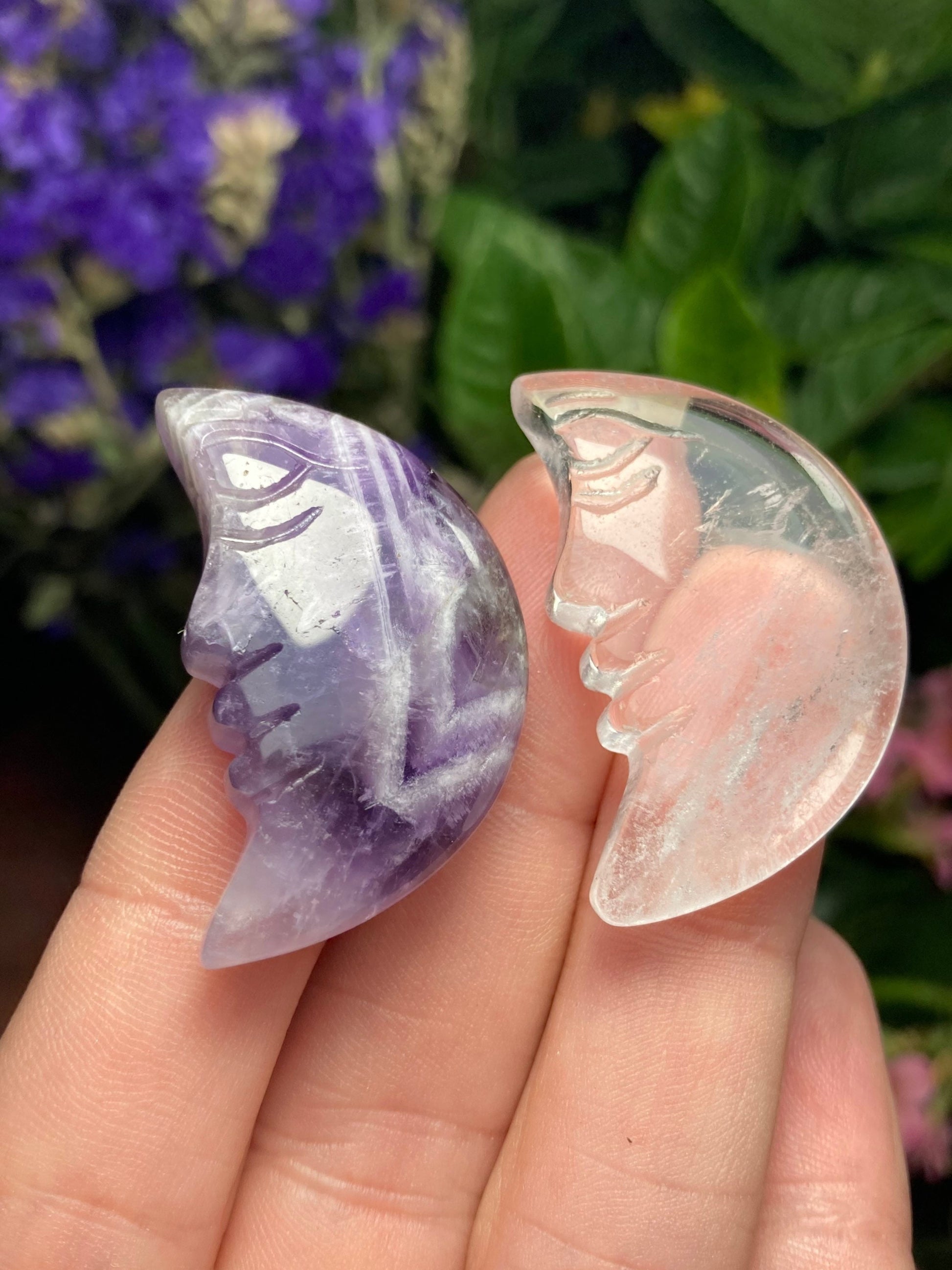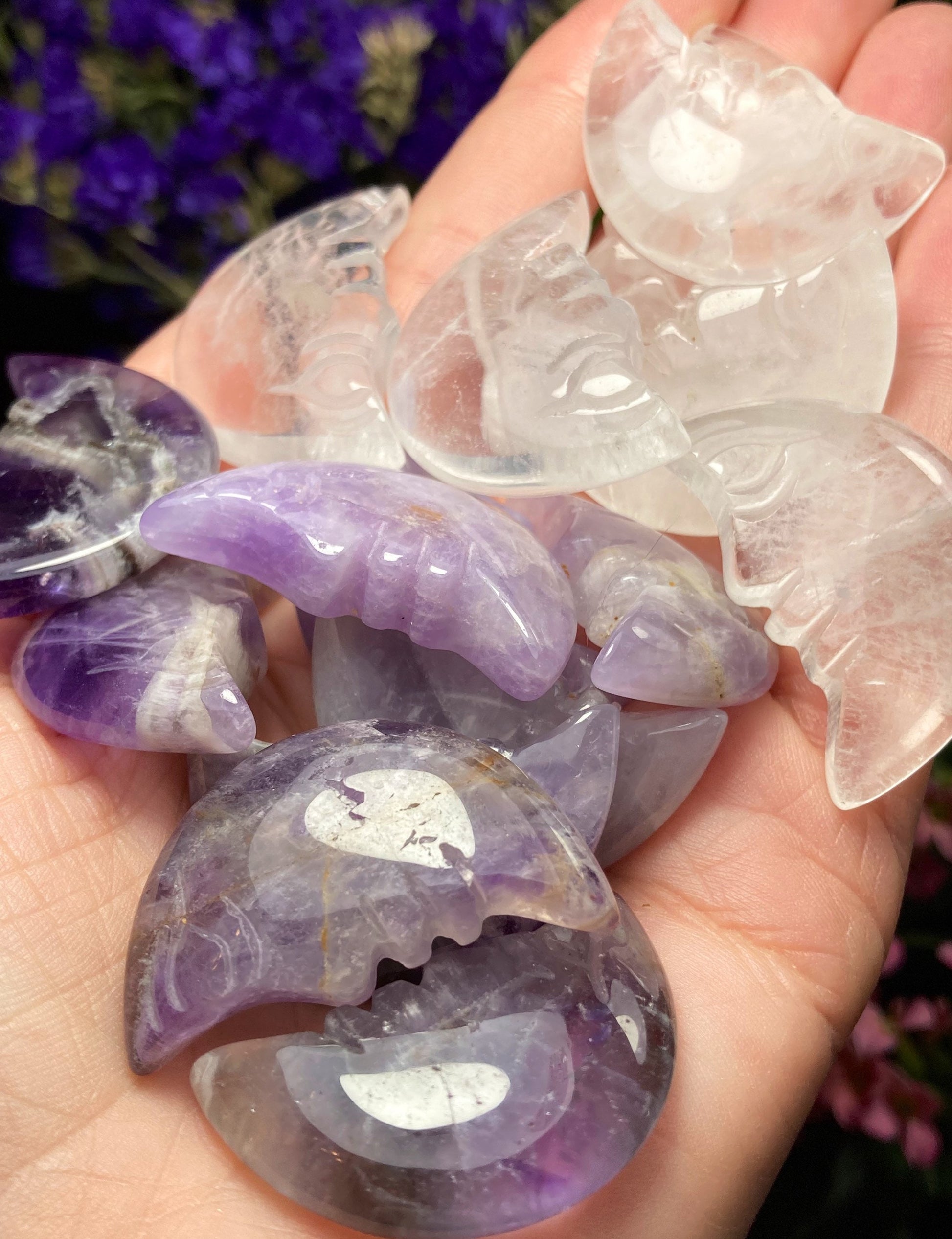 These crystals have been carved into crescent moon shapes, with a face on one side, and polished to a high sheen. The Quartz moons are translucent and range from very clear to milky. The Amethyst moons are a range of shades of purple, some displaying a grey, black, or white colors, or a chevron pattern. Each crystal moon specimen measures approximately 35mm by 20mm.