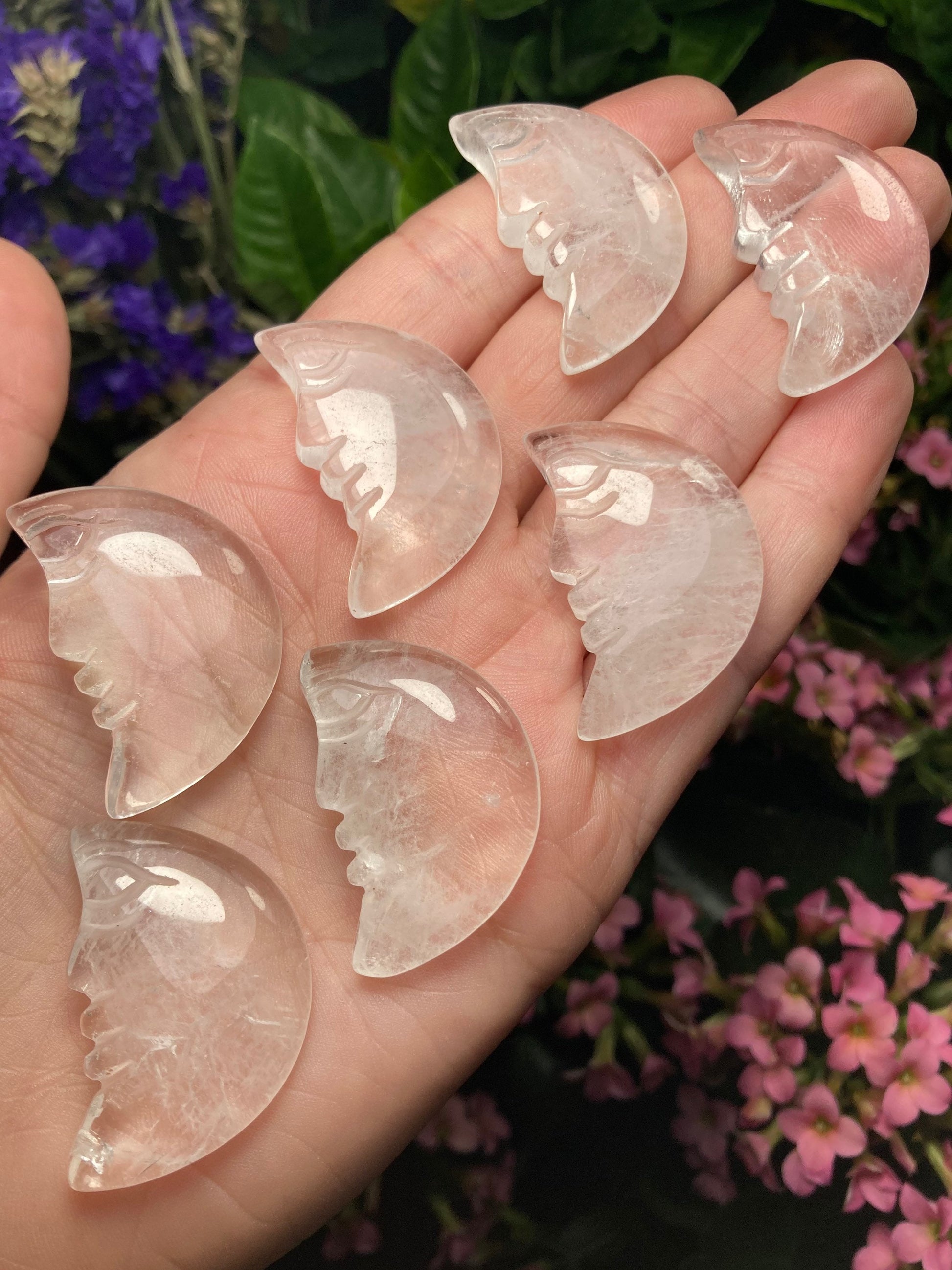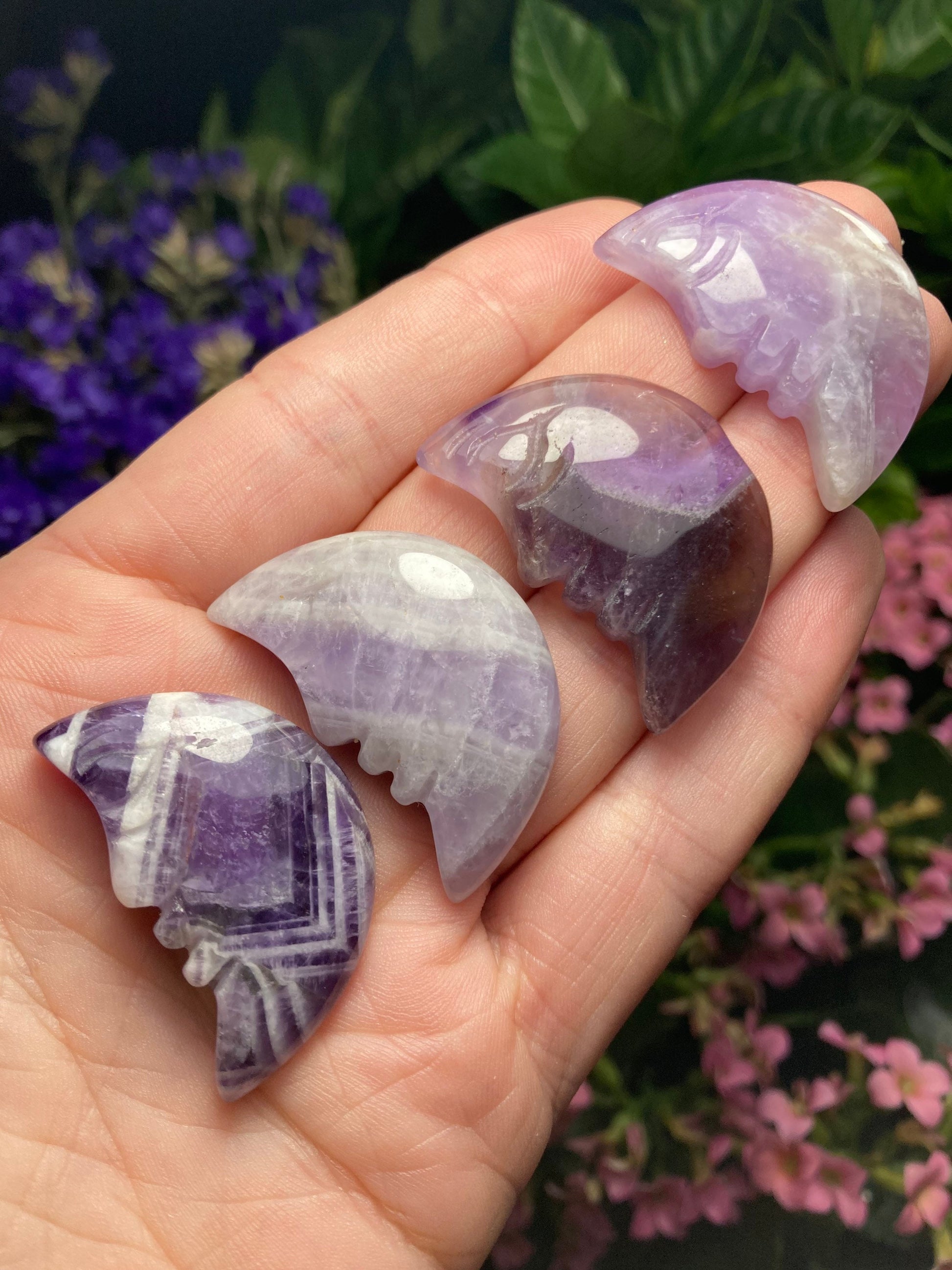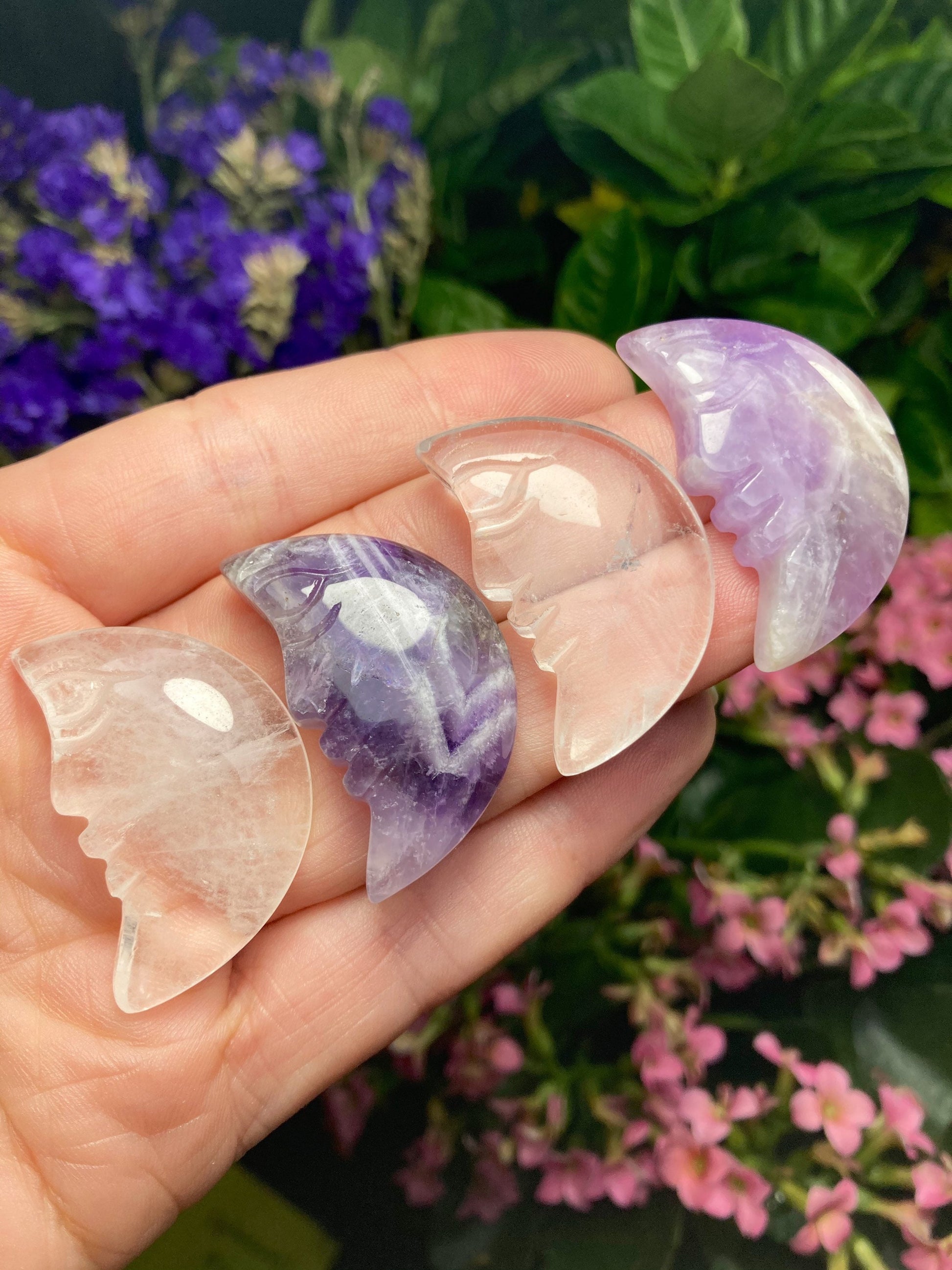 These crystals have been carved into crescent moon shapes, with a face on one side, and polished to a high sheen. The Quartz moons are translucent and range from very clear to milky. The Amethyst moons are a range of shades of purple, some displaying a grey, black, or white colors, or a chevron pattern. Each crystal moon specimen measures approximately 35mm by 20mm.