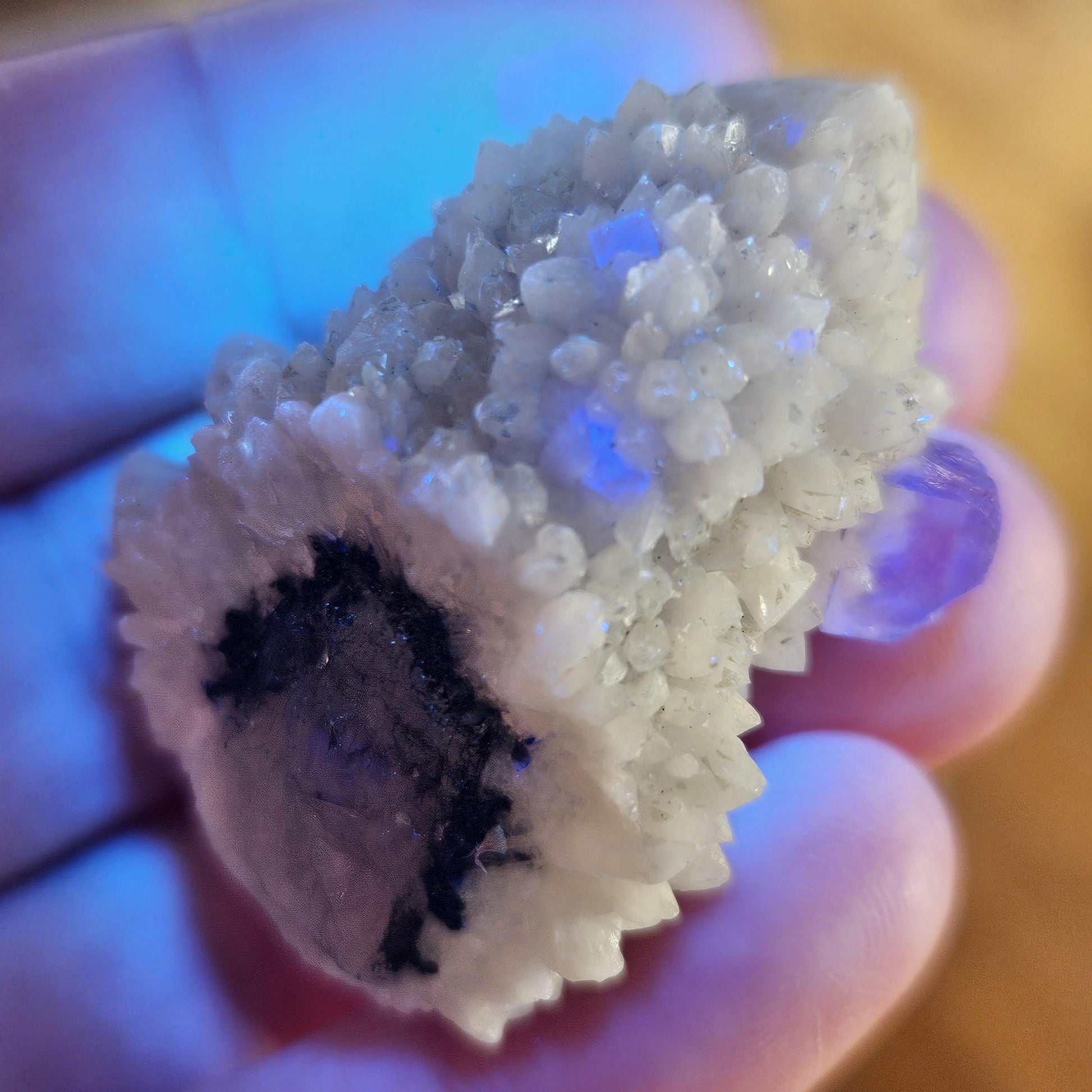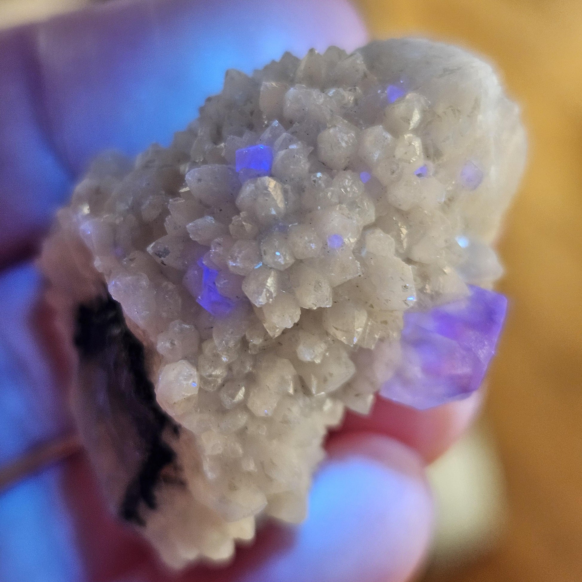 This specimen from the Huanggangliang region of China displays speckled clear Fluorite cubes over a multi terminated candle quartz specimen. This specimen measures approximately 40mm by 30mm by 20mm and weighs 21 grams.