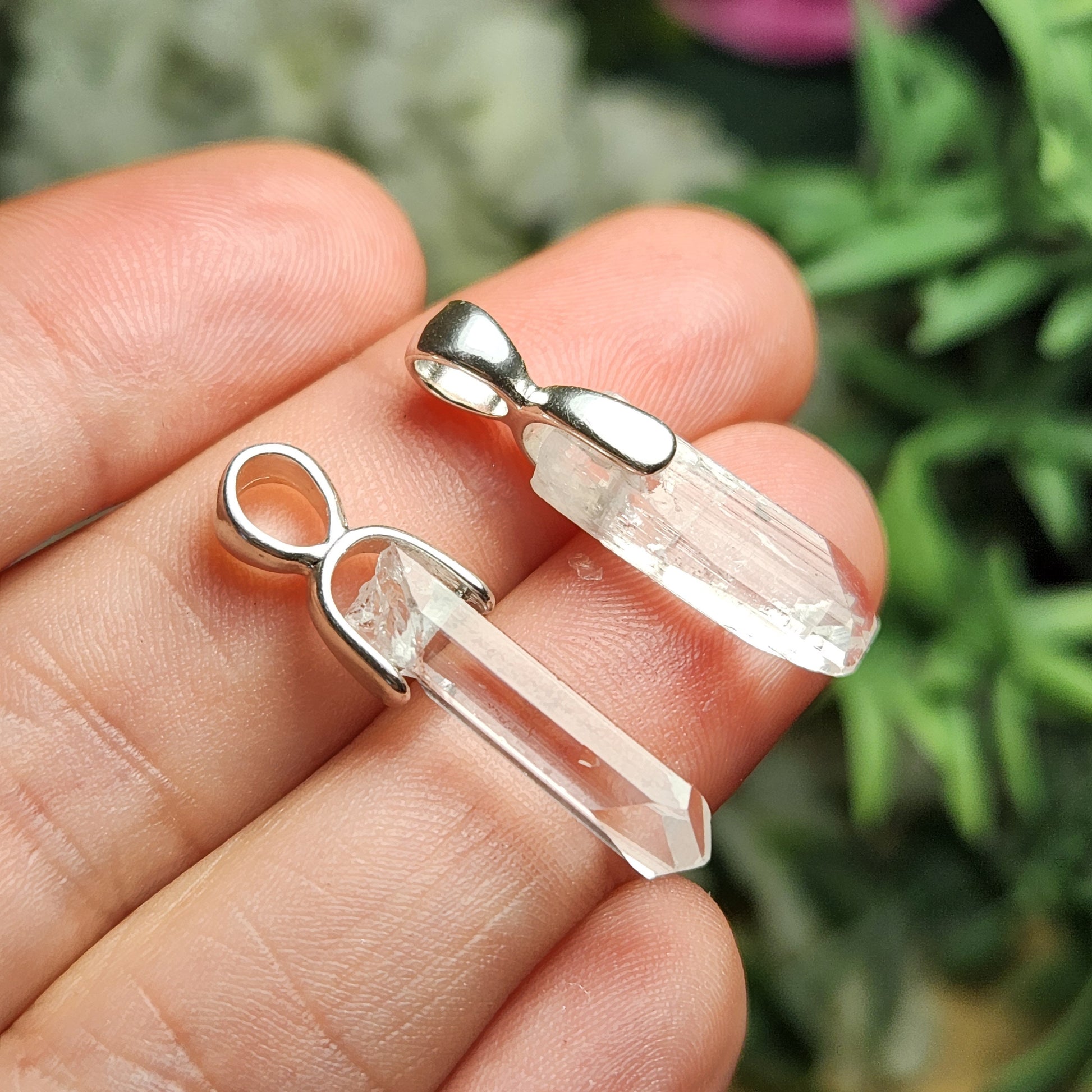 These Danburite crystals have excellent clarity and shining terminations. Each crystal has been custom created into a sturdy piece of jewelry using .925 Sterling Silver. These pendants have been custom fabricated. Each pendant measures approximately 20mm by 5mm - these measurements are meant to give a general idea of size; the actual dimensions of the pendant you receive may vary slightly. The silver chain used in the photos is to help envision how this pendant will look while adorned but is not included in the listing.