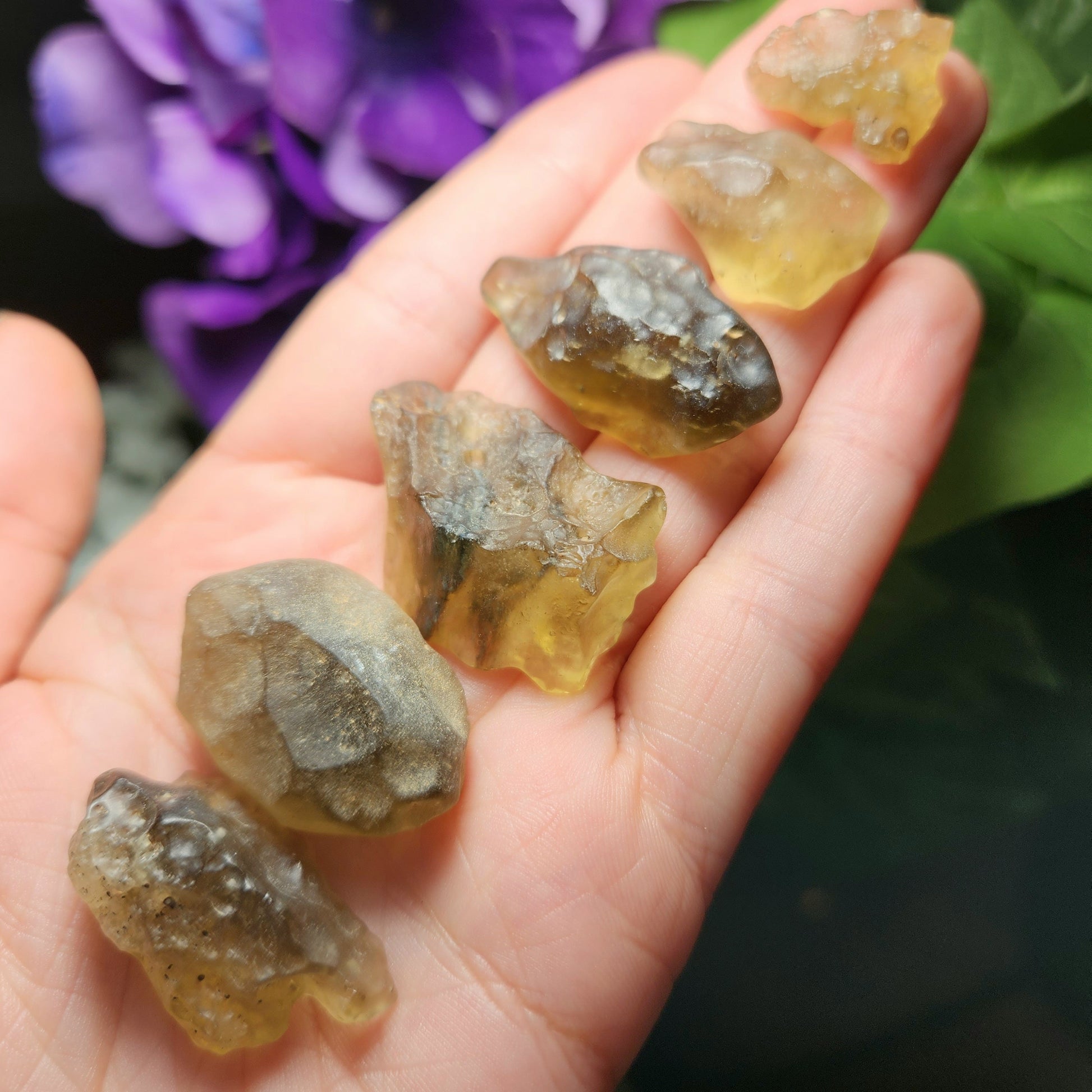 These Libyan Desert Glass tektites exhibit a rare, dark coloring varying from a greenish yellow to a dark golden, with streaks of black. These raw specimens have unique shapes, they may contain remaining bits of sand from their desert origins or may showcase Cristobalite inclusions.