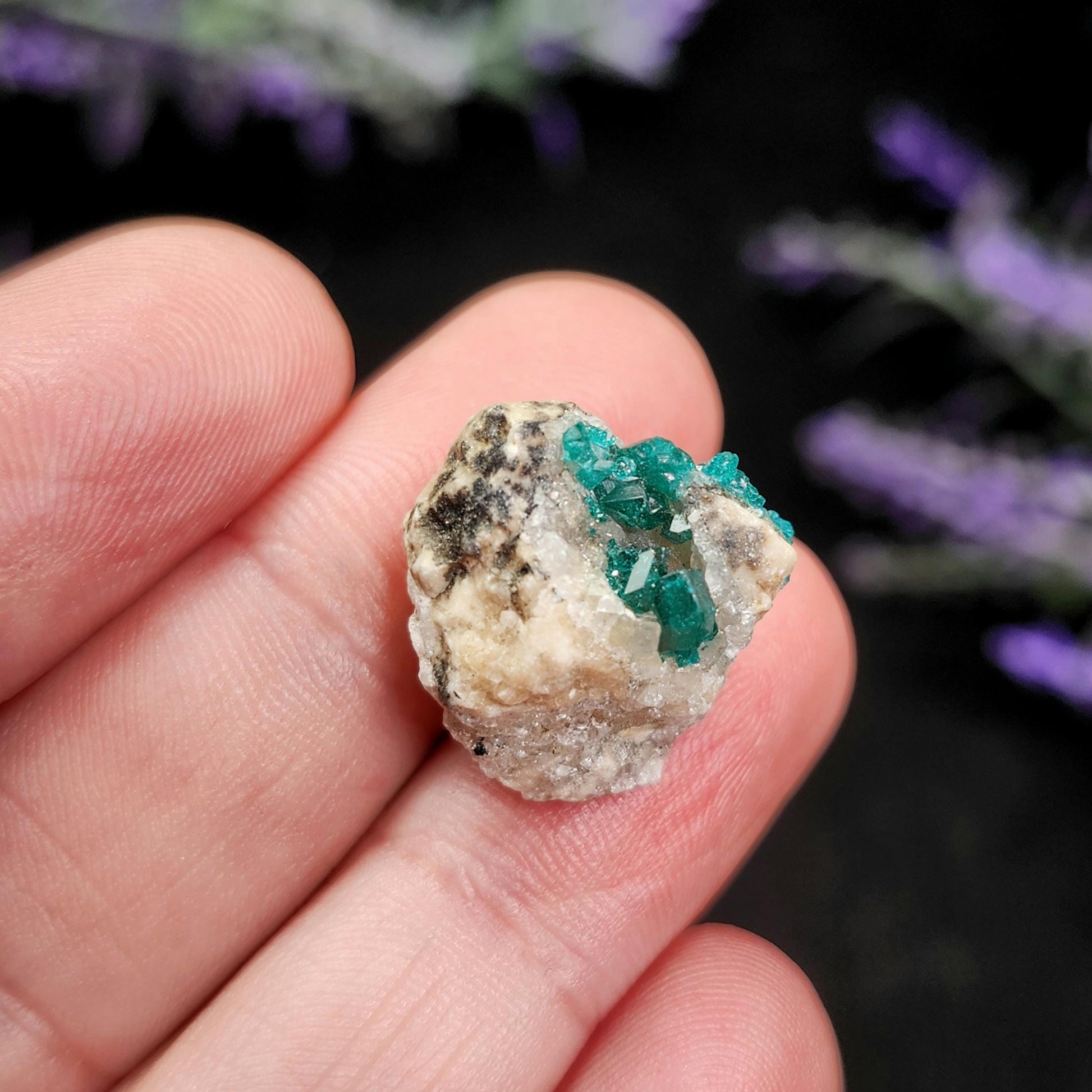 These Dioptase crystals from Kazakhstan exhibit rich teal to deep emerald-green coloration, sitting upon a contrasting white matrix. Ranging from tiny to distinct terminations, each raw crystal cluster has its own unique look.