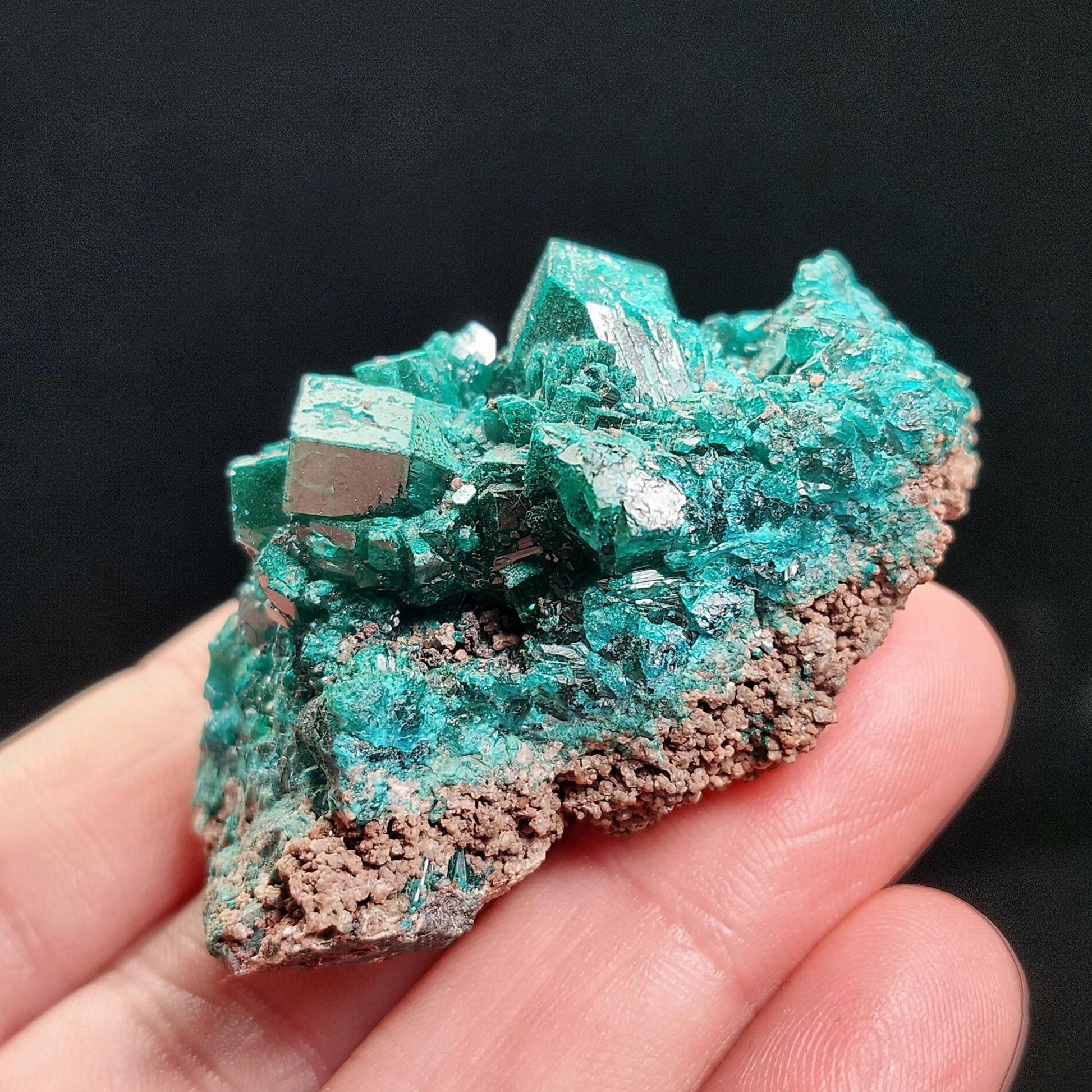 This sparkling Dioptase displays saturated teal coloring, with cubic terminations clustered together atop a brown matrix. This specimen measures 47mm by 25mm and weighs 41.3 grams.