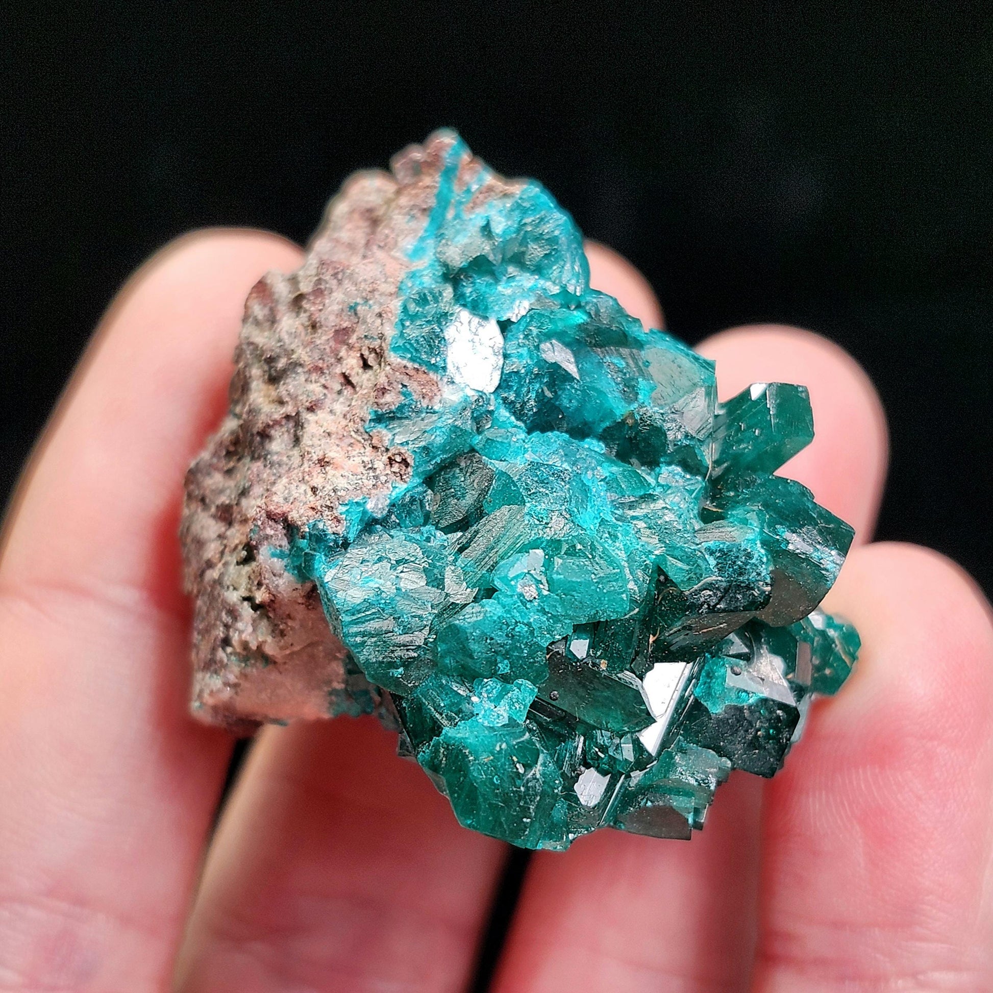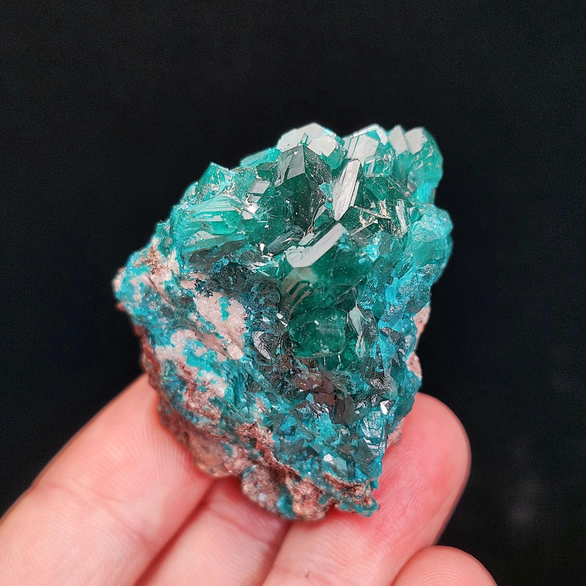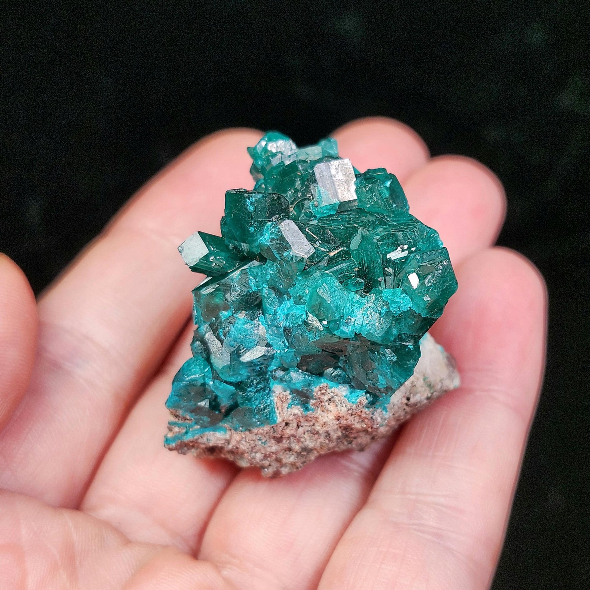 This Dioptase displays saturated teal and deep green coloring, with gemmy terminations clustered together atop a brown matrix. This specimen measures 39mm by 34mm and weighs 50.7 grams.