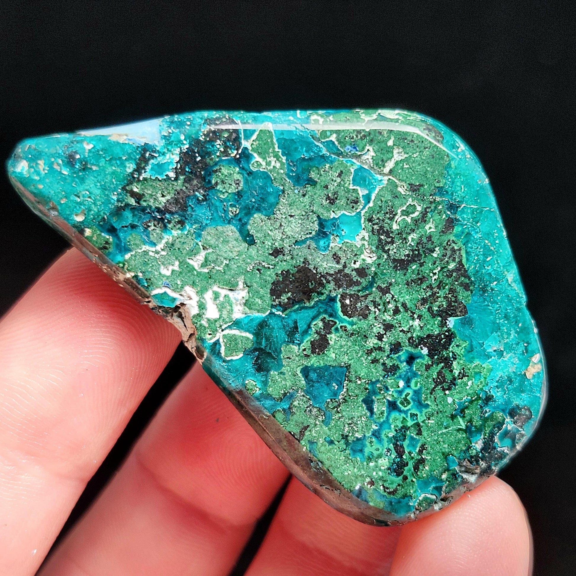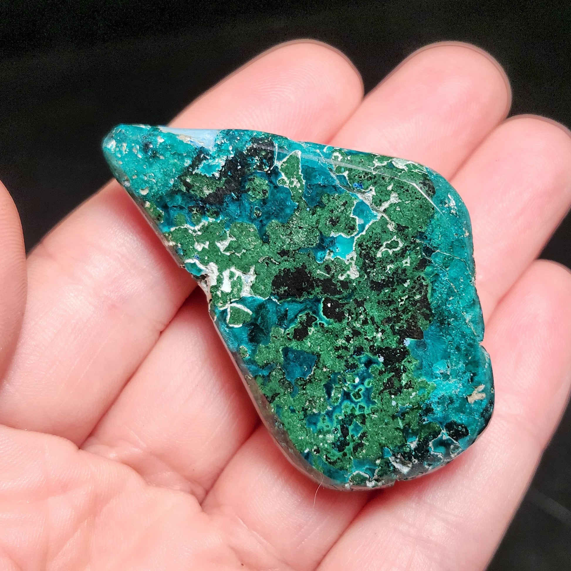 This Dioptase crystal from the Congo displays saturated teal gemminess marbled with green, white, and a touch of blue. It has a freeform shape with a domed side as well as a flattened side, and contains divots in its surface. This specimen measures 53mm by 30mm by 15mm and weighs 44.5 grams.