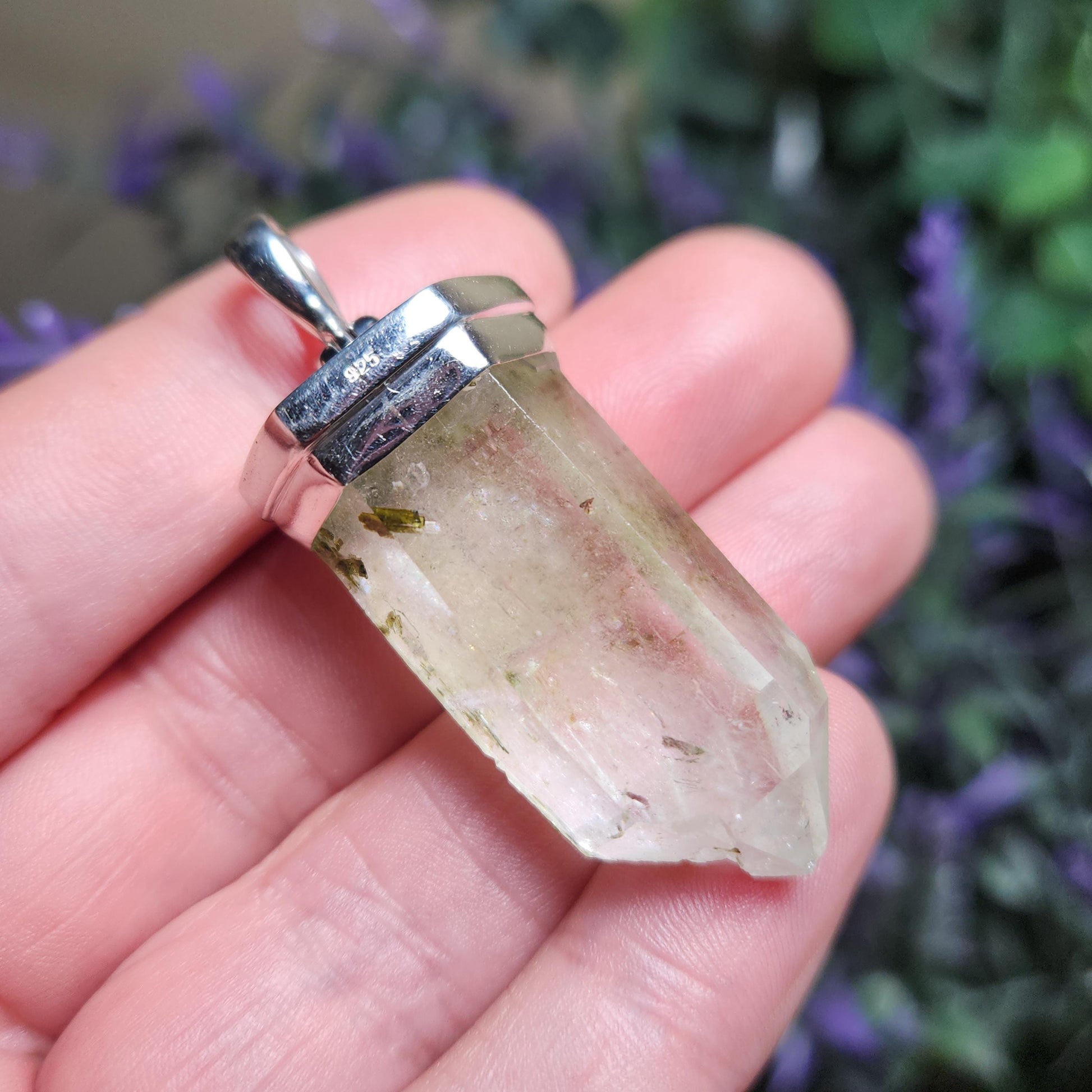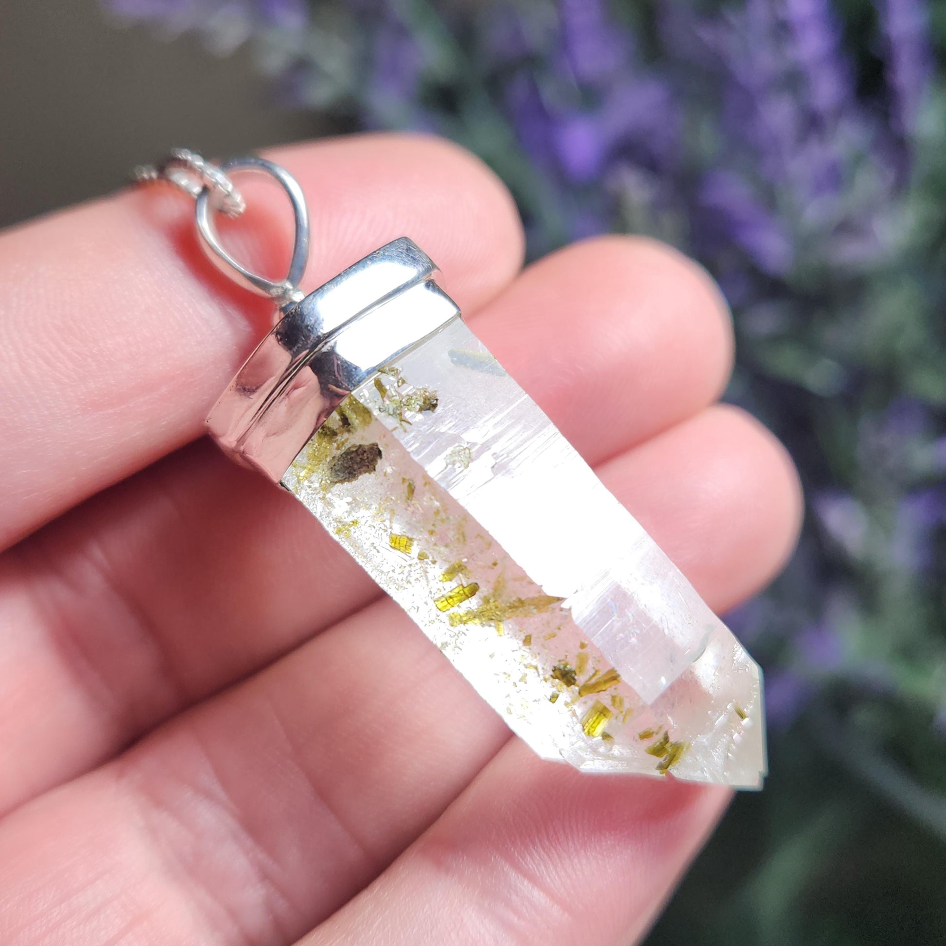 This naturally terminated Quartz stone has streaks of dark green Epidote embedded within its milky translucence. This crystal has been custom created into a sturdy piece of jewelry using .925 Sterling Silver. This pendant measures approximately 46mm by 17mm. The silver chain used in the photos is to help envision how this pendant will look while adorned but is not included in the listing.