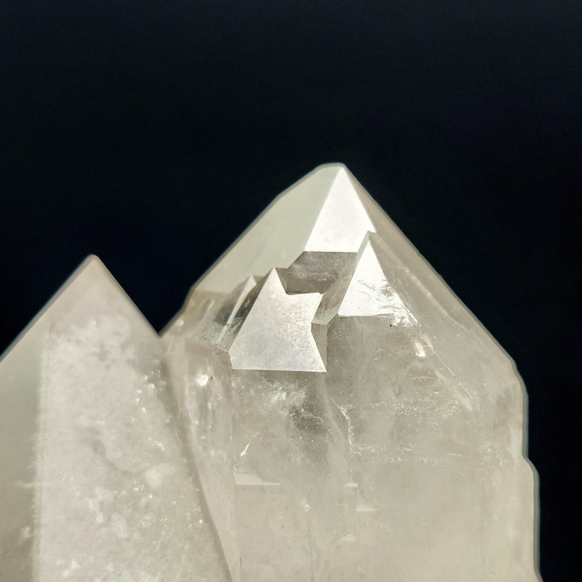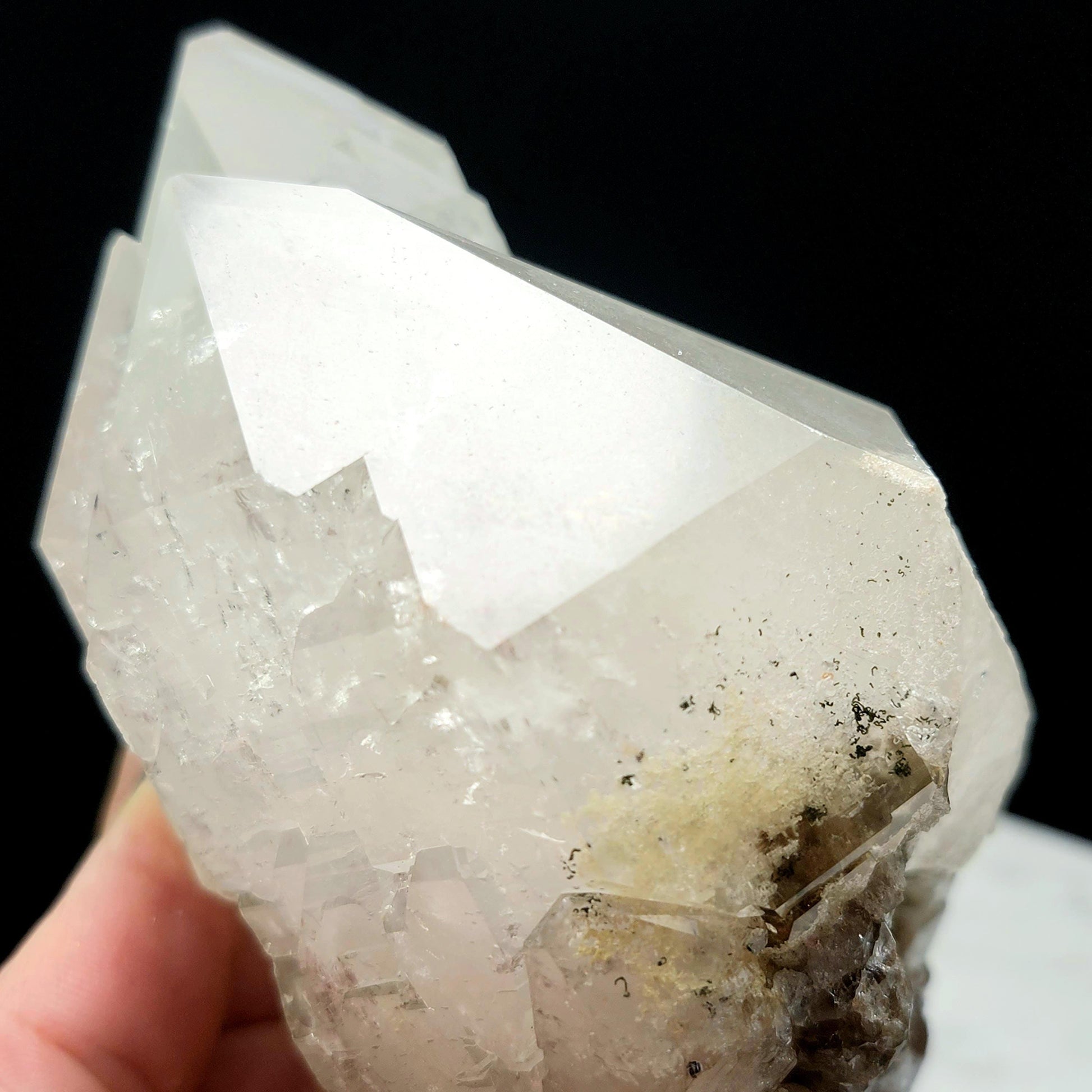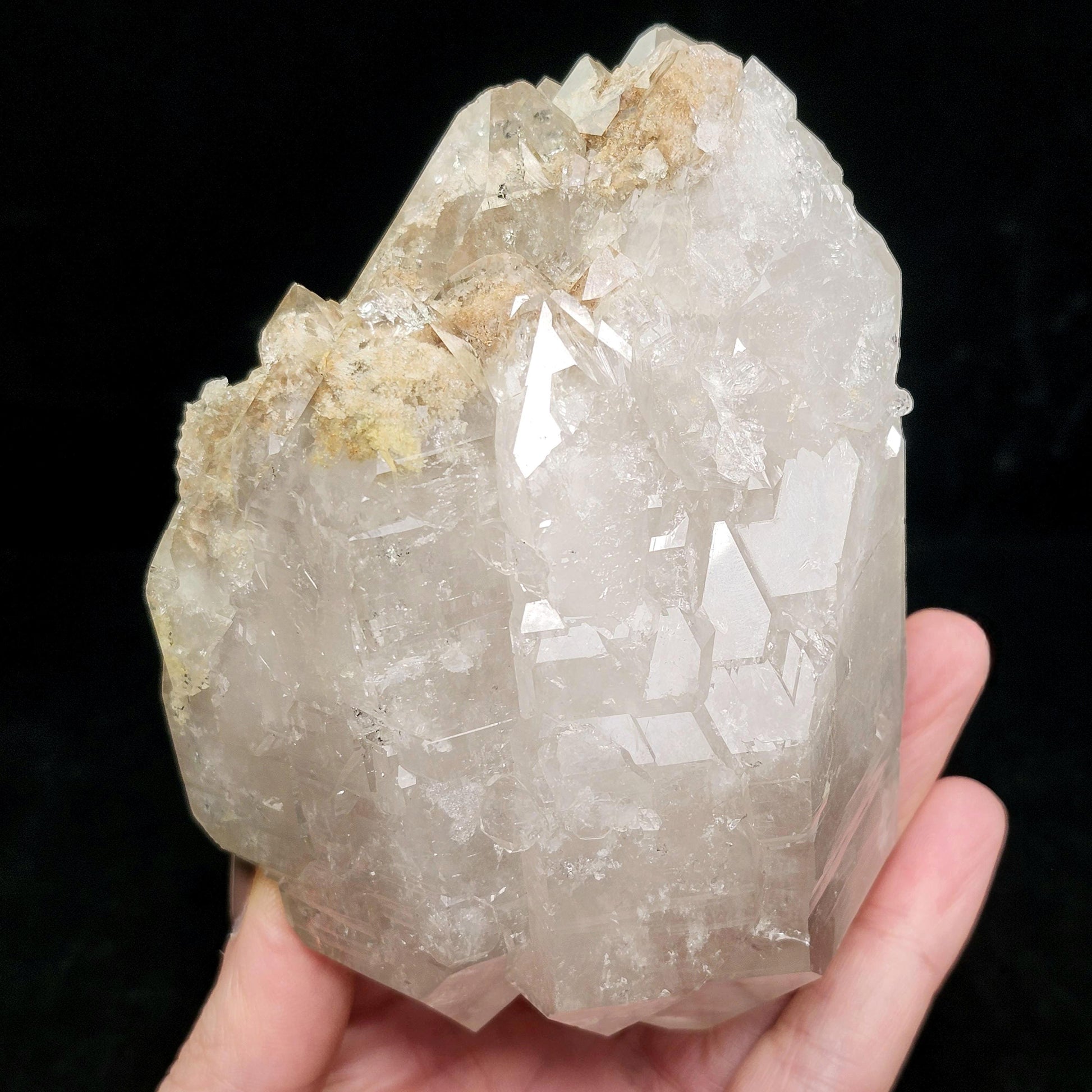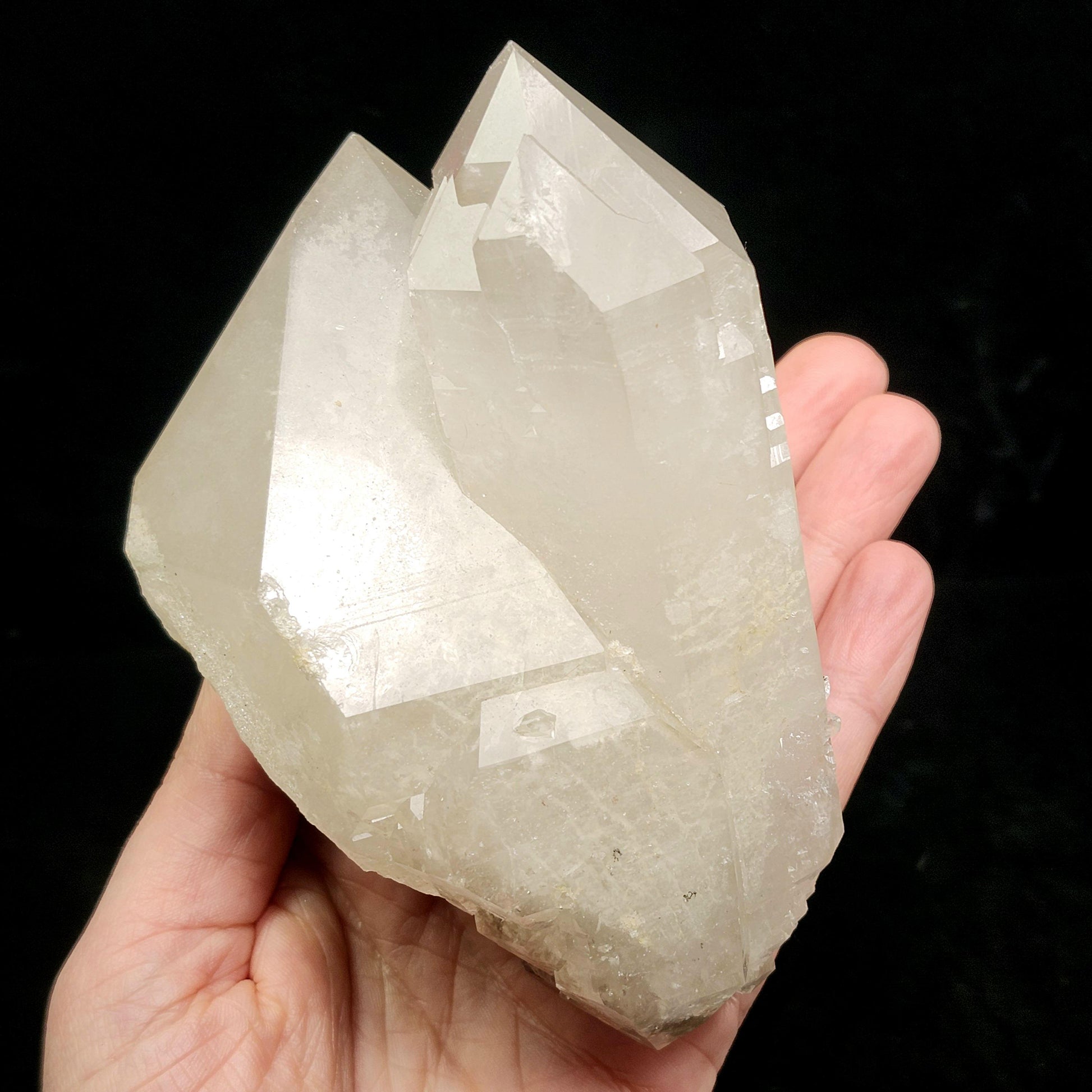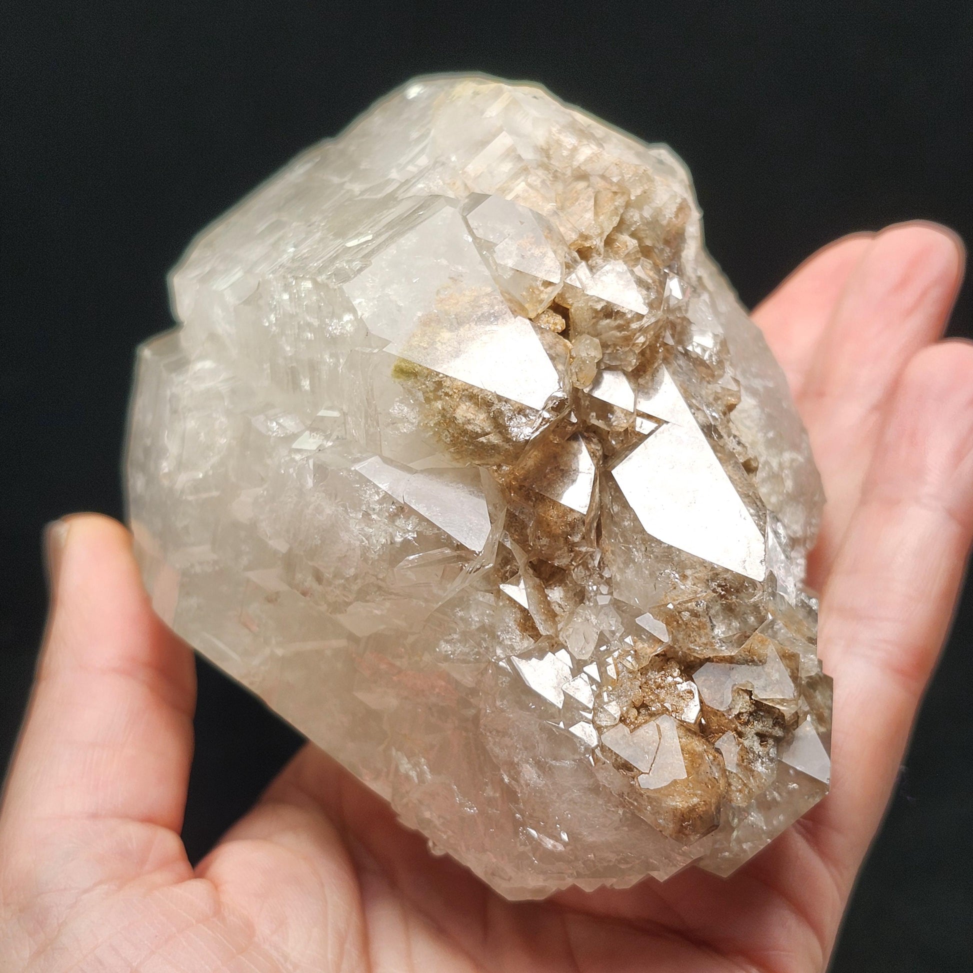 This Garden Quartz, also known as Lodolite, from a late 2024 find in Brazil, has striking termination and shining elestial growth. Its cloudy translucence offers a view into the unique mineral inclusions inside. This specimen measures approximately 110mm by 68mm by 60mm and weighs 1.2 pounds.