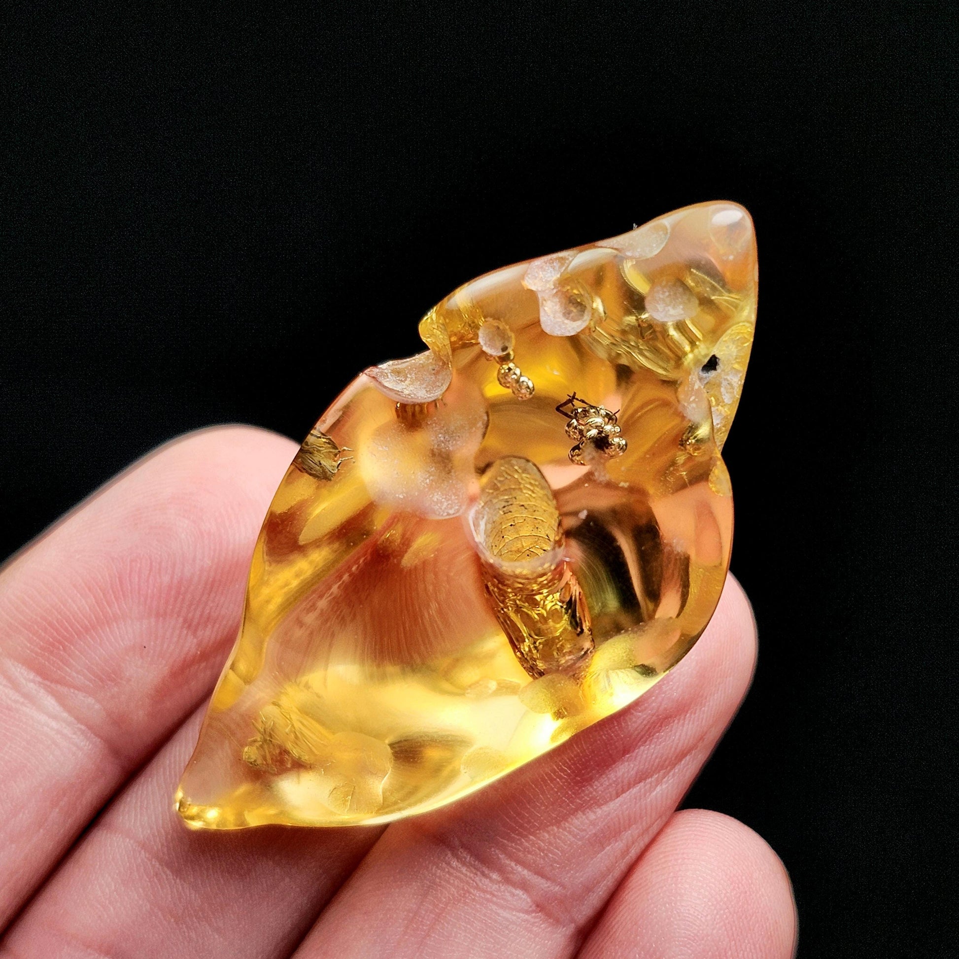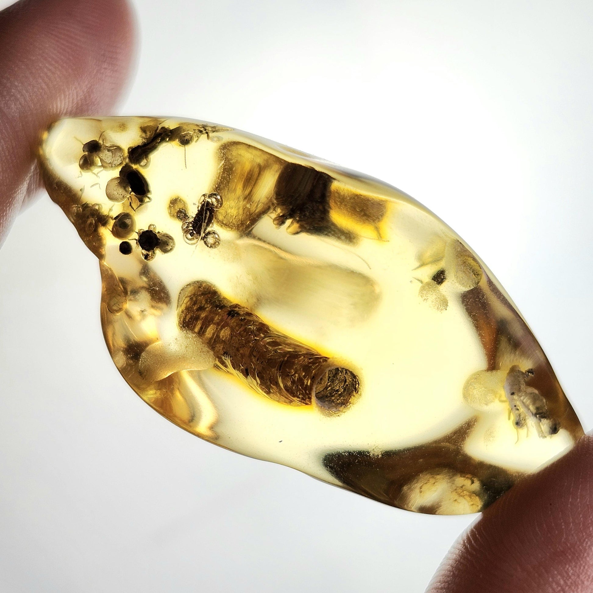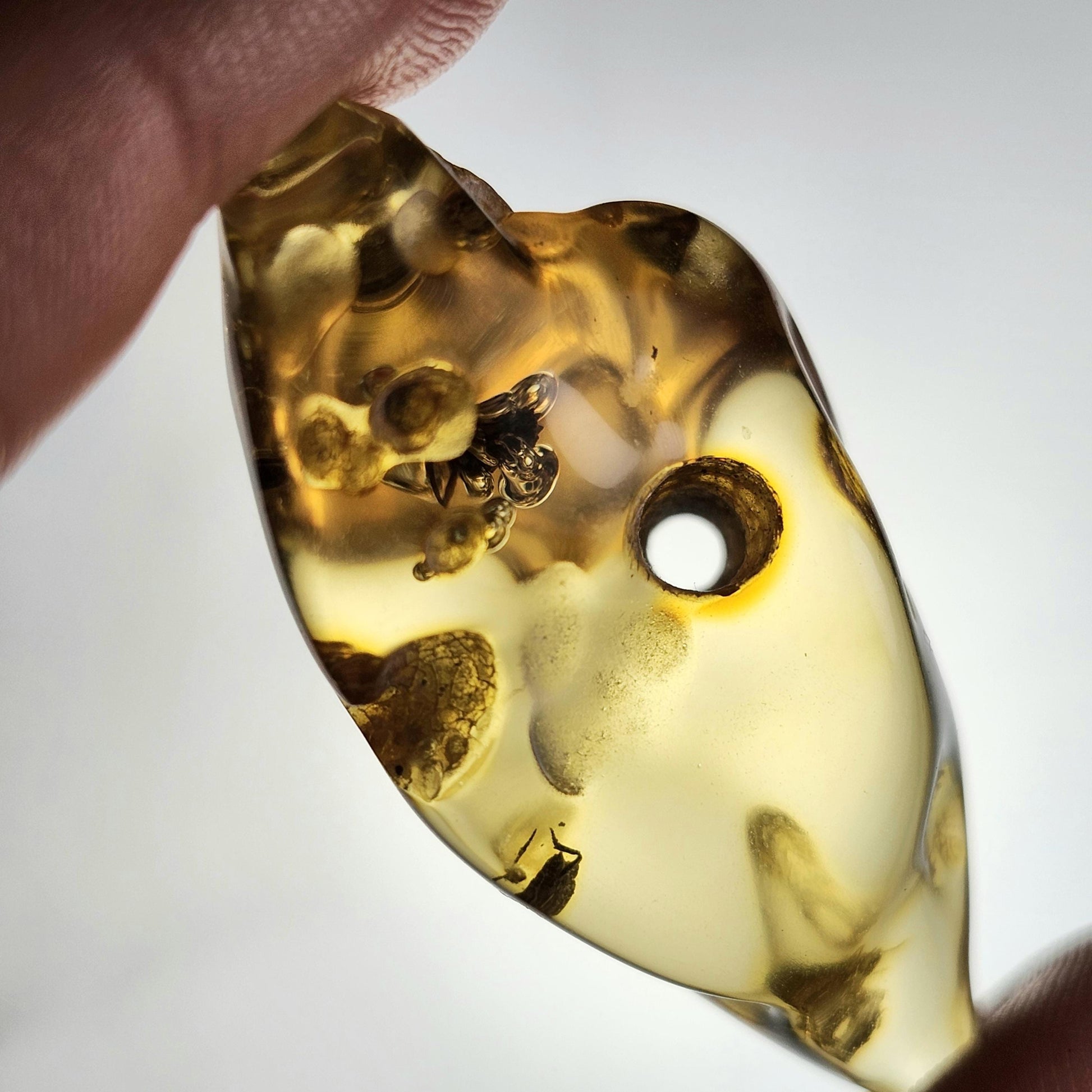 This glowing Amber from Colombia has been polished to a high sheen and displays golden translucence, showing off the array of different insect inclusions and enhydro bubbles inside. It contains a tunneled hole that runs through the specimen - natural occurring holes in stones have long been considered potent magical tools! There is an enhydro bubble that shows very slight visible movement, shifting back and forth within an insect's body cavity. This Amber glows with a colorful, saturated brilliance when under a black light - a rare quality in the mineral kingdom! This specimen measures approximately 46mm by 22mm and weighs 8.8 grams.