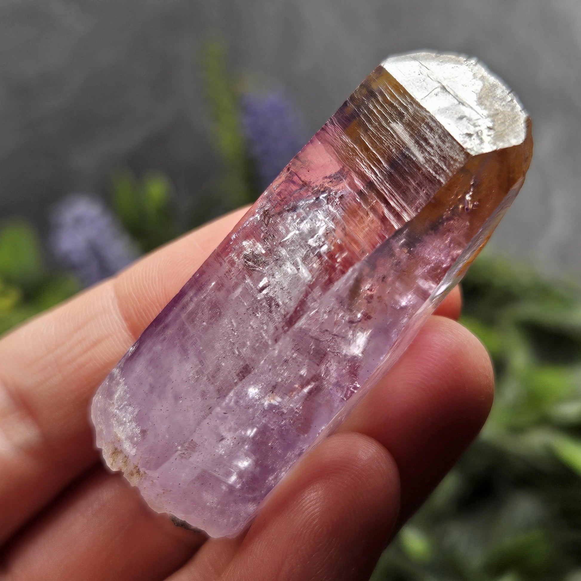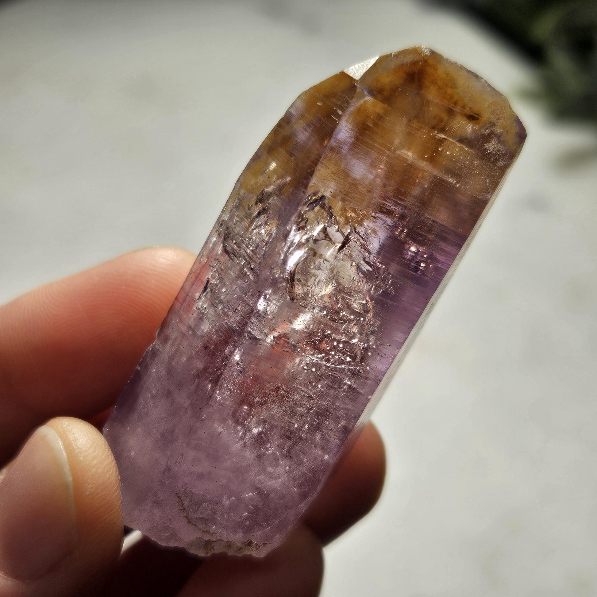 This enhydro, water bubble included Amethyst crystal from Brazil is from an Old Stock collection from over 20 years ago. It exhibits a distinct termination and showcases a multi-toned purple color zoning and a moving enhydro bubble within its depths. The 1mm bubble shows visible movement, shifting within a 5mm cavity. This specimen measures approximately 51mm by 23mm by 15mm.