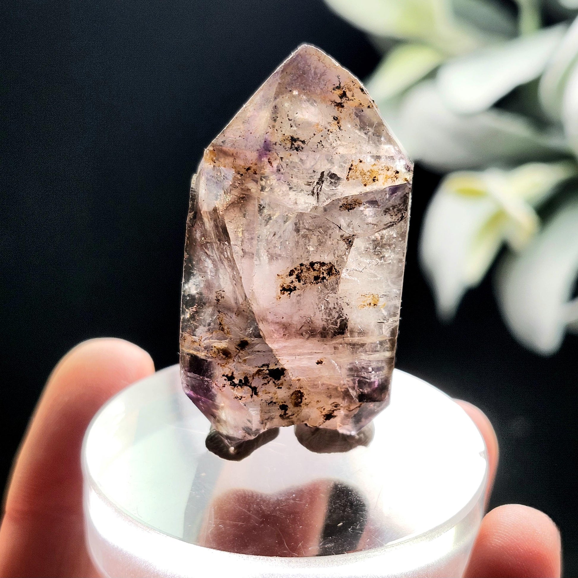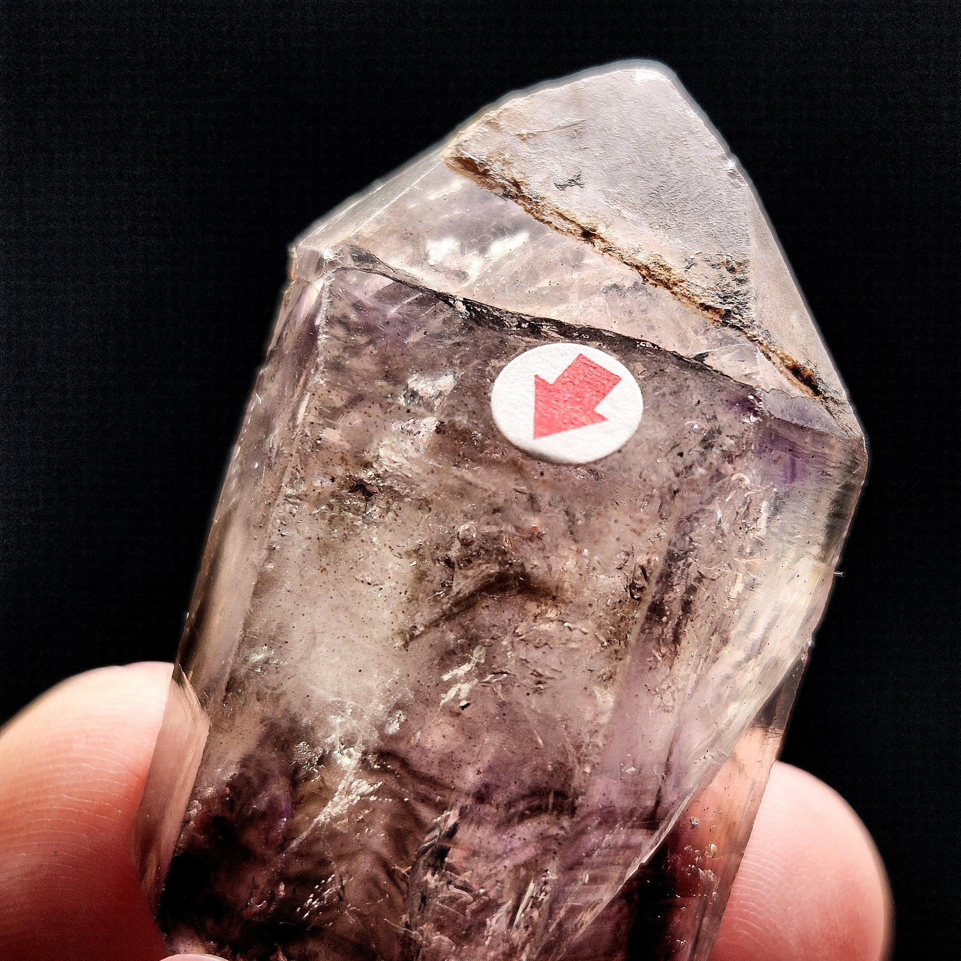 This high-quality Enydro Shangaan Amethyst crystal from the Chibuku mine exhibits natural termination, showcasing purple color zoning, smoky wisps, and mineral inclusions within its translucent depths. It features a distinct 1mm enhydro bubble that shows visible movement. This specimen measures approximately 45mm by 26mm and weighs 43.9 grams.
