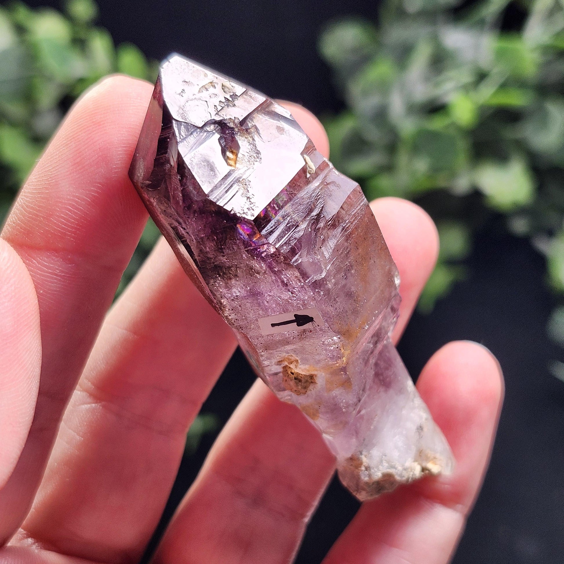This high-quality Shangaan Amethyst crystal from the Chibuku mine exhibits a distinct termination, showcasing purple color zoning and a moving enhydro bubble within its captivating, smoky depths. The 1mm bubble shows visible movement, shifting within a 5mm cavity. Your crystal will arrive with a small stickered arrow on its surface to help locate the enhydro bubble with ease. This specimen measures approximately 70mm by 25mm and weighs 50.9 grams.