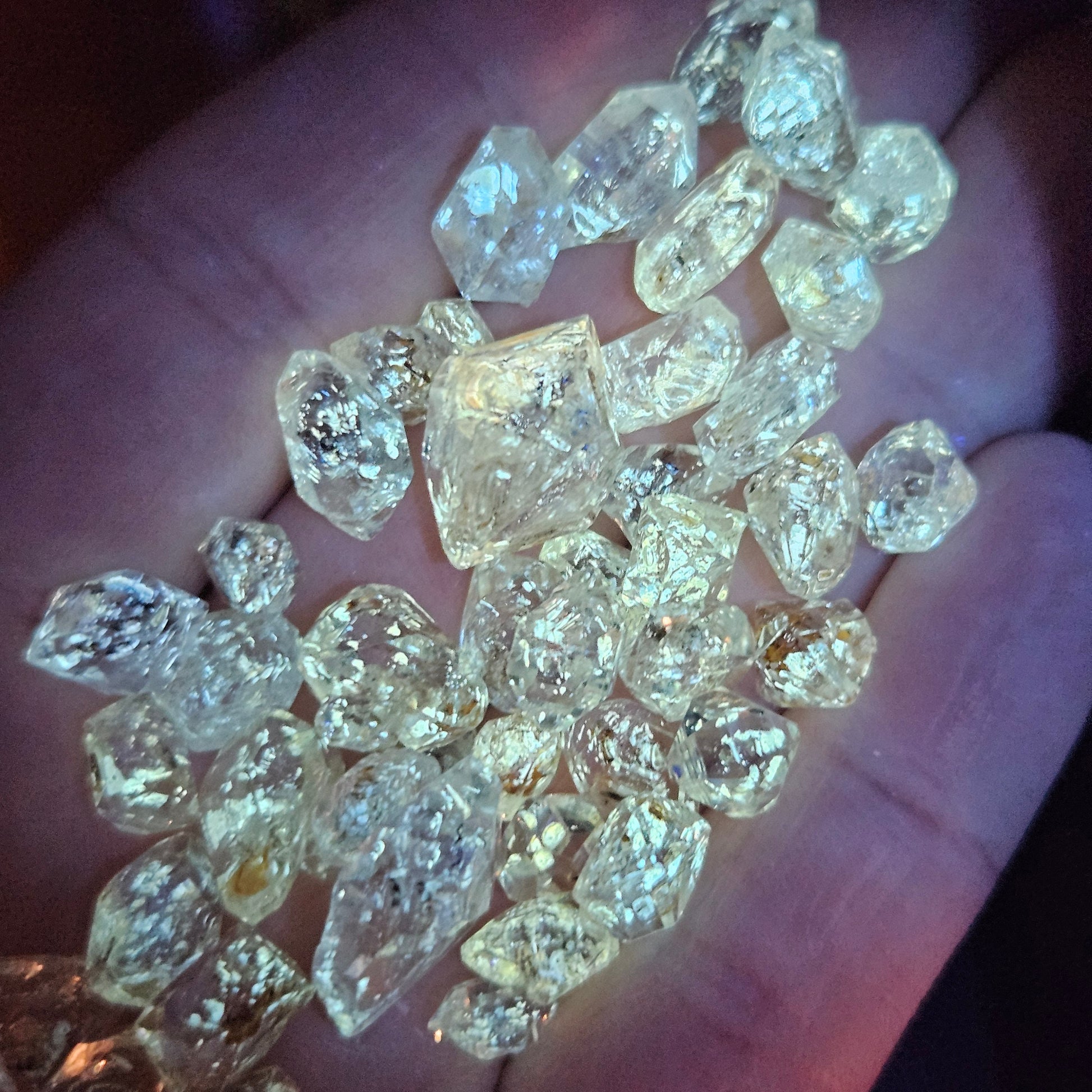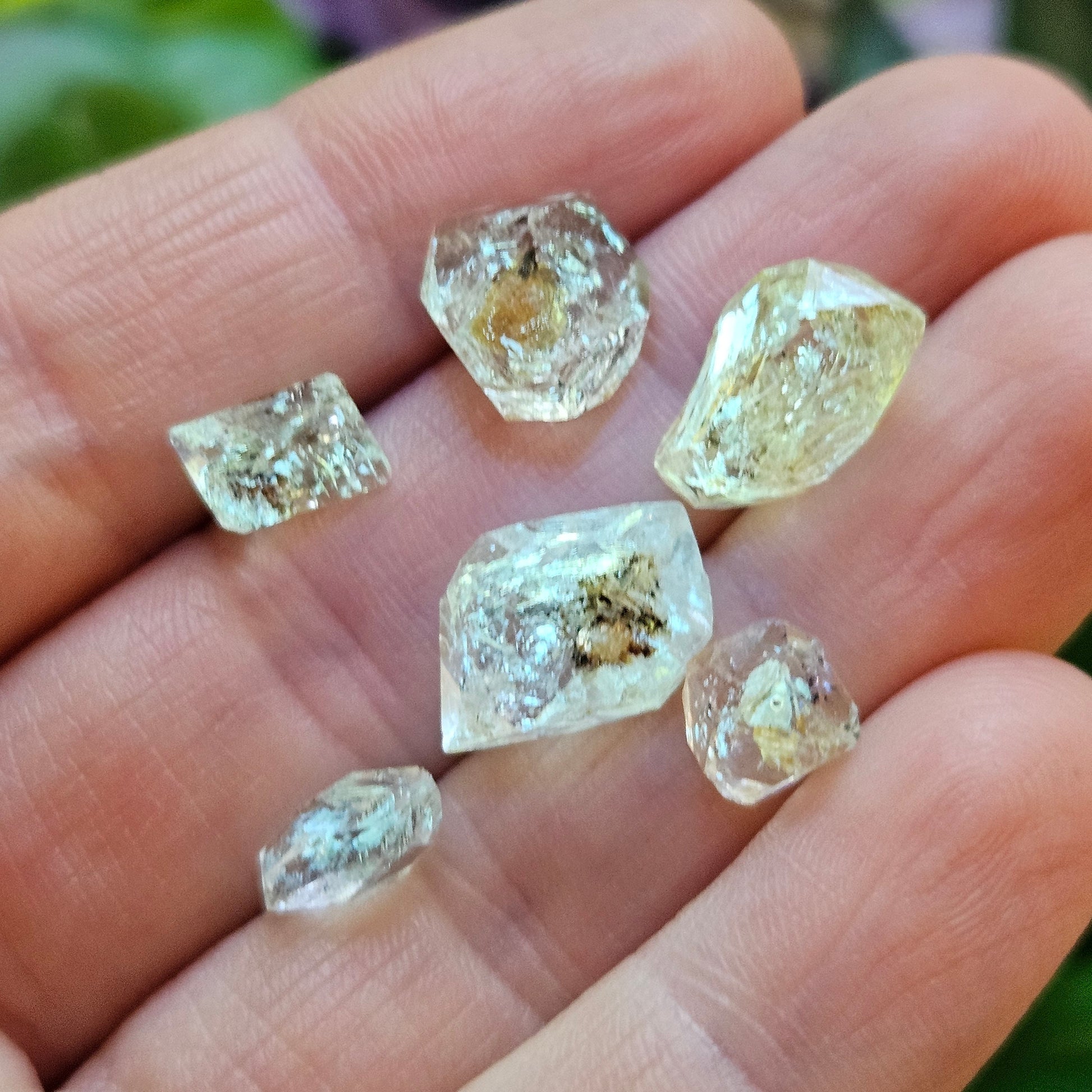 These UV Reactive Enhydro Petroleum specimens are absolutely MAGICAL! They have a translucence, and sometimes smoky glow, with inner Enhydro liquid pockets that flash bright green in an ultraviolet light. Most of the Petroleum within these crystals are static but every once in a while there are movers too! These Petroleum Enhydro crystals have crisp faceted terminations and include possible light abrasions from the mining process.