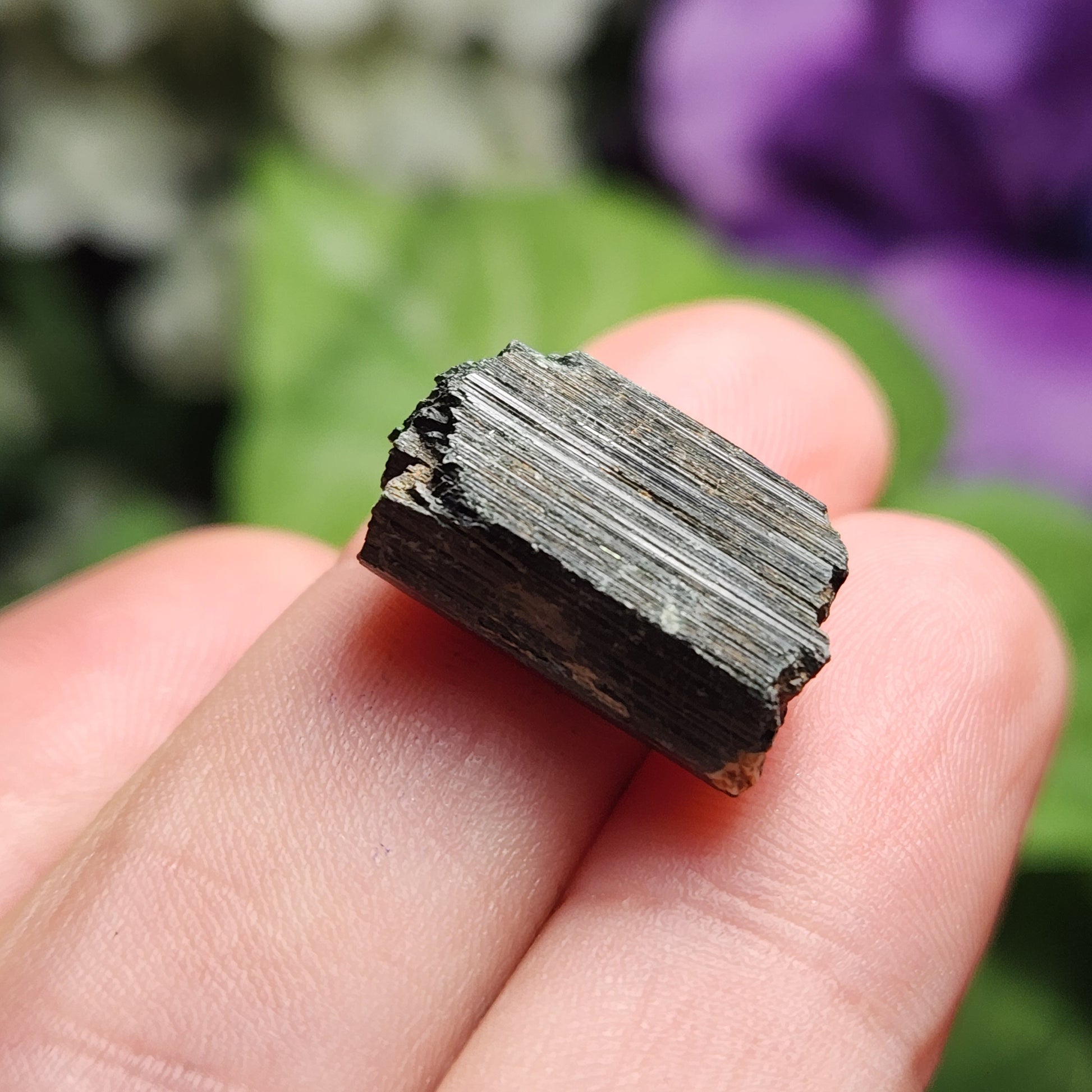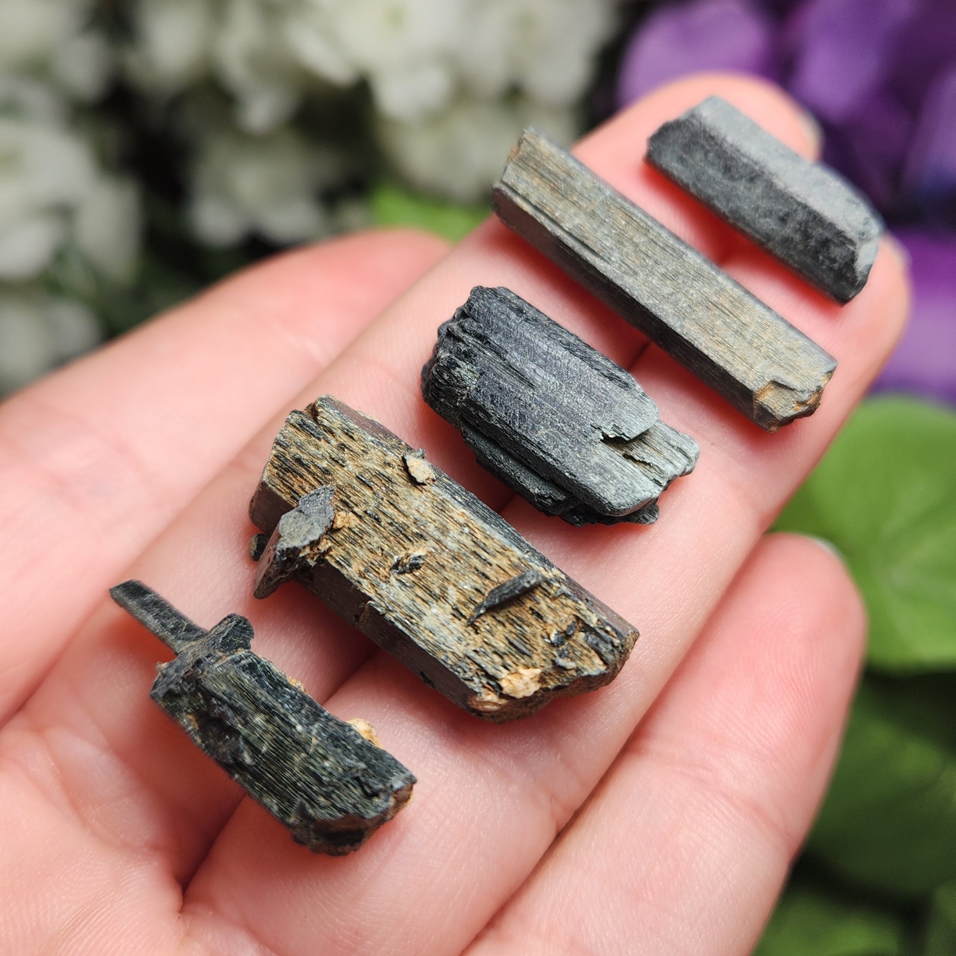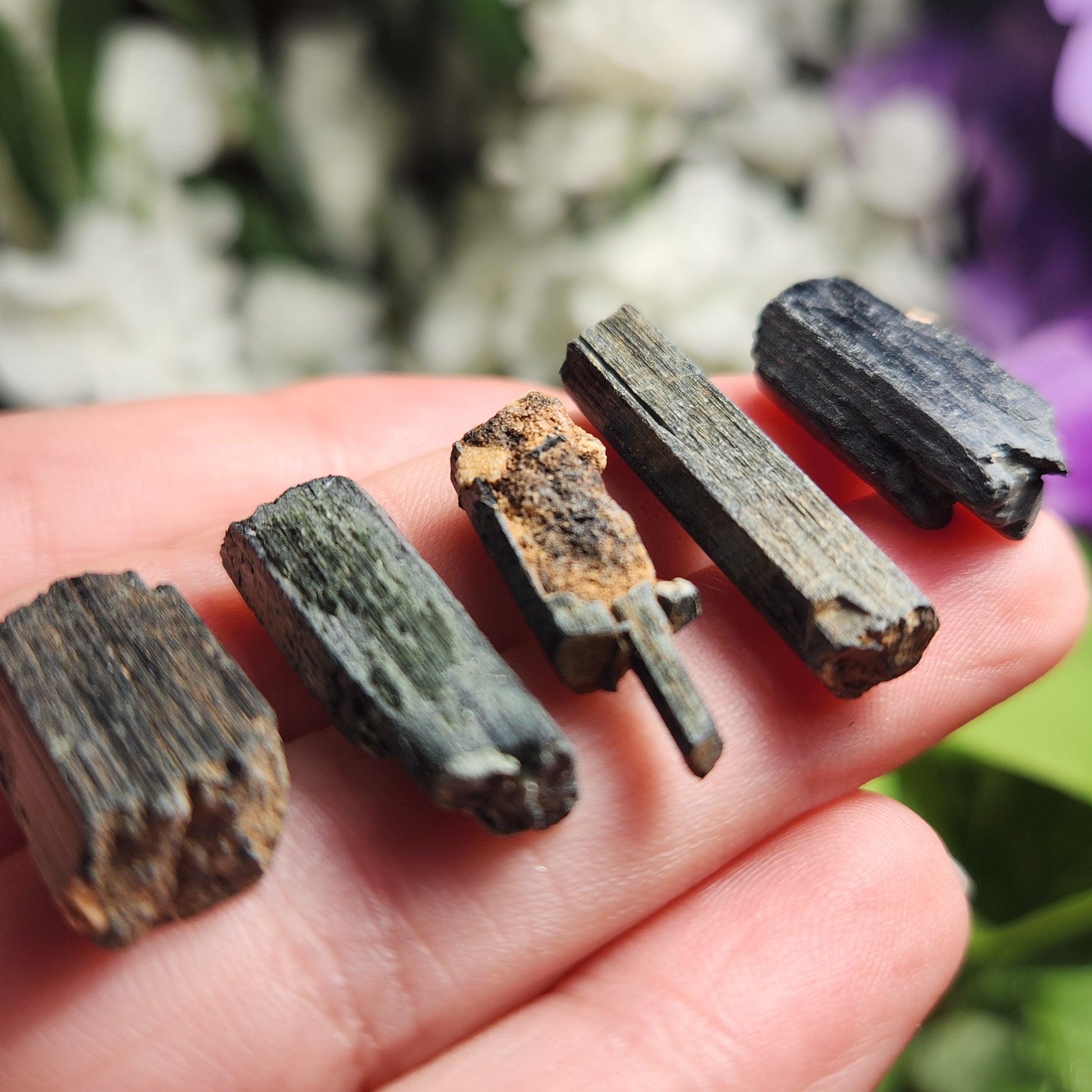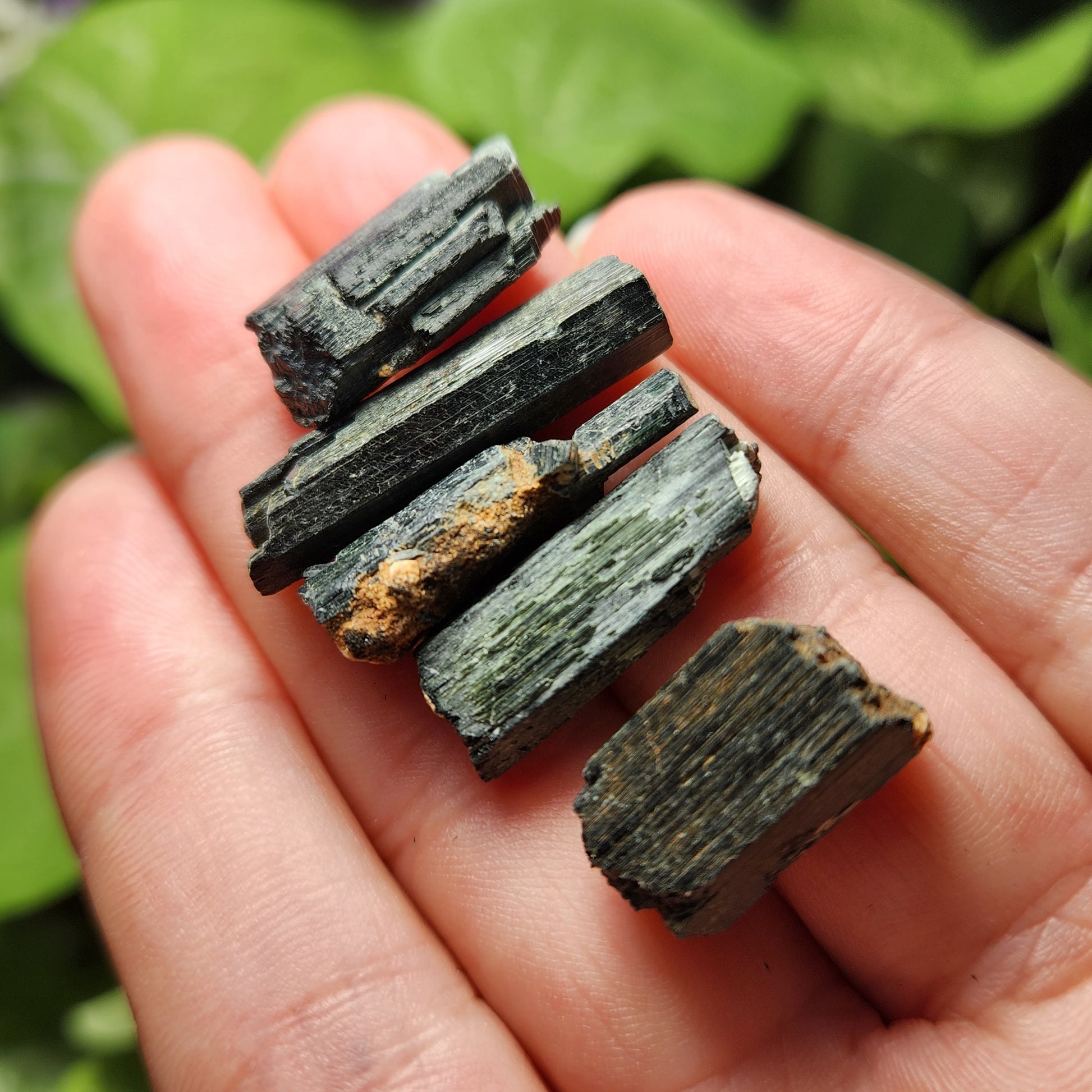 These raw Epidote crystals from Morocco have a very deep forest green to black coloring with visible striations. Each unique crystal weighs between 15mm and 25mm.