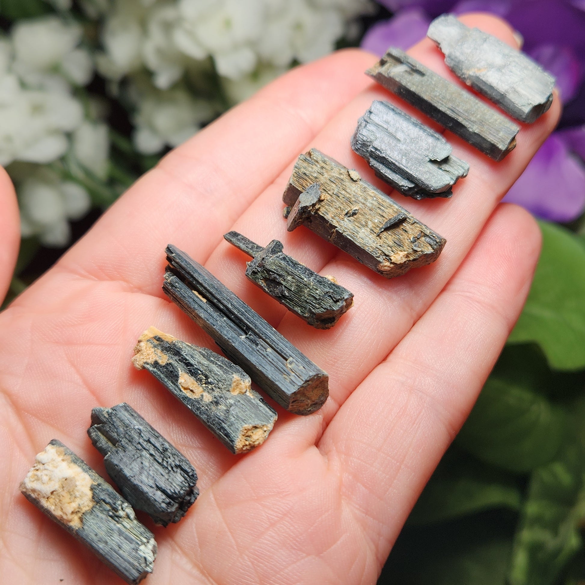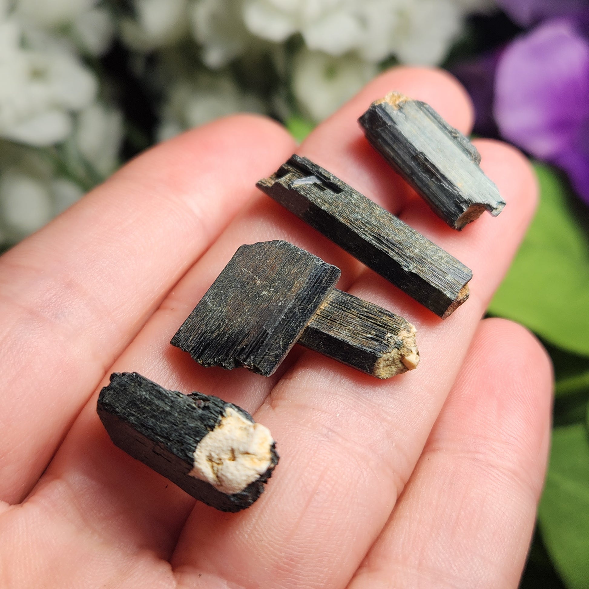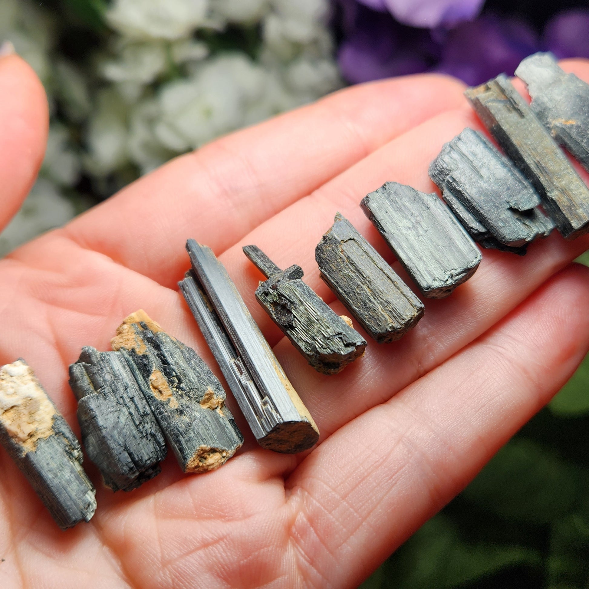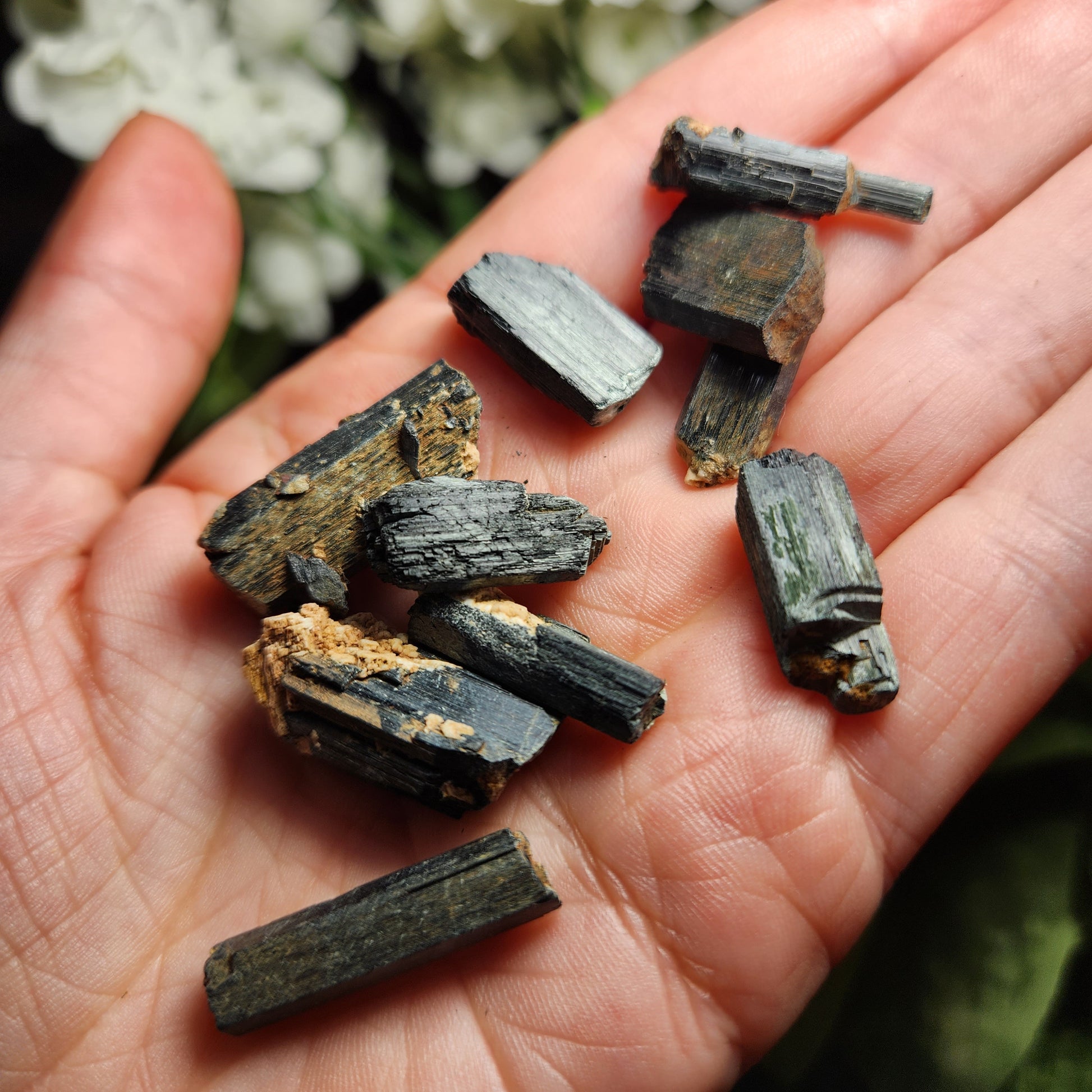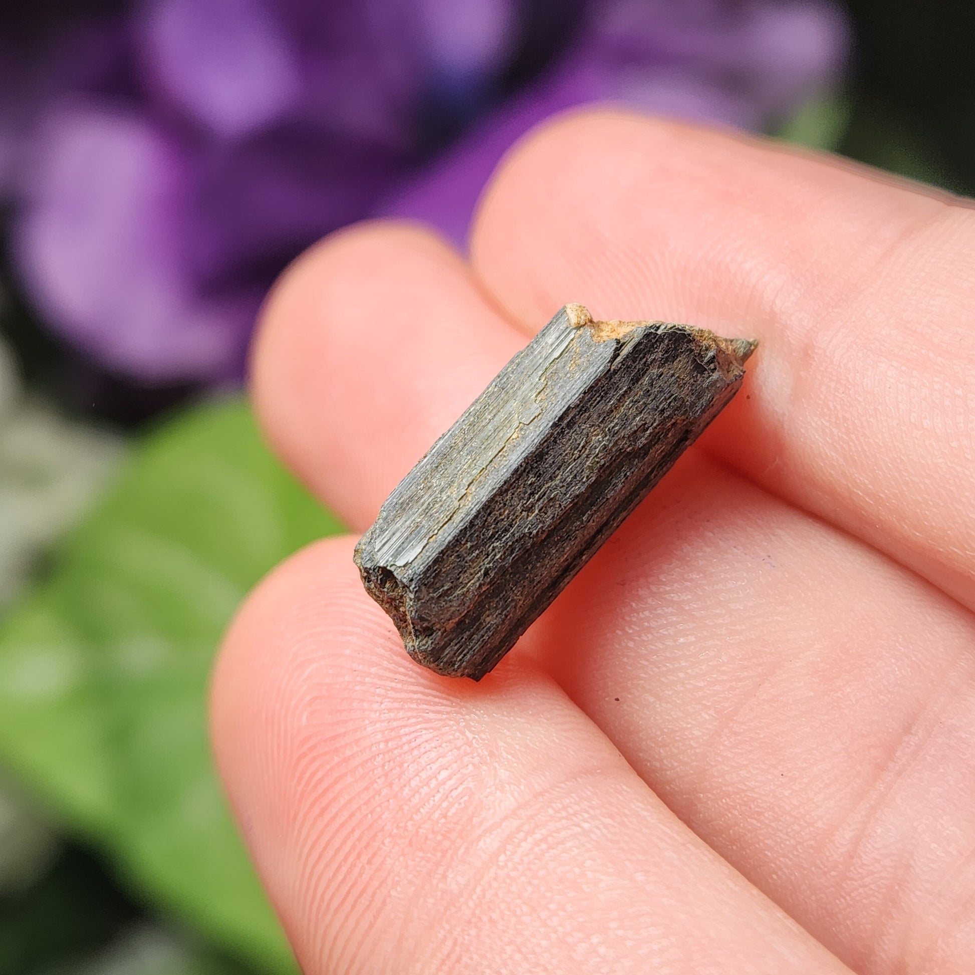 These raw Epidote crystals from Morocco have a very deep forest green to black coloring with visible striations. Each unique crystal weighs between 15mm and 25mm.