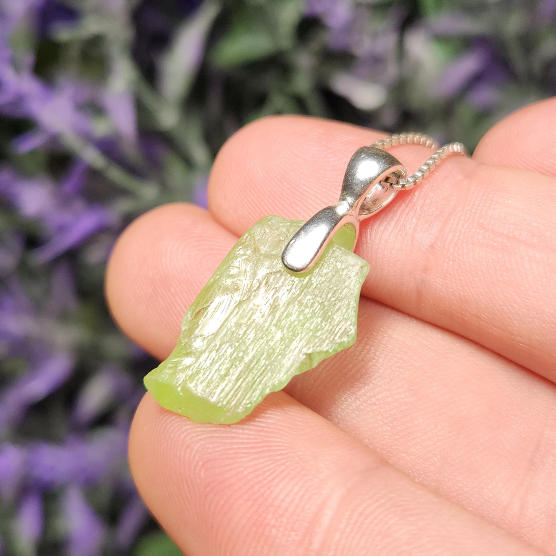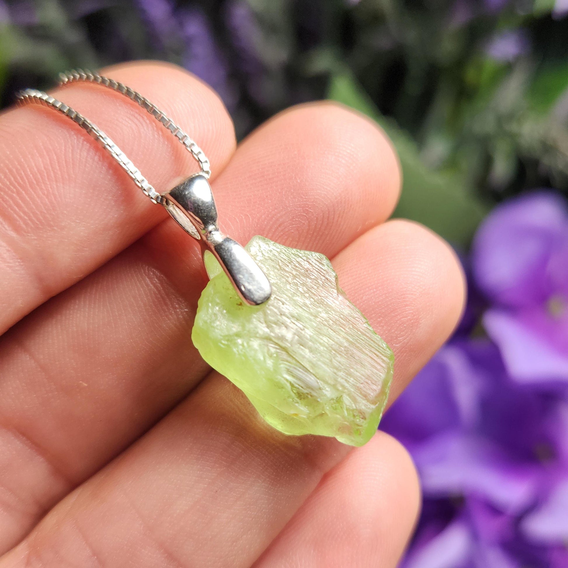 This raw Peridot gemstone displays a classic lime green coloring and has etching on its face that catches and reflects light. This crystal has been custom created into a sturdy piece of jewelry using .925 Sterling Silver. This unique pendant measures approximately 26mm by 14mm. The silver chain used in the photos is to help envision how this pendant will look while adorned but is not included in the listing.