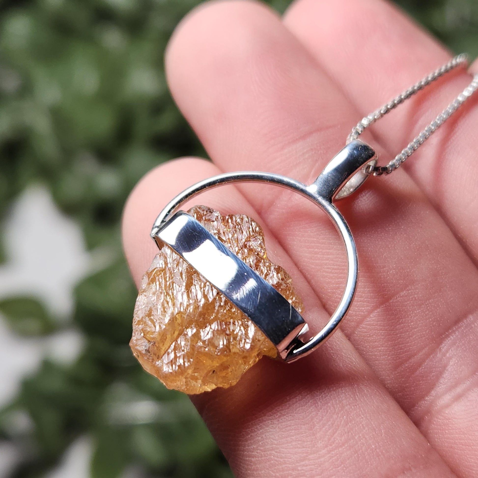 This Topaz stone has a golden-orange coloring and exhibits etching on its raw surface. This crystal has been custom created into a sturdy piece of jewelry using .925 Sterling Silver. This pendant measures approximately 30mm by 19mm. The silver chain used in the photos is to help envision how this pendant will look while adorned but is not included in the listing.