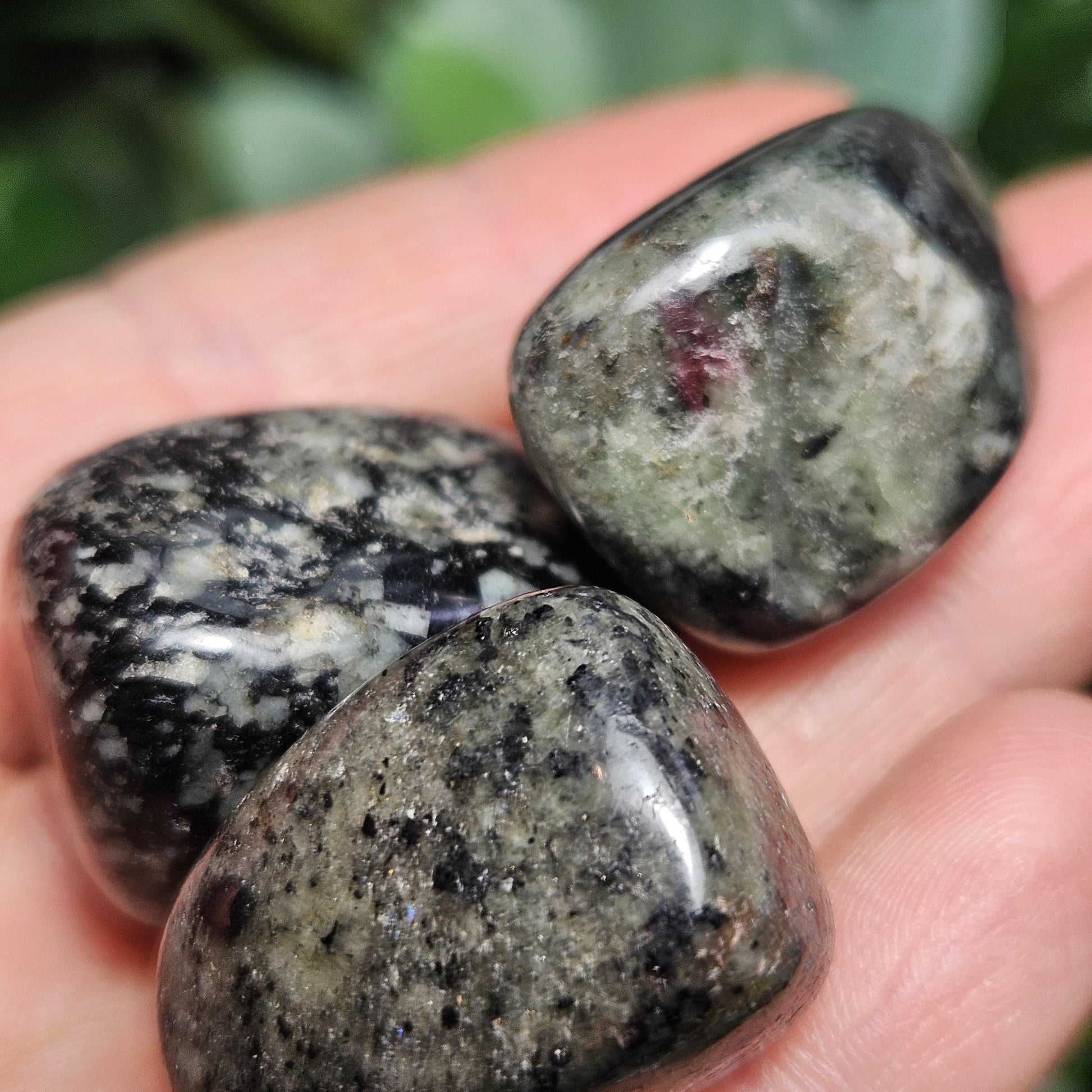 These polished Eudialyte crystals from Russia exhibit slight speckles of red mottled with black and white. These crystals display some fluorescence, glowing slightly when under a black light - a rare quality in the mineral kingdom! Each chunky specimen measures between .75 and 1 inch.