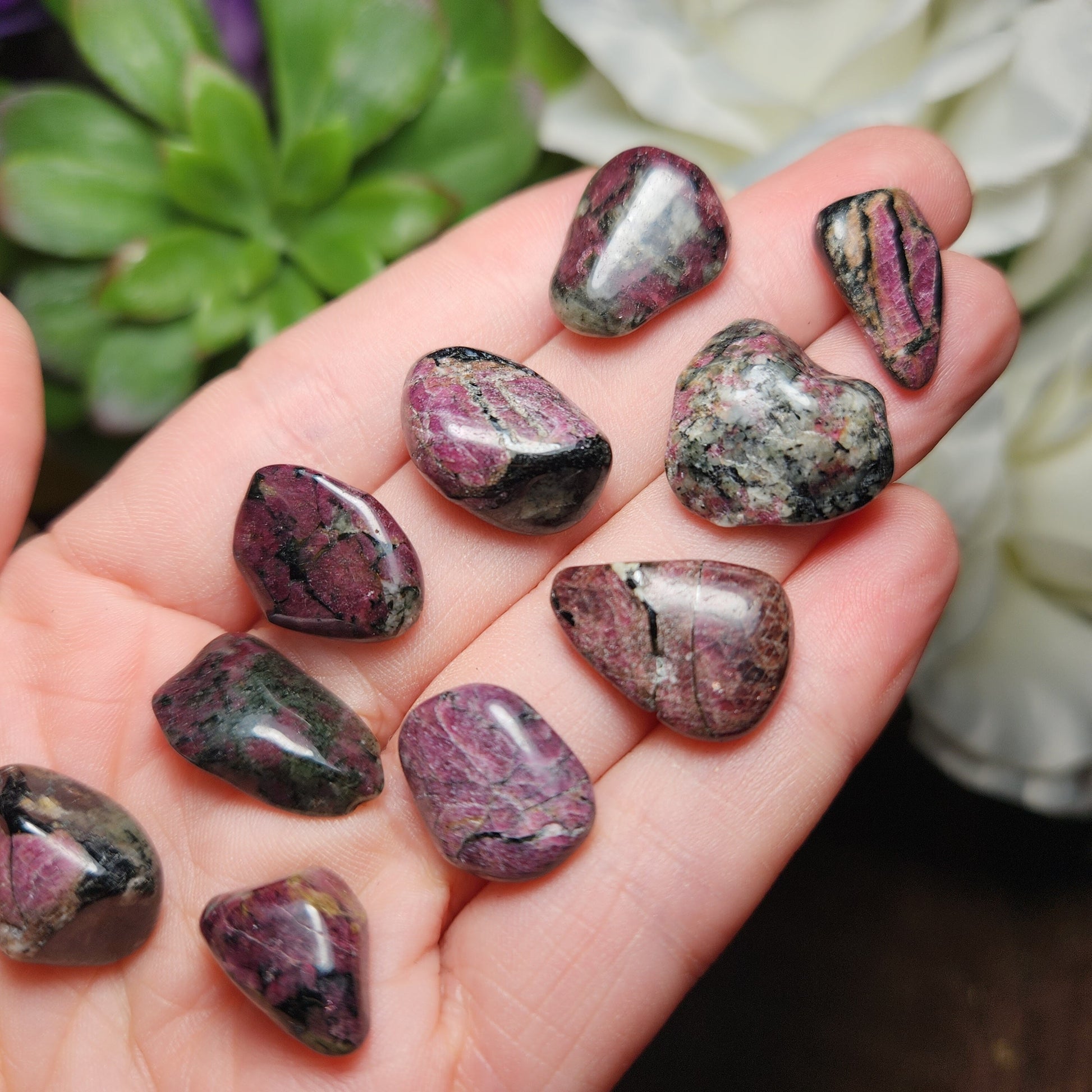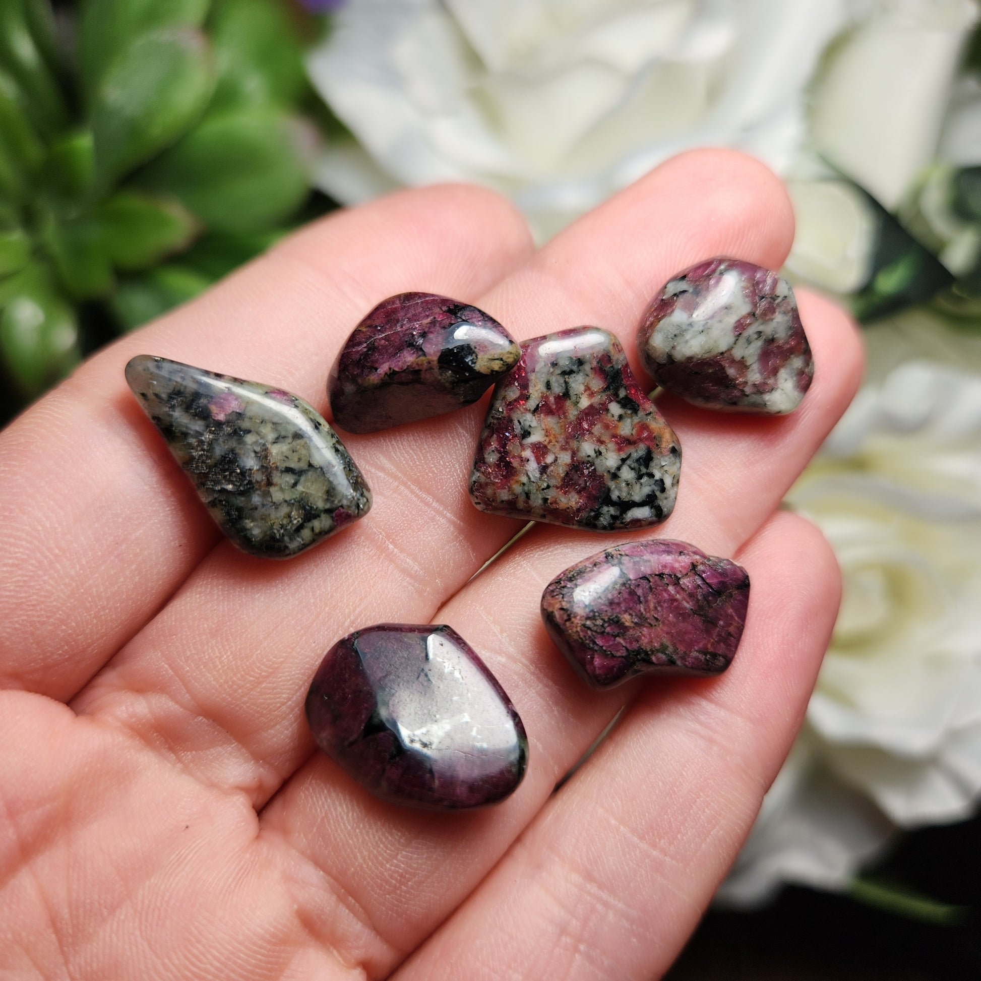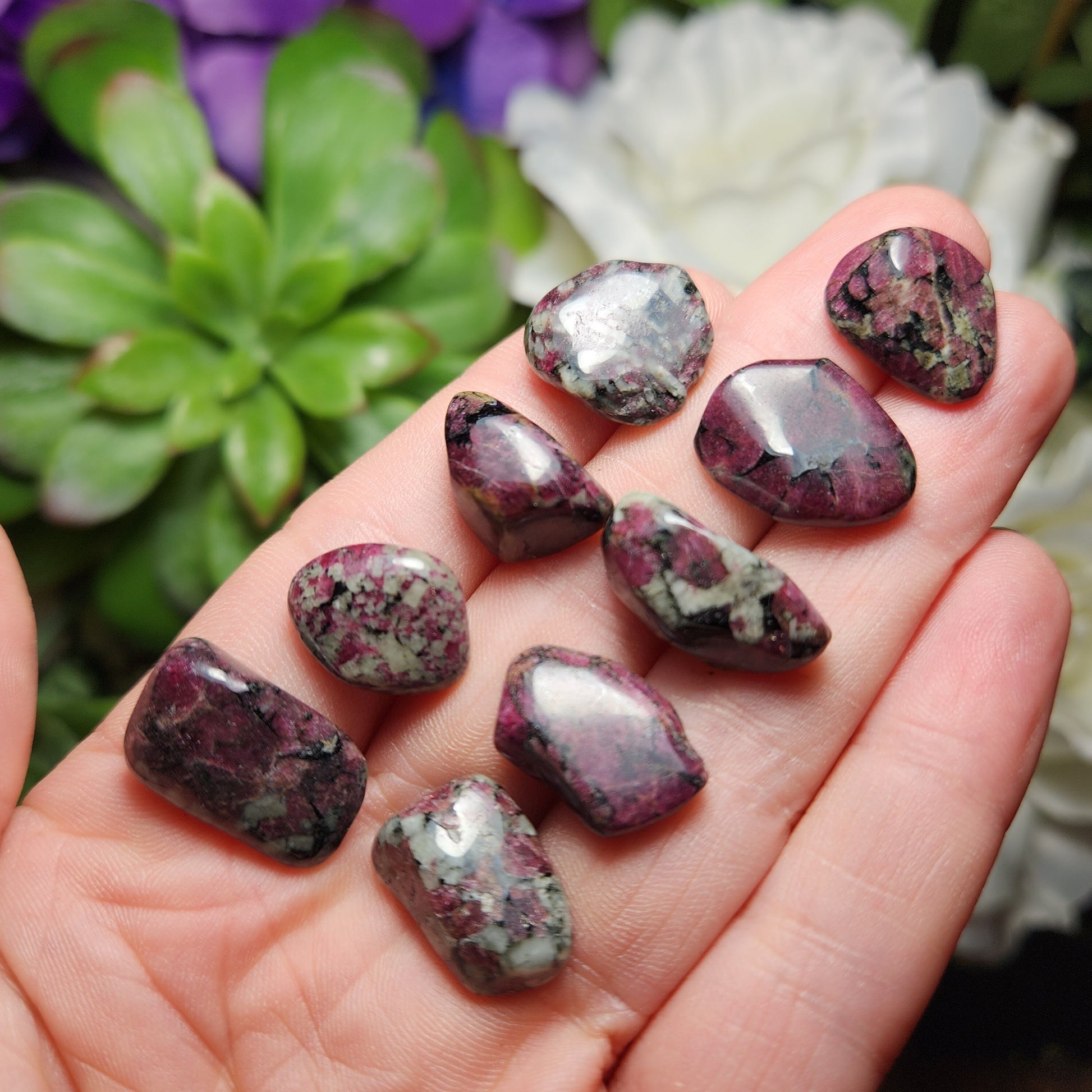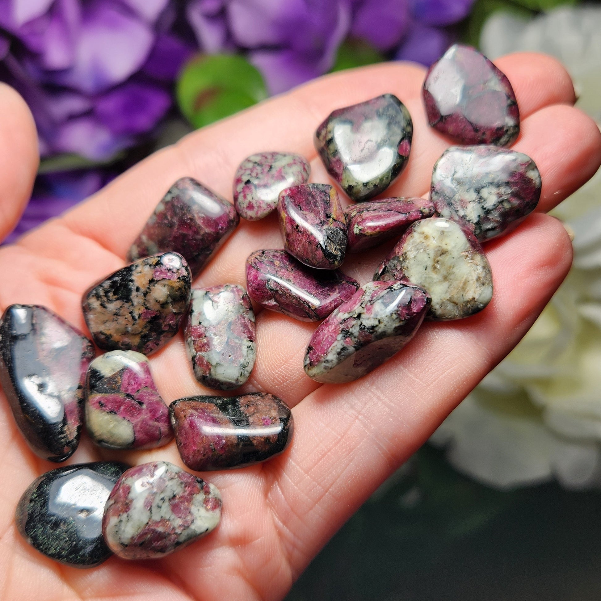 These polished Eudialyte crystals exhibit dark mauve to crimson red color, mottled with black and white. Some of these stones may exhibit a glow when under a backlight - a rare quality in the mineral kingdom. Each specimen measures between 10mm and 15mm.