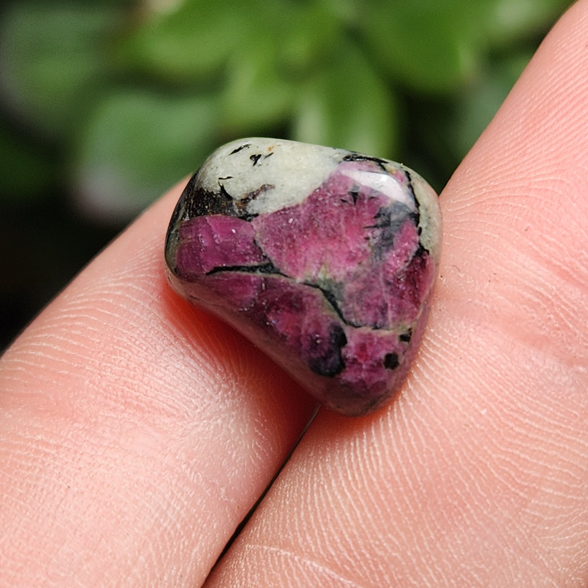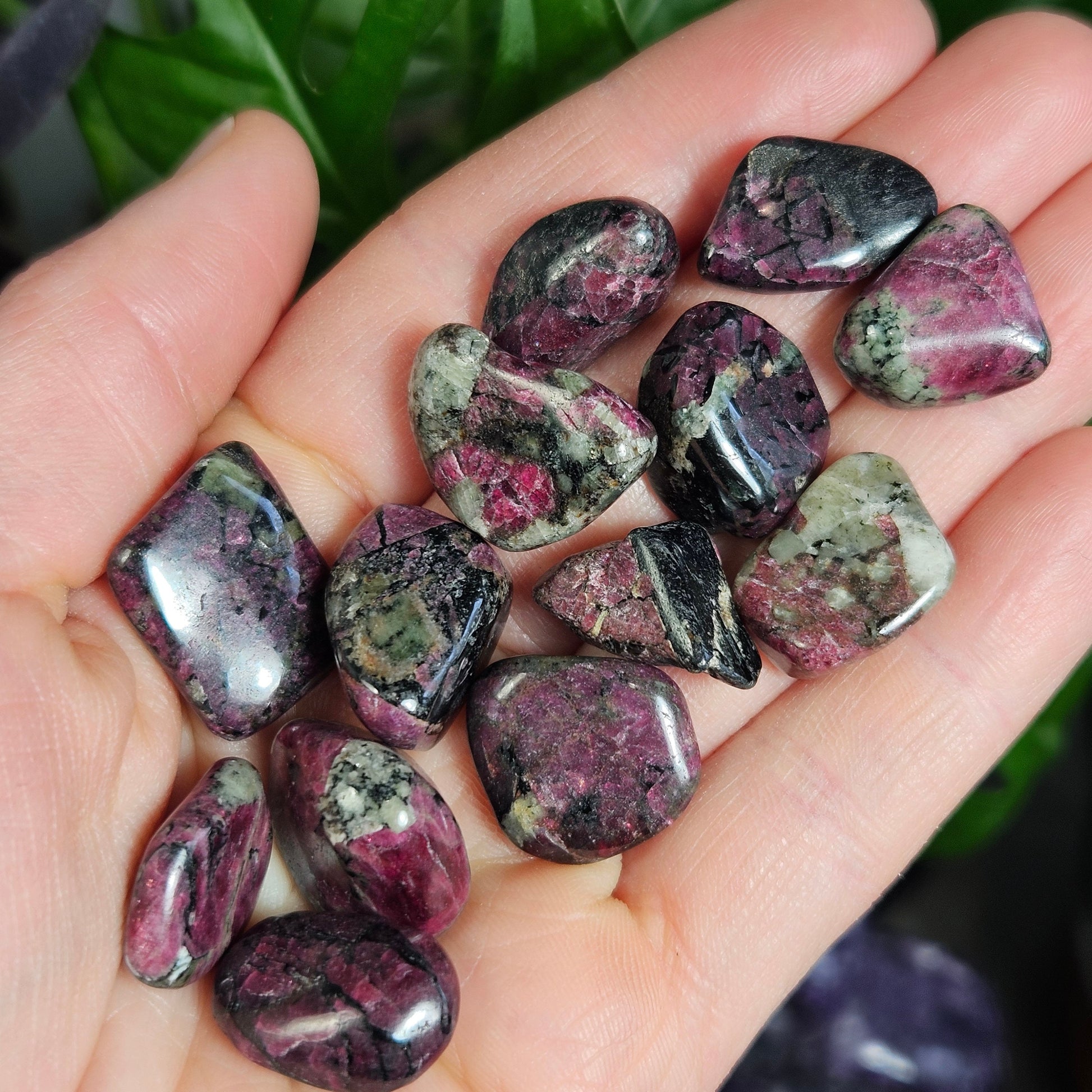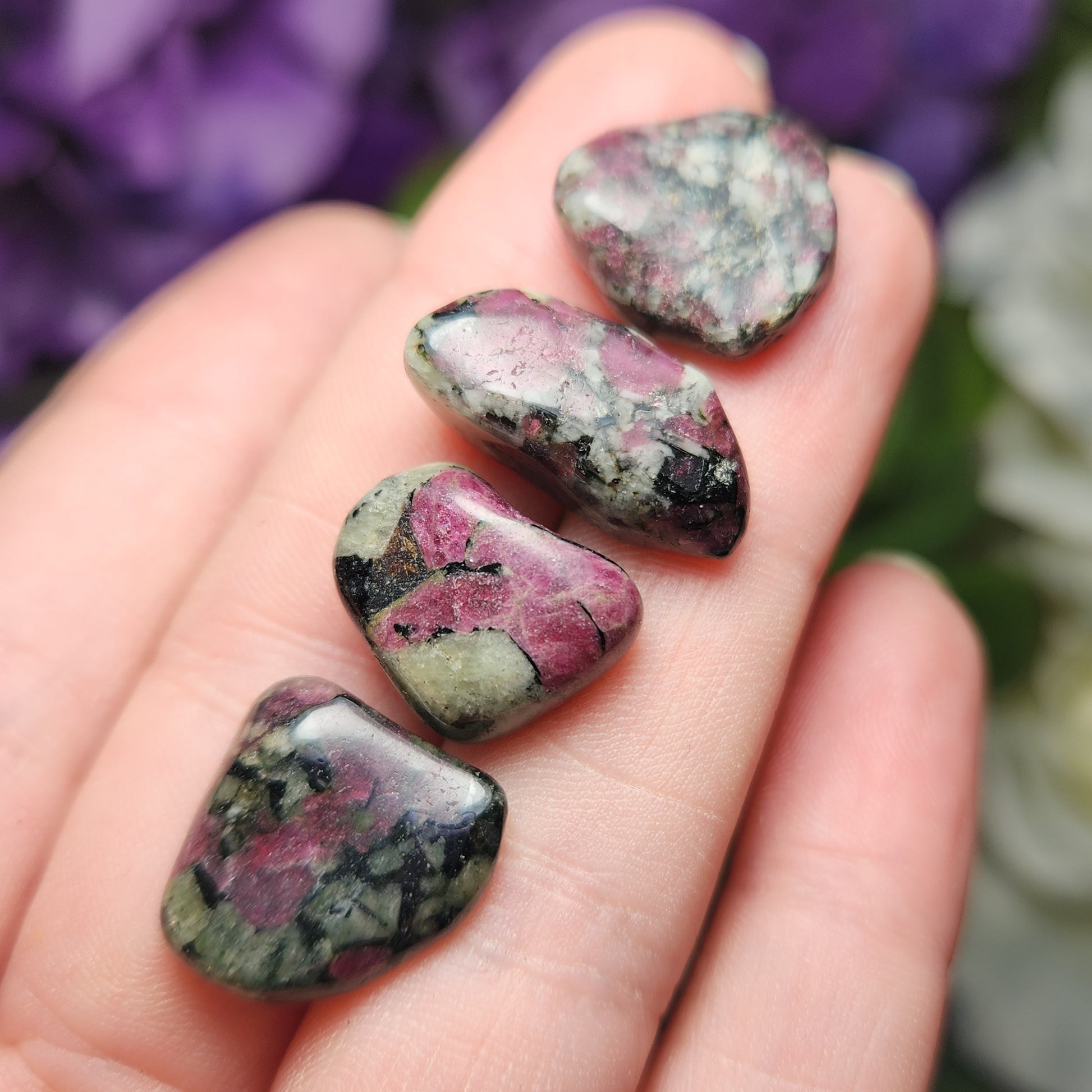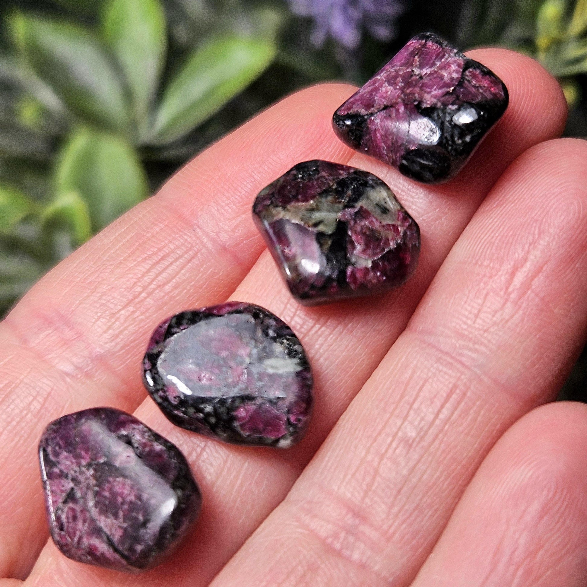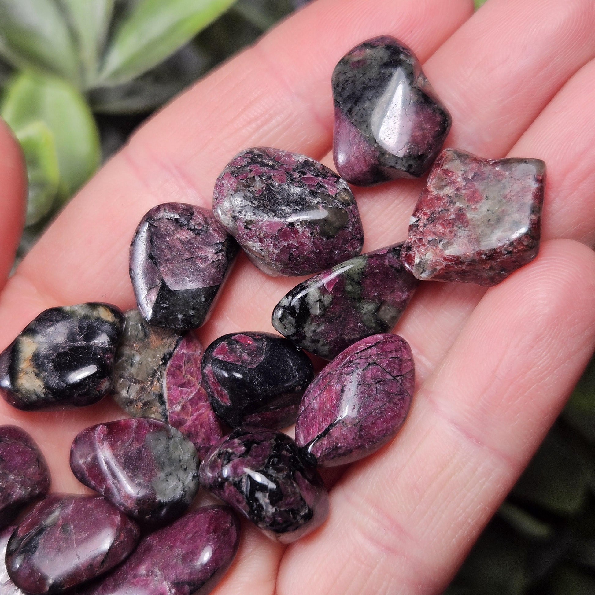 These polished Eudialyte crystals exhibit dark mauve to crimson red color, mottled with black and white. Some of these stones may exhibit a glow when under a backlight - a rare quality in the mineral kingdom. Each specimen measures between 10mm and 15mm.