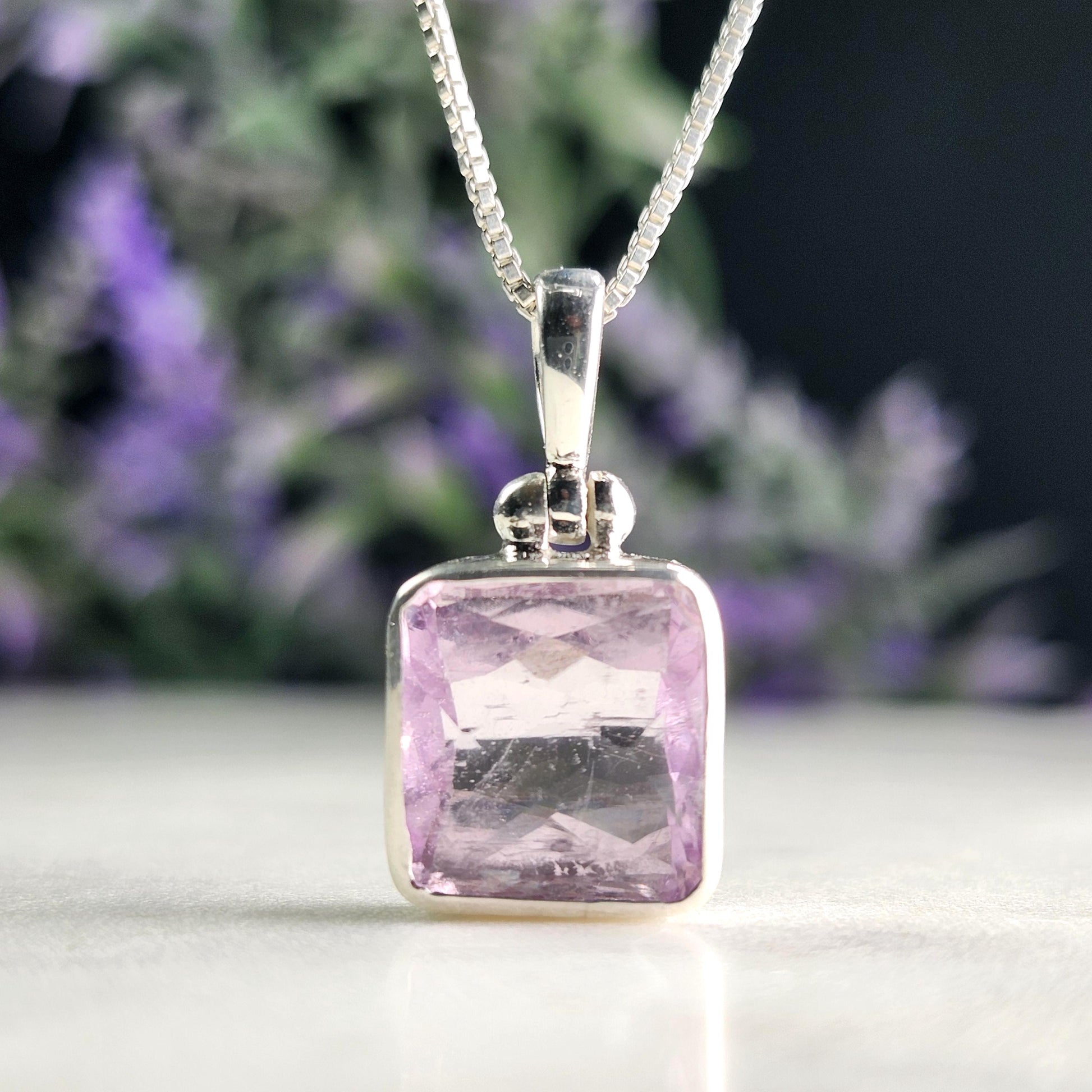 This high-quality, faceted Kunzite gemstone has been cut and polished to enhance its natural beauty. It's pale pink translucence glows as light shines off of its facets. This crystal has been custom created into a sturdy piece of jewelry using .925 Sterling Silver. This pendant measures approximately 22mm by 11mm. The silver chain used in the photos is to help envision how this pendant will look while adorned but is not included in the listing.