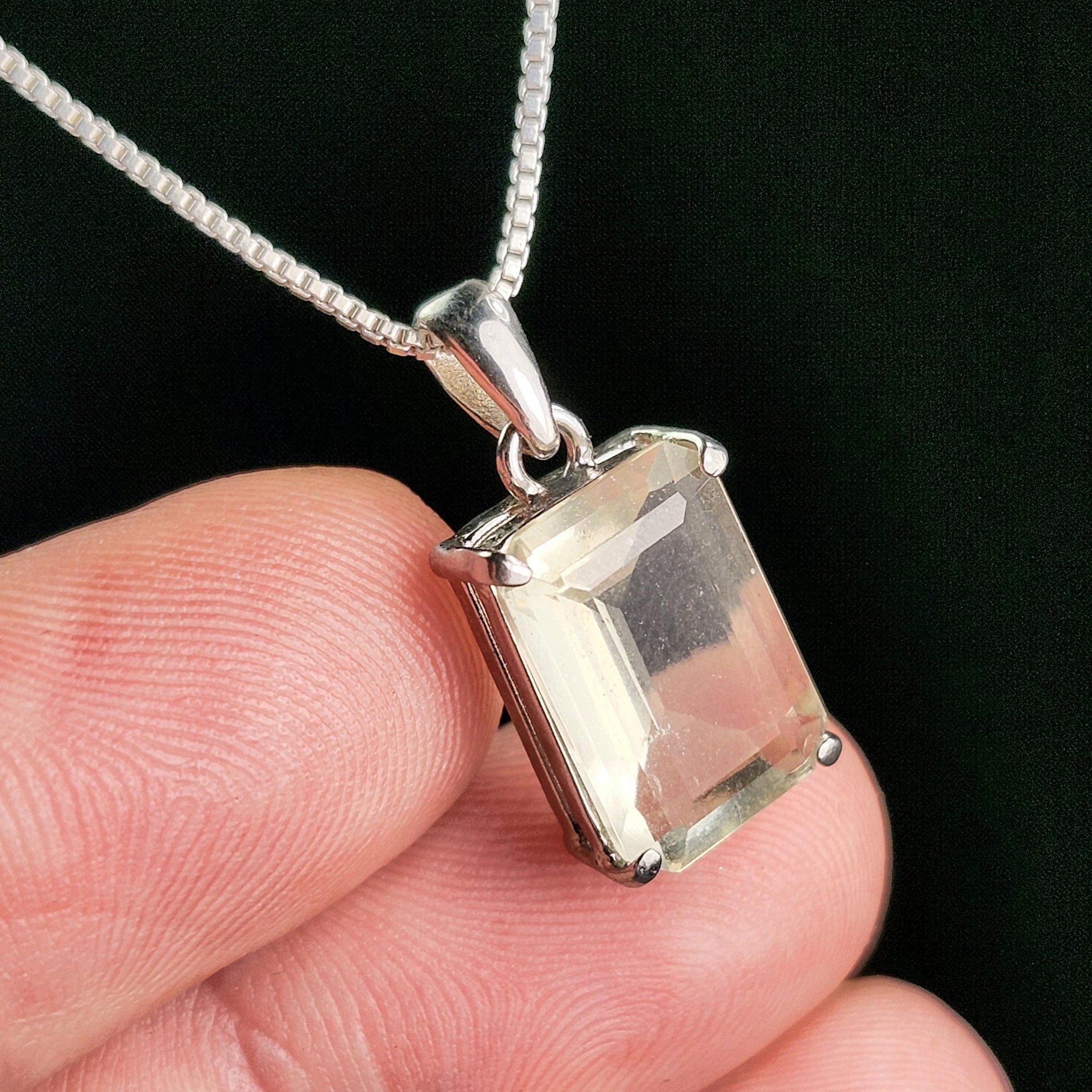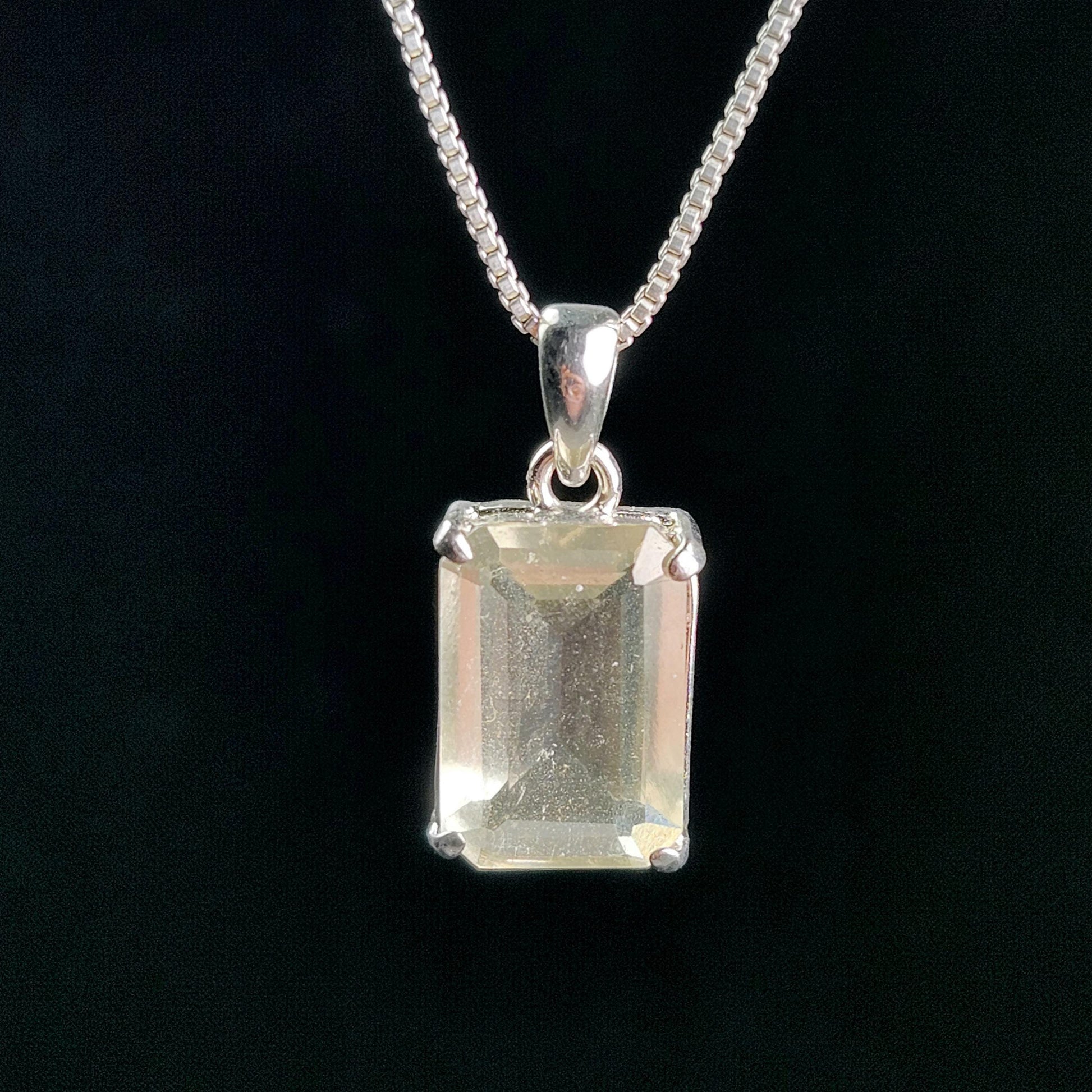 This faceted Libyan Desert Glass displays a pale golden-yellow hue with a gemmy translucence. This tektite has been custom created into a sturdy piece of jewelry using .925 Sterling Silver. This pendant measures approximately 19mm by 9mm. The silver chain used in the photos is to help envision how this pendant will look while adorned but is not included in the listing.