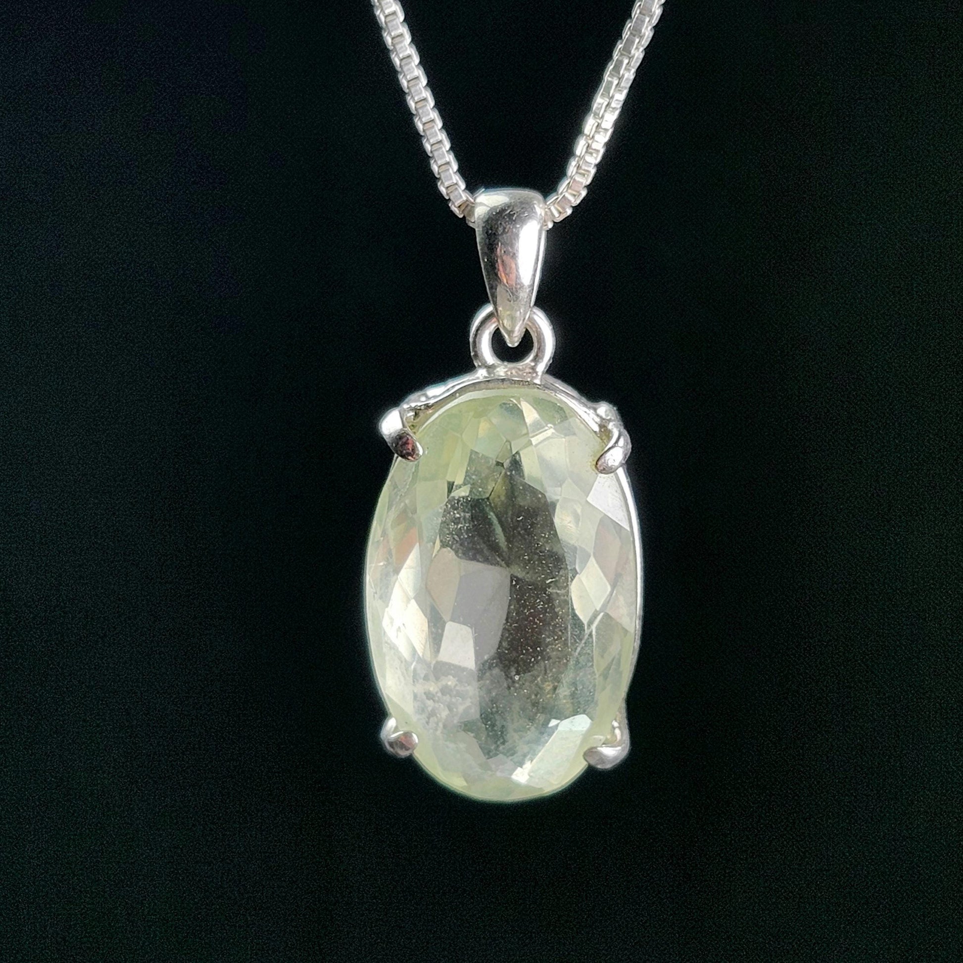 This faceted Libyan Desert Glass displays a pale chartreuse hue with a gemmy translucence. This tektite has been custom created into a sturdy piece of jewelry using .925 Sterling Silver. This pendant measures approximately 24mm by 11mm. The silver chain used in the photos is to help envision how this pendant will look while adorned but is not included in the listing.
