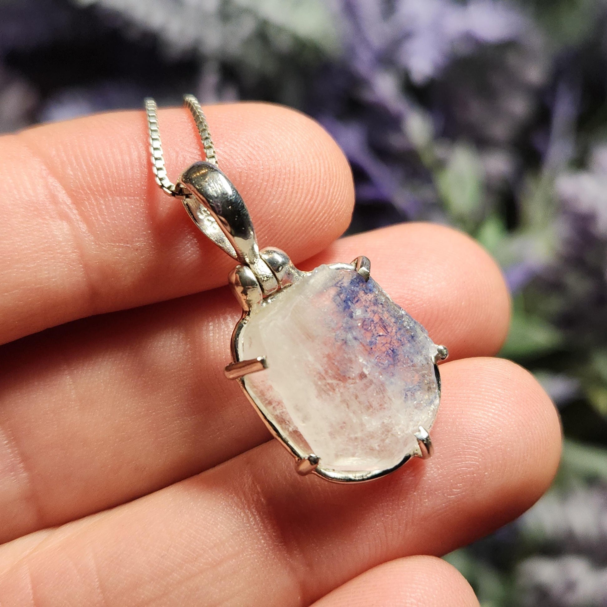 This raw Quartz crystal has a glowing translucence, showing off the fibrous blue wisps of Dumortierite inside. This crystal was hand selected and processed into jewelry using .925 Sterling Silver. This pendant measures approximately 27mm by 15mm. The silver chain used in the photos is to help envision how this pendant will look while adorned but is not included in the listing.