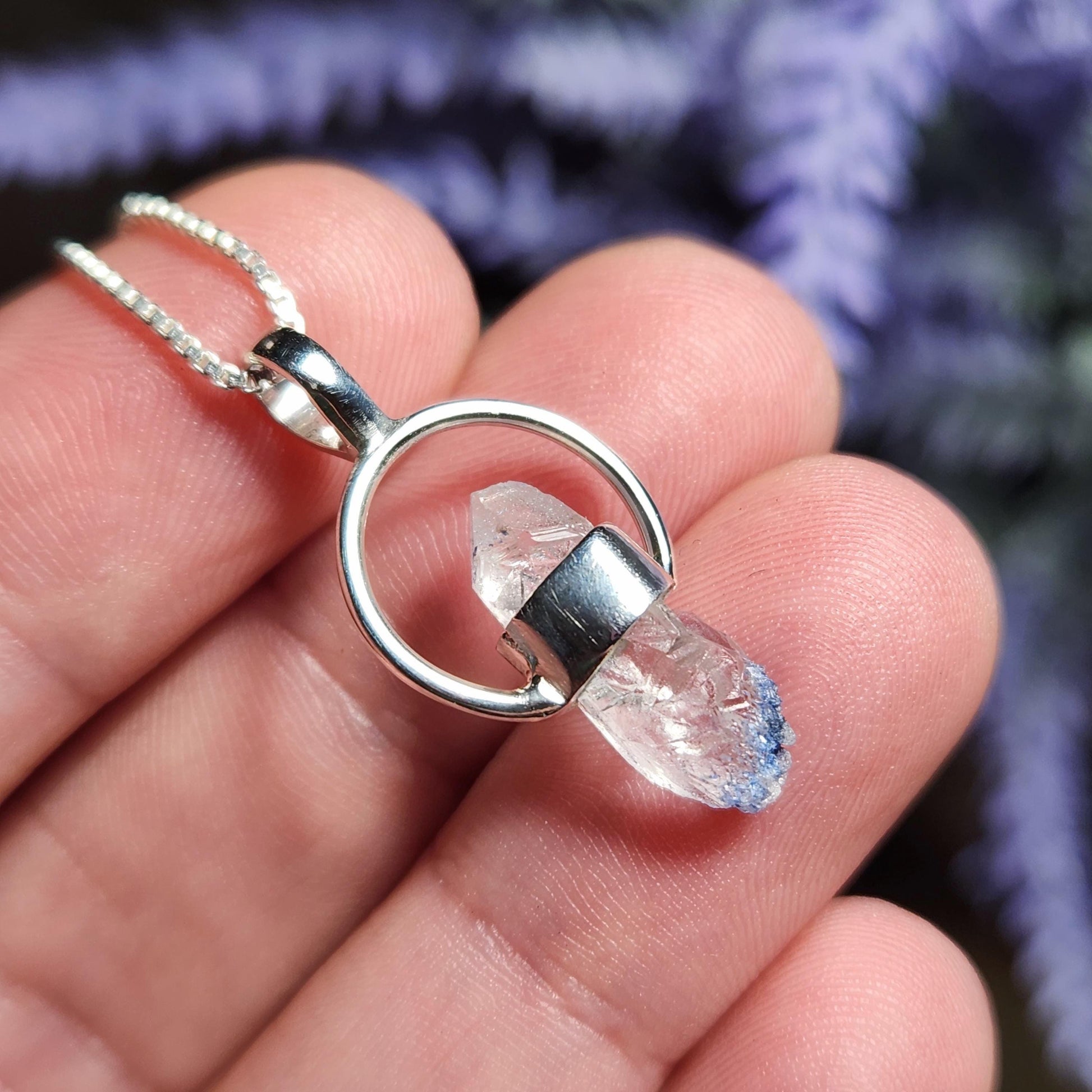This double terminated Quartz crystal has a glowing translucence that highlights the fibrous blue wisps of Dumortierite embedded within its tip. This crystal was hand selected and processed into jewelry using .925 Sterling Silver. This pendant measures approximately 25mm by 12mm. The silver chain used in the photos is to help envision how this pendant will look while adorned but is not included in the listing.