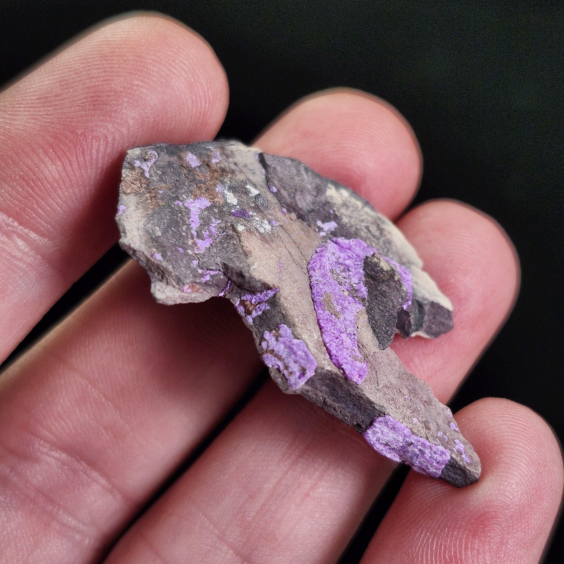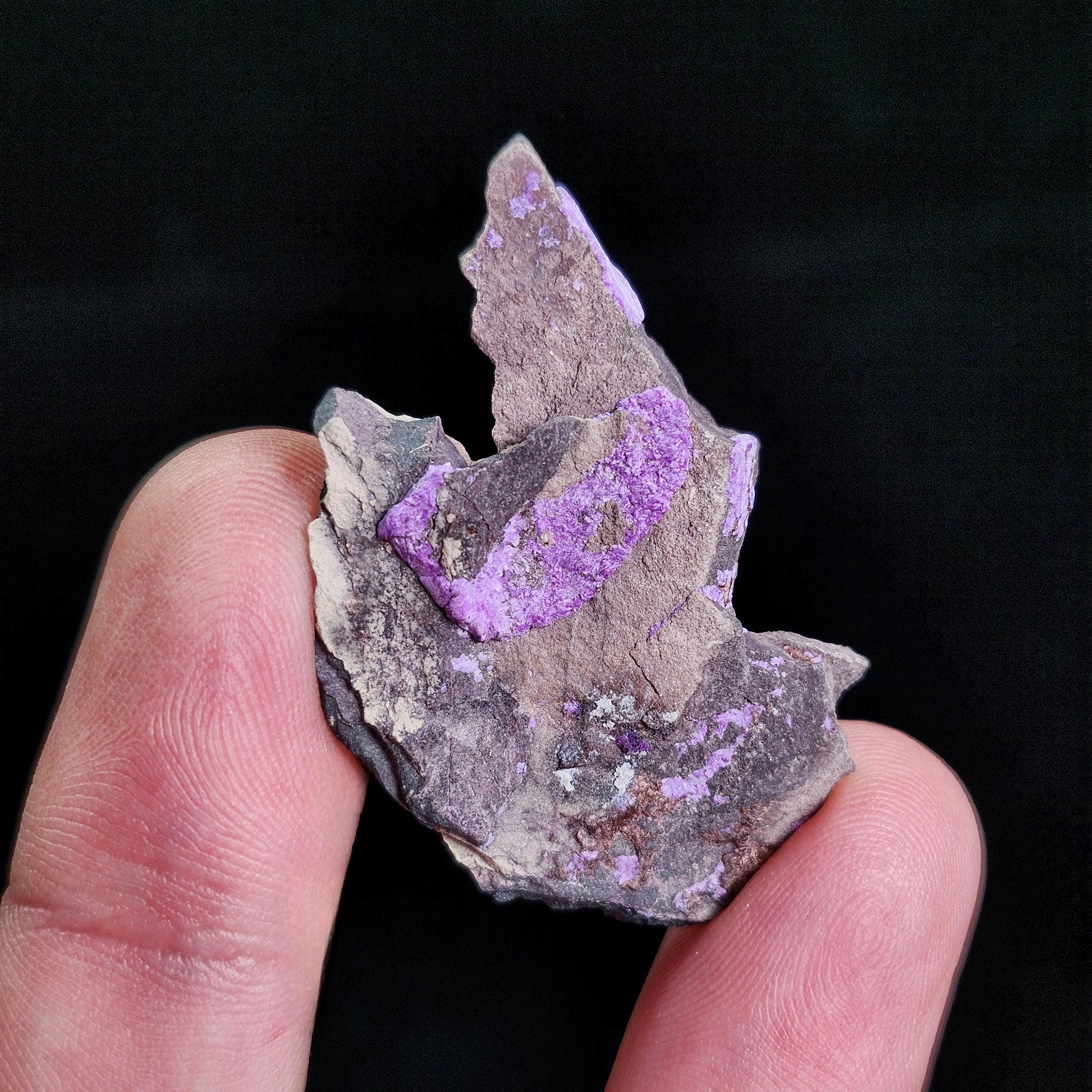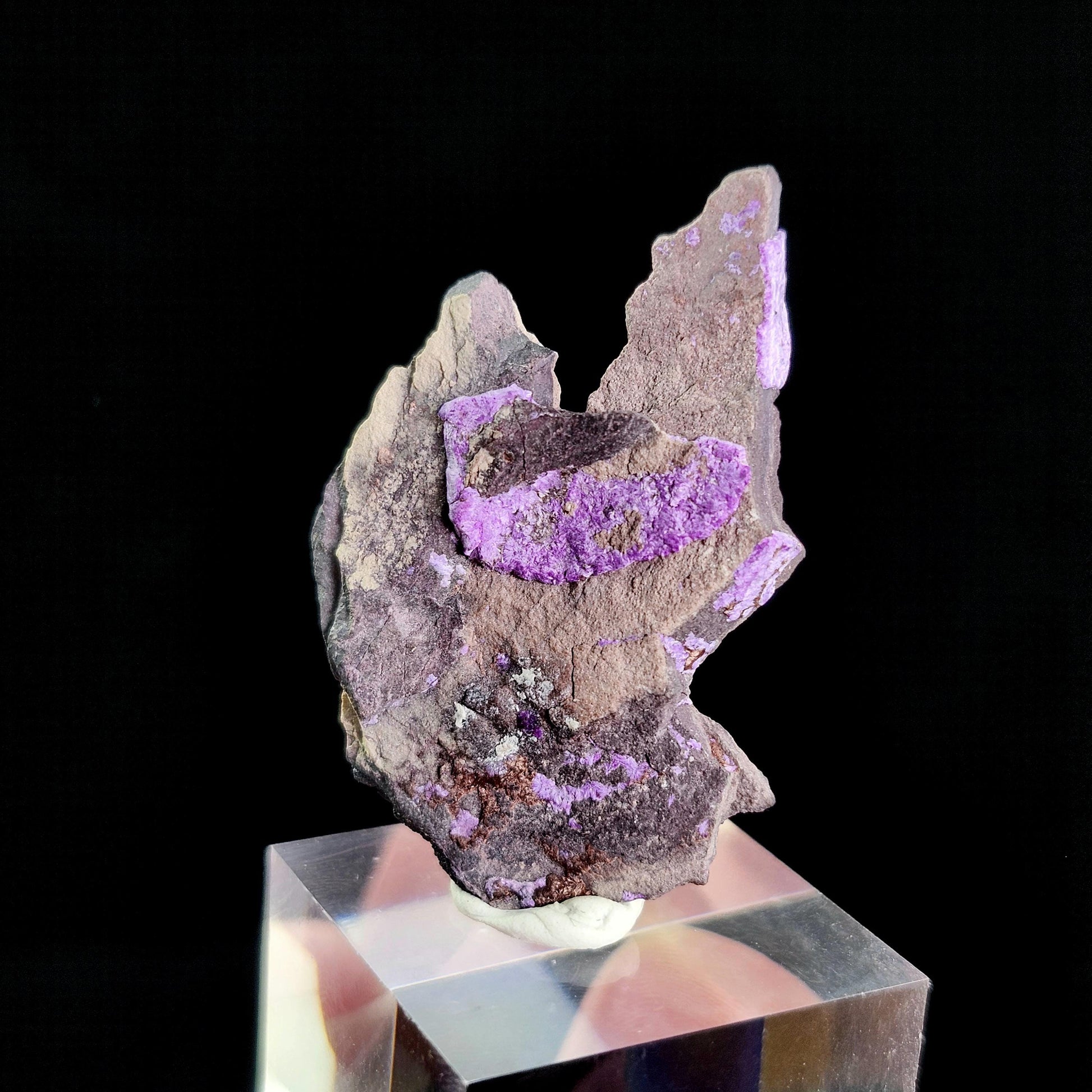 This specimen exhibits Fibrous Sugilite with bright purple coloring contrasted by the brown and grey matrix that it sits within. This specimen measures approximately 38mm by 22mm by 3mm and weighs 6 grams.