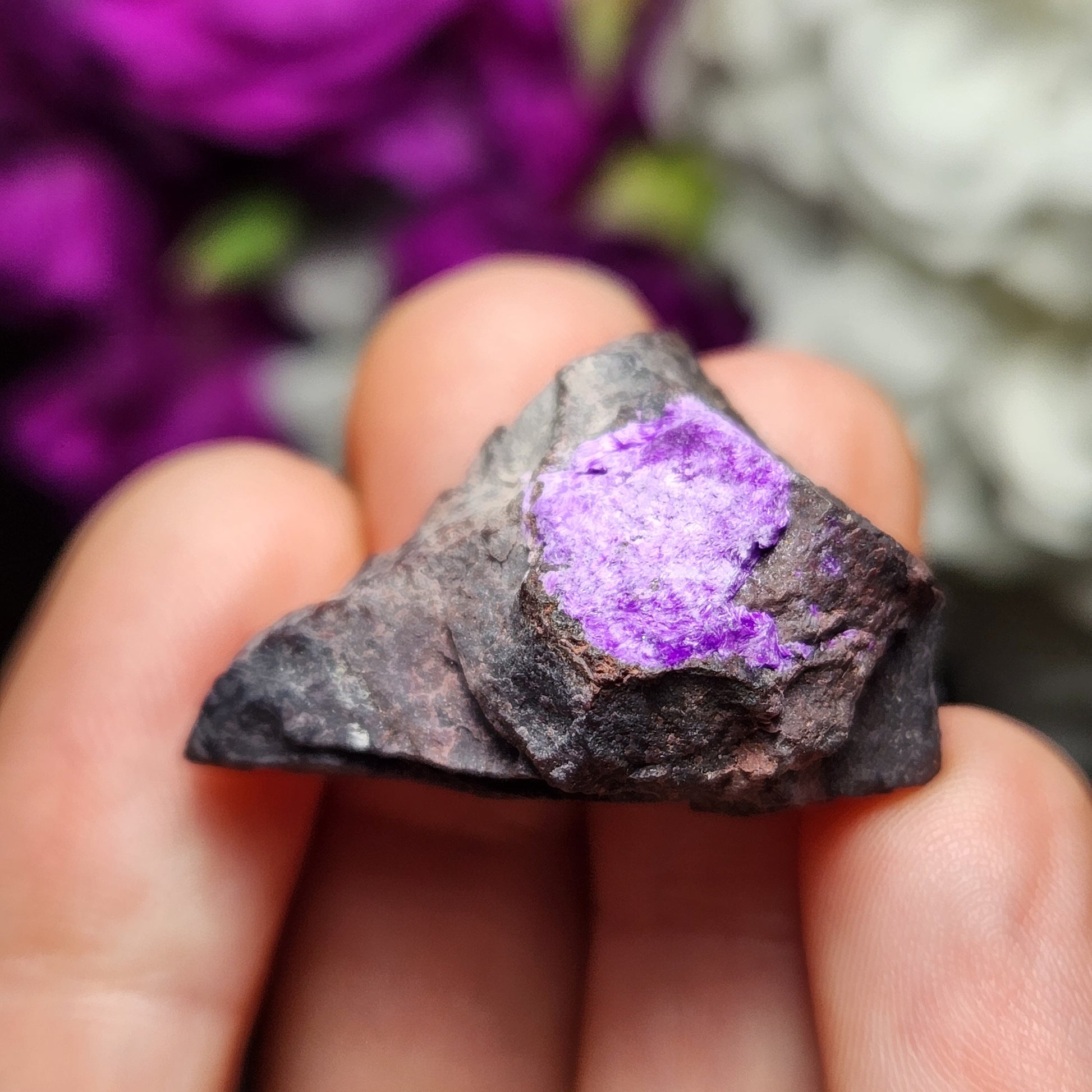 This specimen exhibits Fibrous Sugilite with bright purple coloring. The Sugilite has an incredible, natural shimmer and is contrasted by the matte, grey matrix that it sits within. This specimen measures approximately 30mm by 20mm and weighs 10.3 grams.