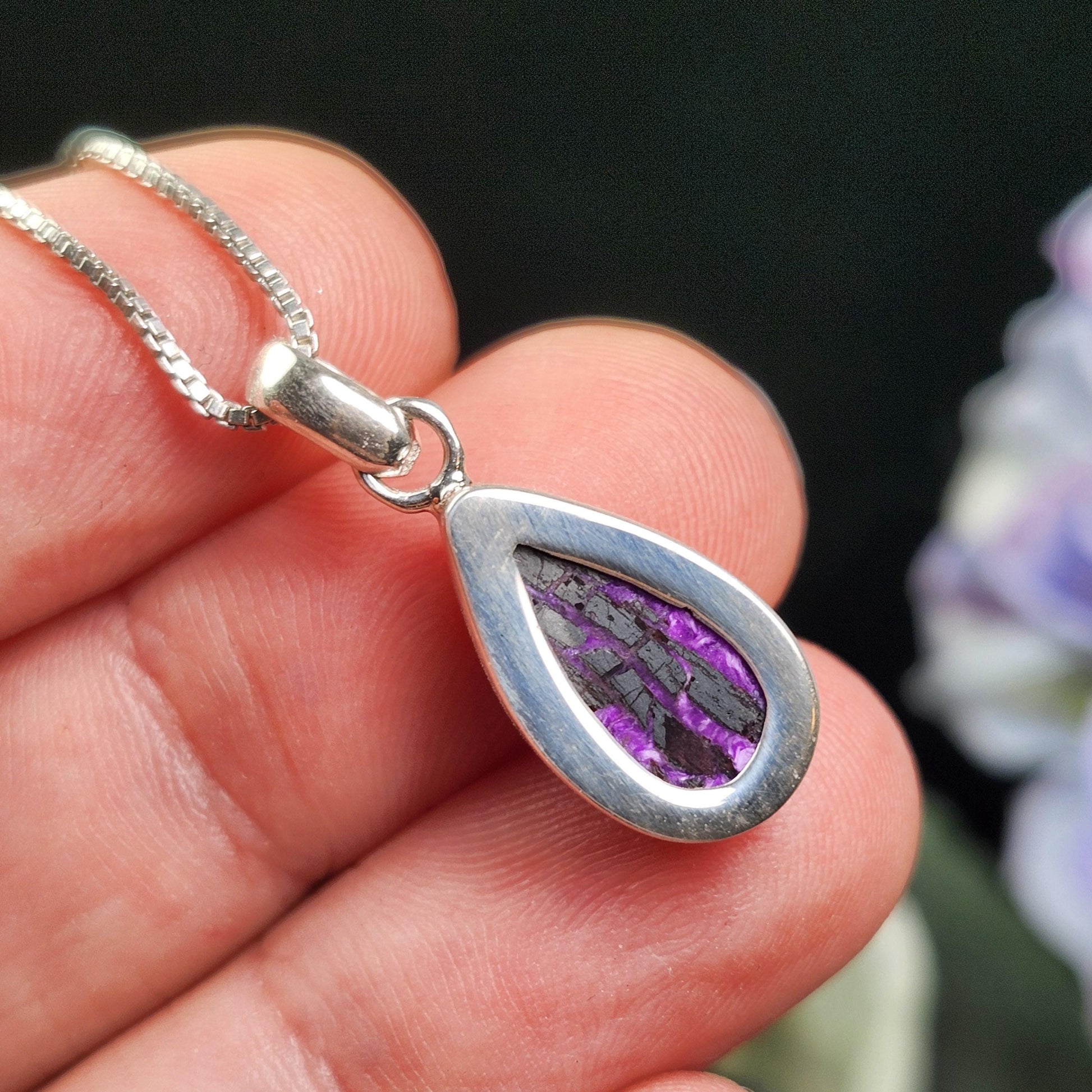 This Fibrous Sugilite stone has a smooth polish and exhibits saturated, bright purple coloring with shining silver inclusions. This crystal has been custom created into a sturdy piece of jewelry using .925 Sterling Silver. This pendant measures approximately 22mm by 9mm. The silver chain used in the photos is to help envision how this pendant will look while adorned but is not included in the listing.