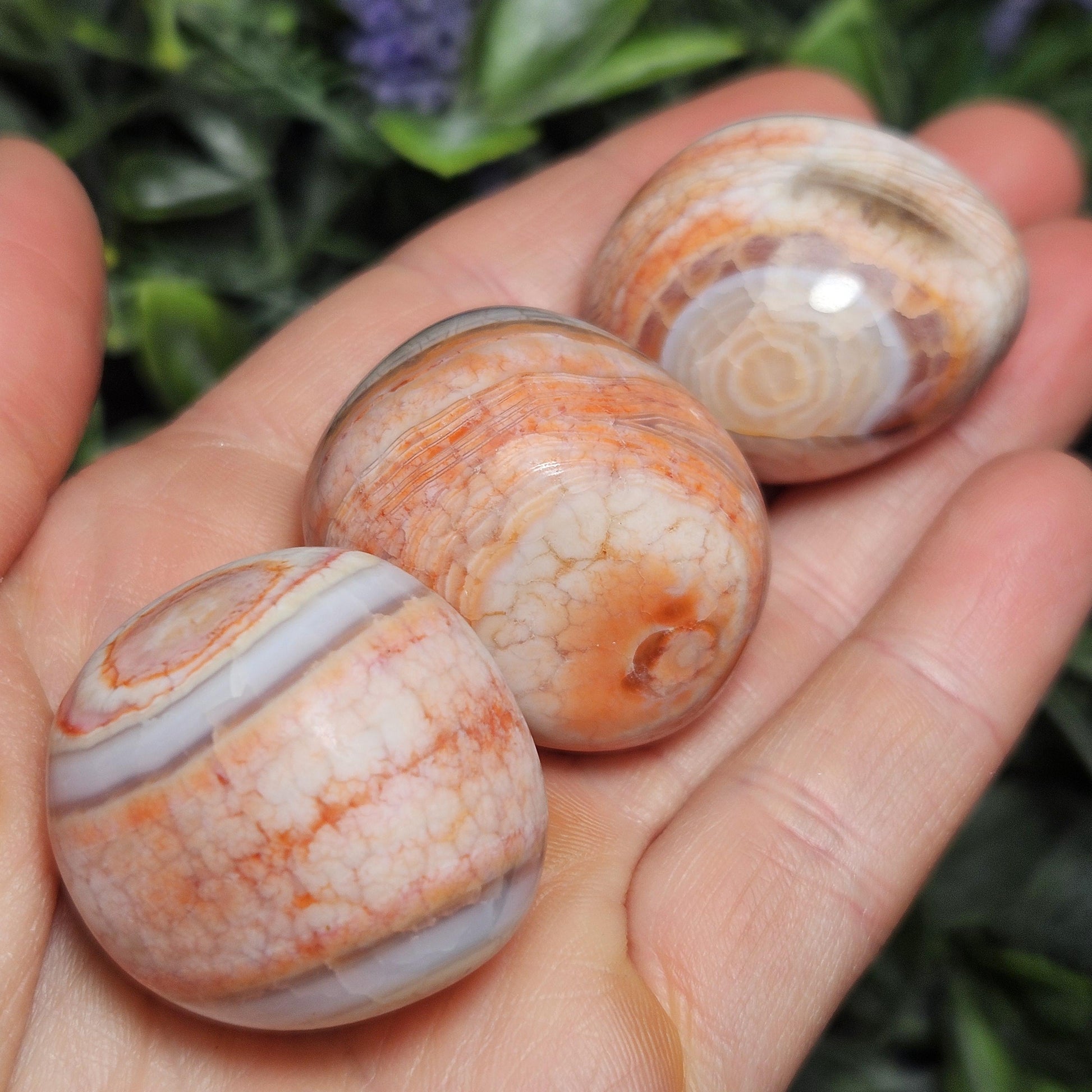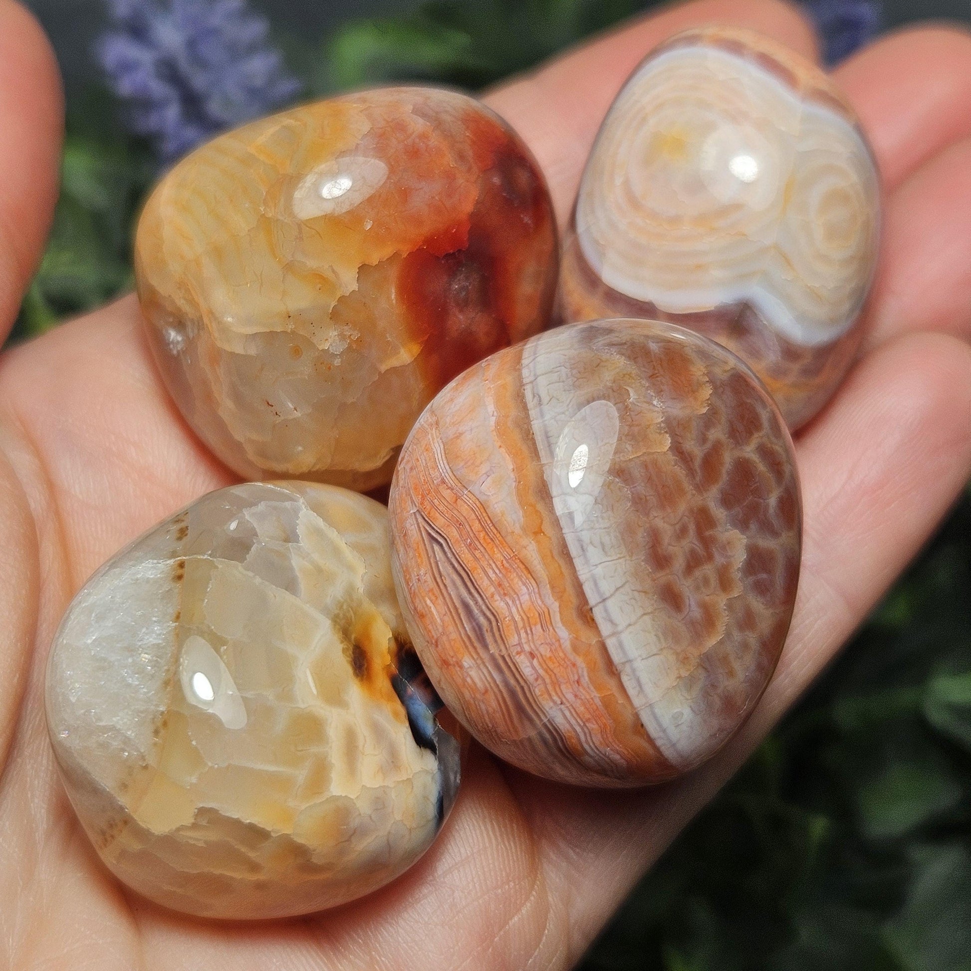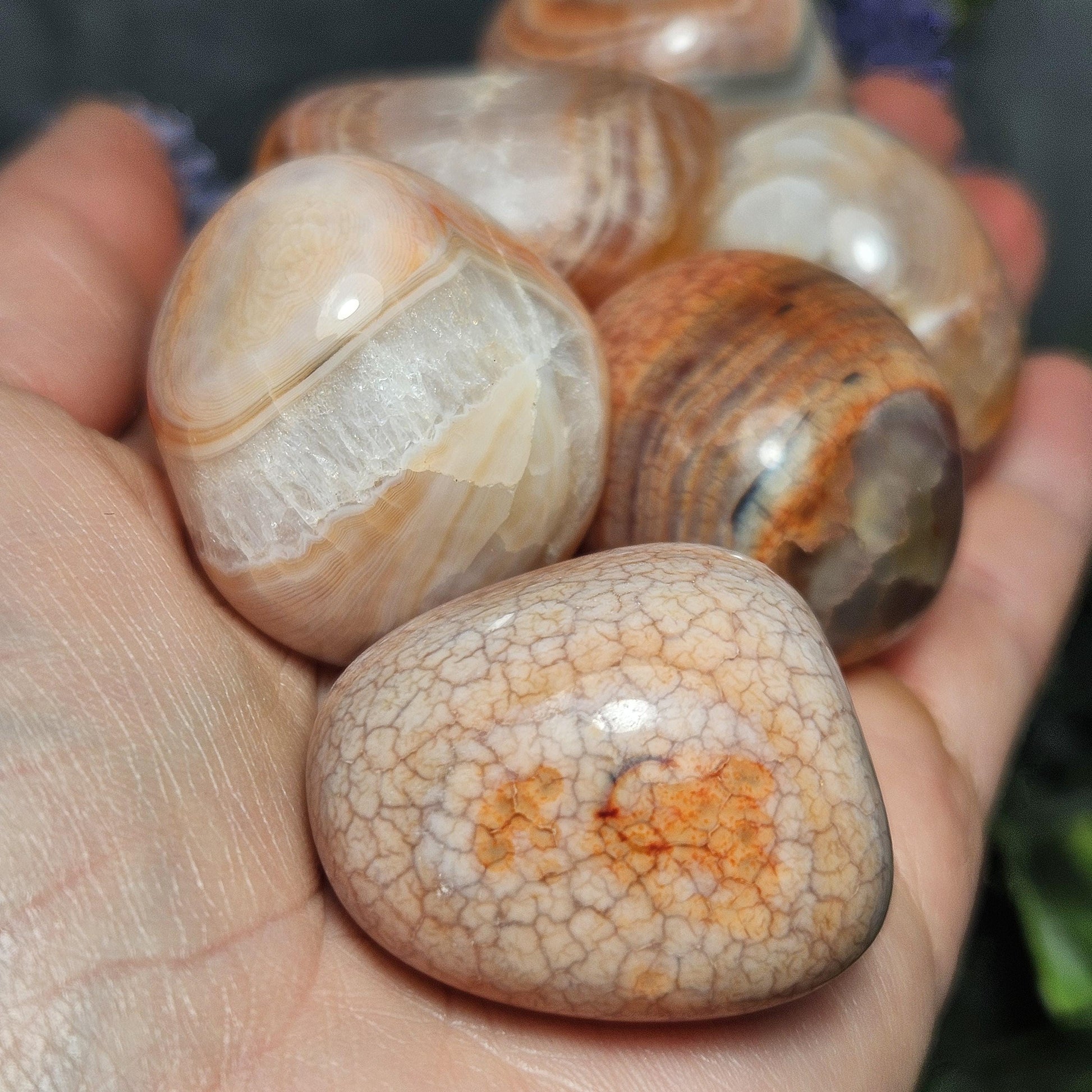 These Snakeskin Agate crystals from Brazil are large with rounded shapes and have been tumbled to a high sheen. They each show off the unique crackled markings that this material is known for, with a range of translucent to matte finishes and a wide array of color inclusions.