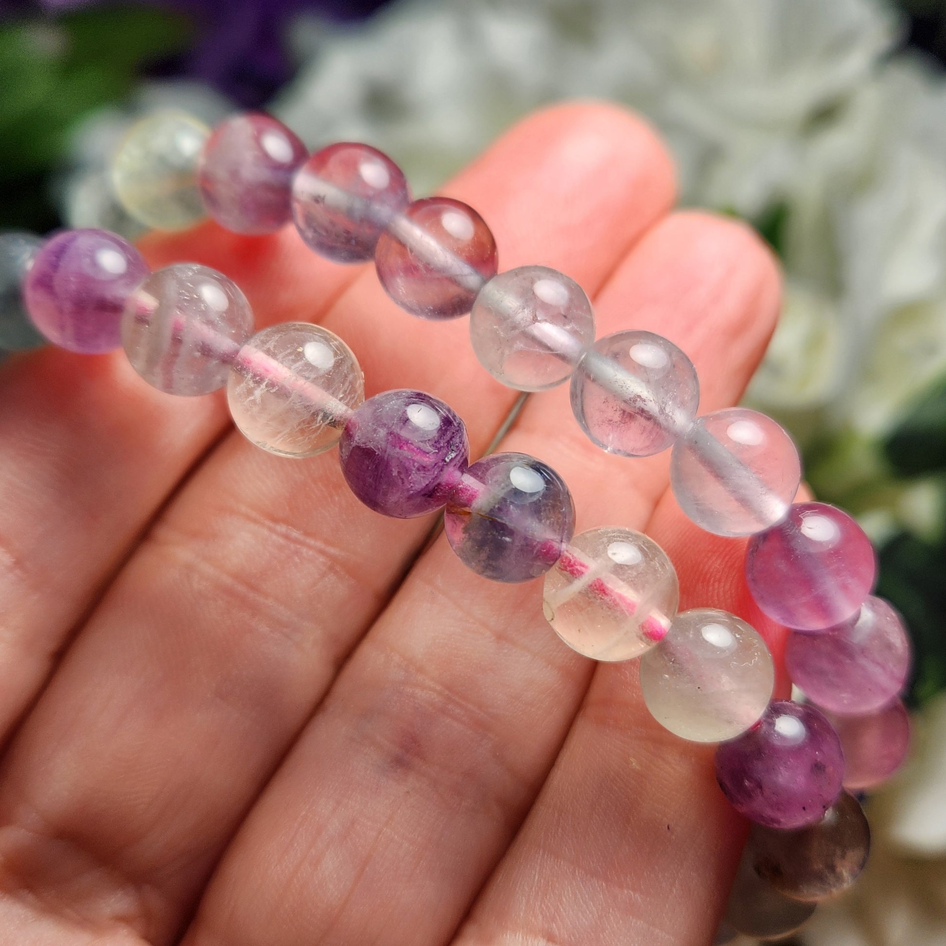 These Fluorite stretch bracelets are created with 8mm beads that have been polished to a high sheen. Each bracelet measures approximately 7 inches.