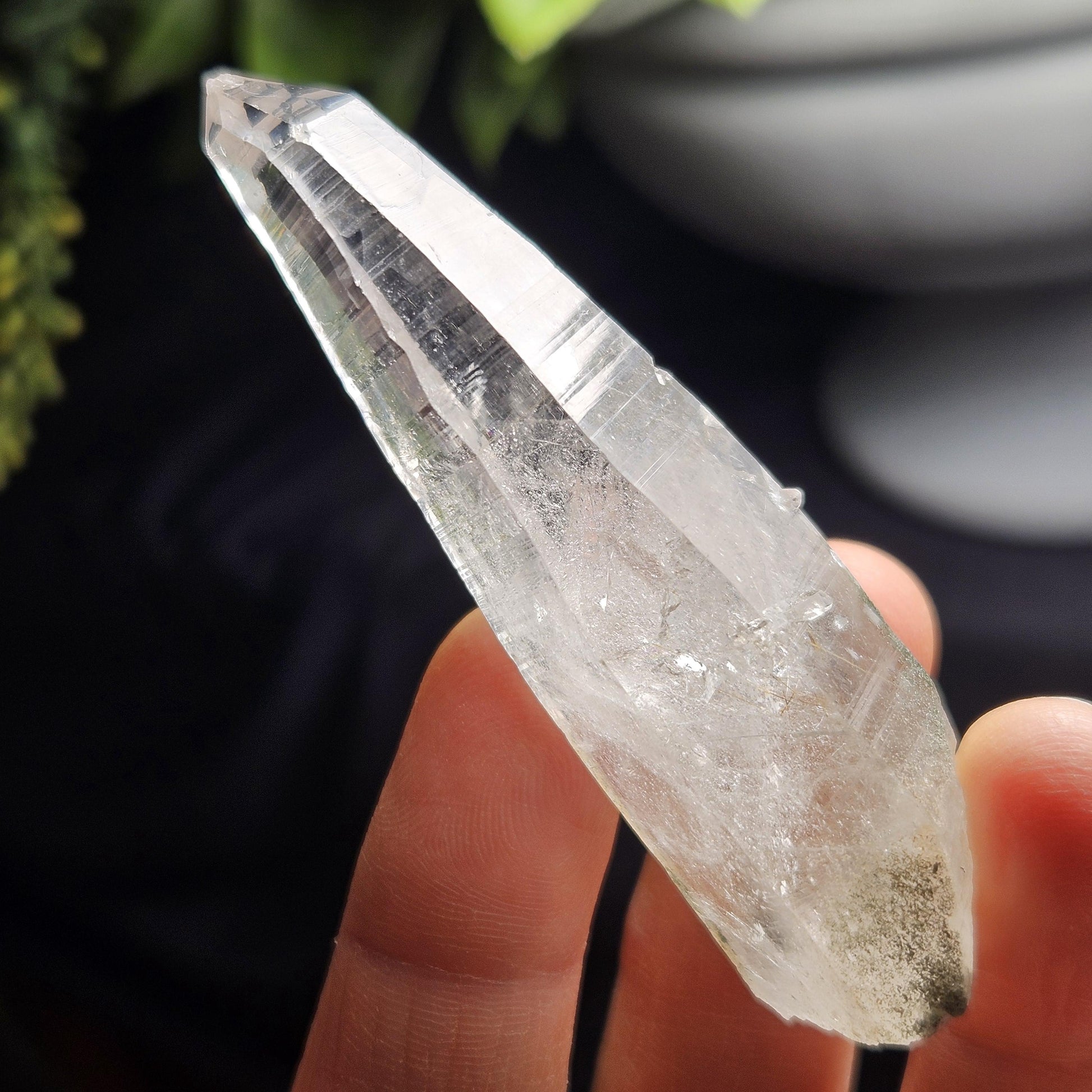 This crystal clear Himalayan Quartz crystal is from Ganesh Himāl, a region in the Himalayan Mountain range near the border of Tibet and Nepal. This area is inaccessible for machinery or equipment - due to this, miners travel through the difficult terrain without large tools and hand mine each crystal from the Earth. This crystal has a glowing quality, with a terminated point with slight damage to it. The remainder of the specimen is in perfect condition with crisp facets, a distinct prase shaped termination, and "barcode" striations often seen in Lemurian Seed crystals. It also includes hints of green Chlorite phantom inclusions at the base. This unique crystal measures 70mm by 20mm by 20mm and weighs 34.79 grams.