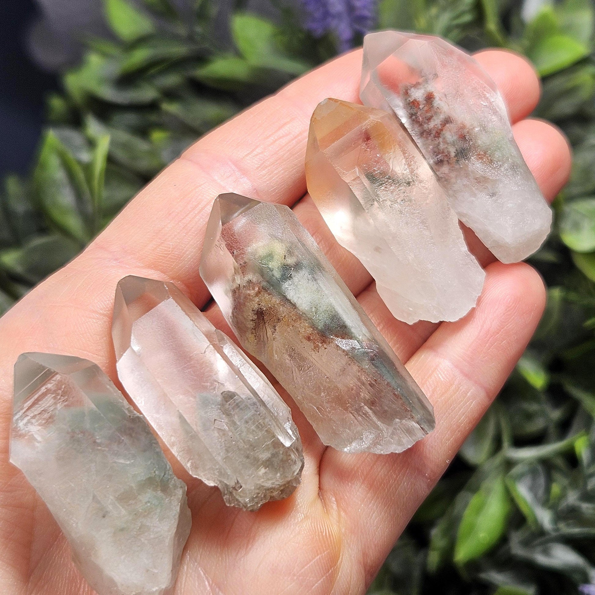 This newer (2025) find is from the Alegre, Bahia region of Brazil - a lesser known area for Lemurian Seed crystals, exhibits distinct phantom inclusions within frosted Lemurian Seed Quartz. Most of these specimens have evidence of "barcode" inclusions - the horizontal striping classic to Lemurians, but even the smoother crystals have a soft frosted surface that is clearly evident of what is considered Lemurian quality. I really like these specimens; they are a very sweet energy - and some even have a pink or peach colored hue to them. Each crystal has inclusions of either green Chlorite, red Hematite, white Lodolite - or a combination of the three. These crystals are in their raw freeform and each have their own unique look, exhibiting a variety of mineral inclusions of different earthy tones. Some abrasions are possible from the mining process, with possible fractures and many areas of self-healed growth.