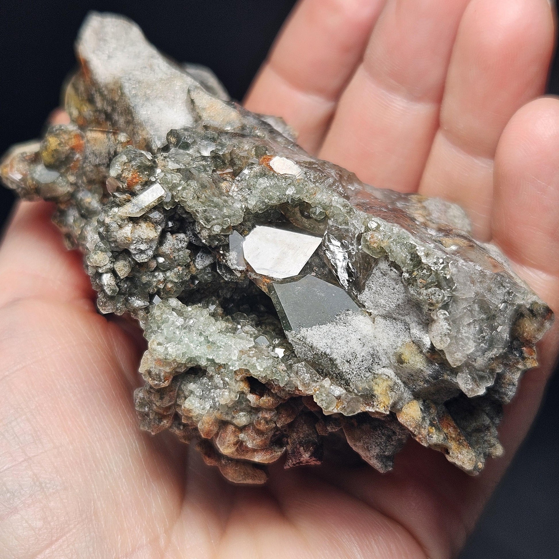This chunky Garden Quartz, also known as Lodolite, has a smoky coloring with sparkling multi terminated points surrounding it. There are small red tinged Hematite pyramidal crystal inclusions throughout this specimen. This unique specimen measures approximately 89mm by 52mm by 40mm and weighs 196 grams.