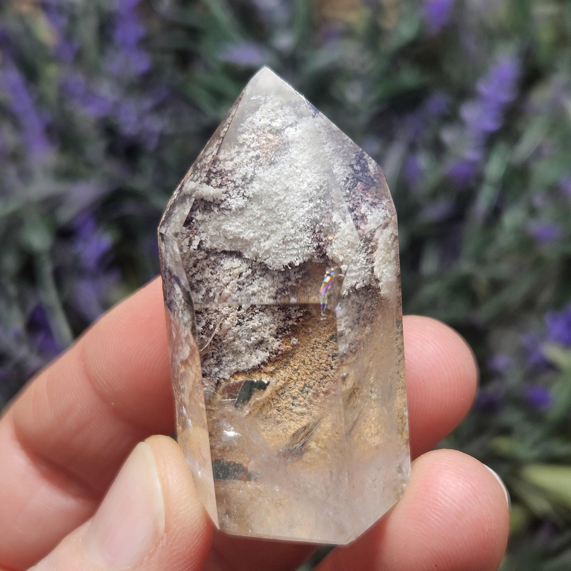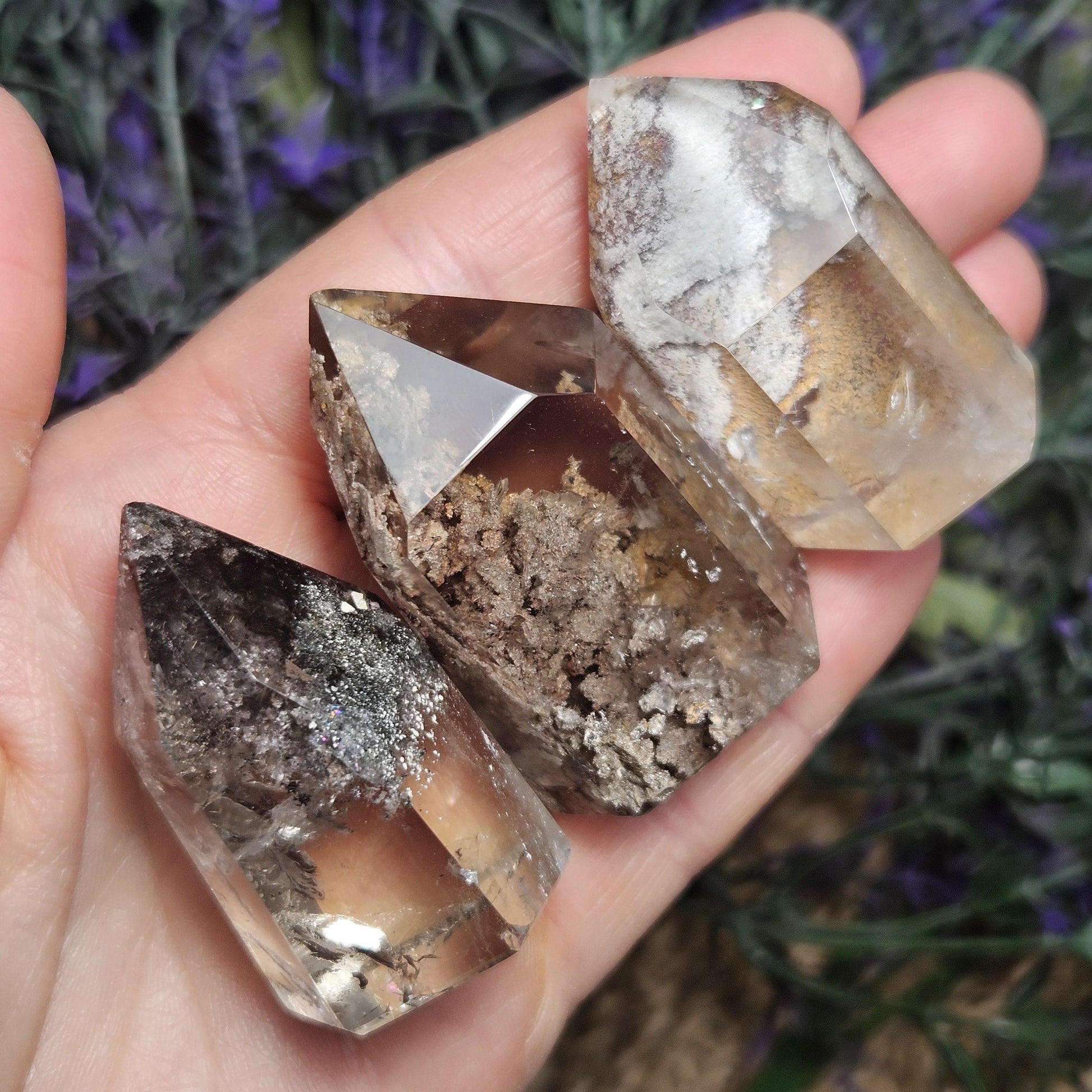 These Garden Quartz, also known as Lodolite, have a clear translucence, showcasing the scenic inclusions within. These crystals have been carved and polished into freeform shaped points and each have their own unique look, exhibiting a variety of mineral inclusions of different earthy tones. Each specimen measures between 1 and 2.5 inches in height. Choose the weight you prefer!